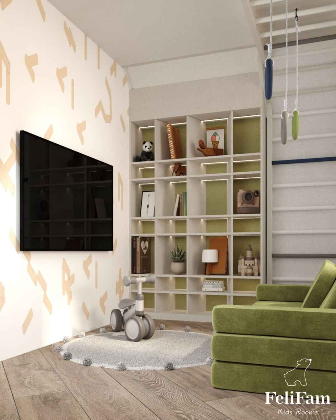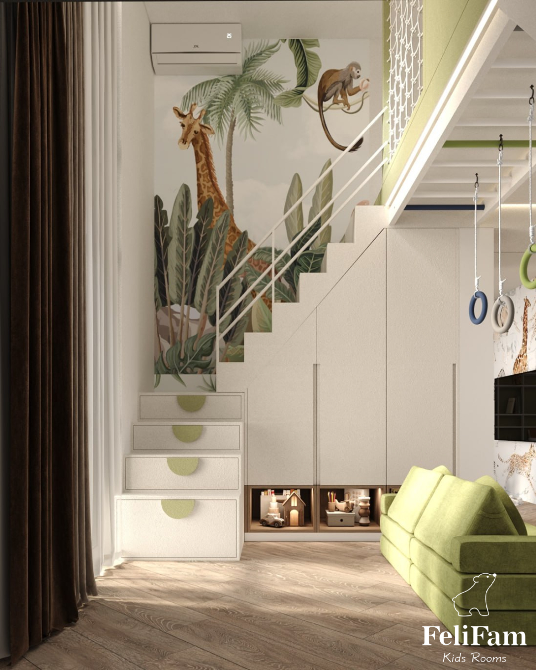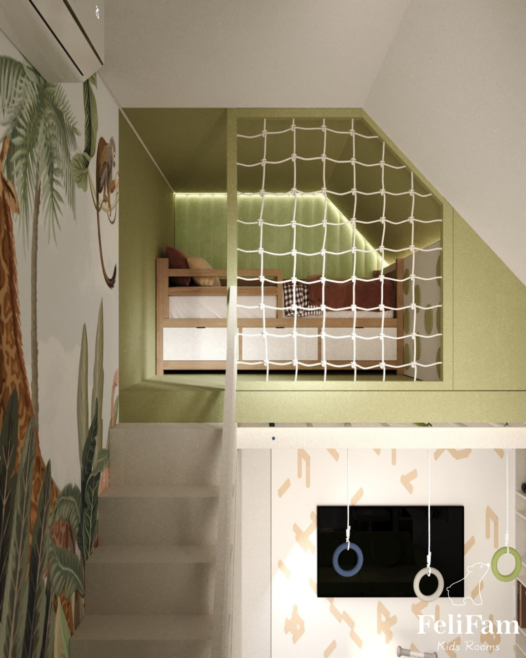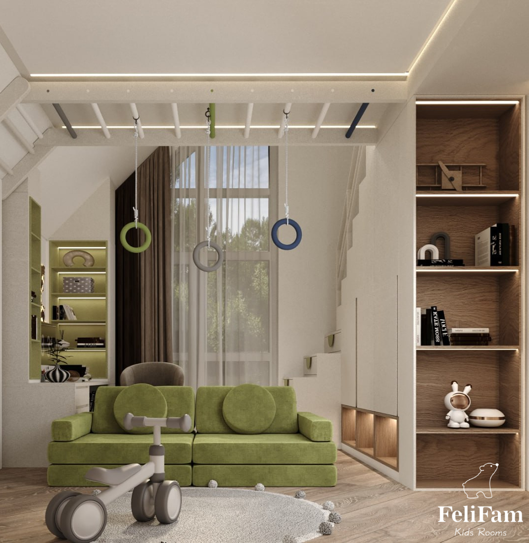 Take a look at this little boy’s nursery! It is designed for comfort, filled with light and energy. The accent green color helps to concentrate and have fun. We also added a second floor – a space for sleeping and relaxing.
