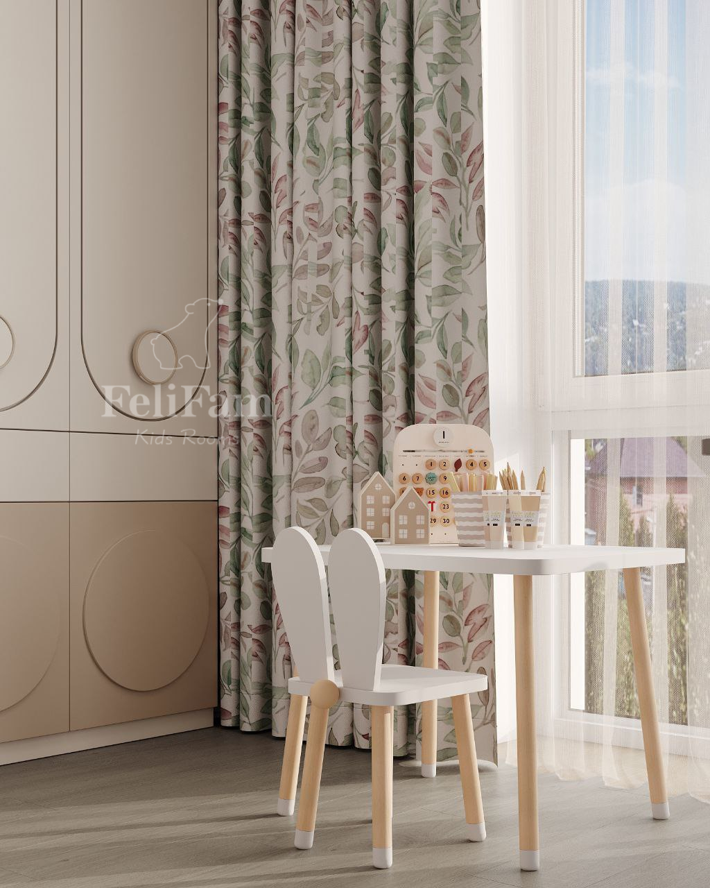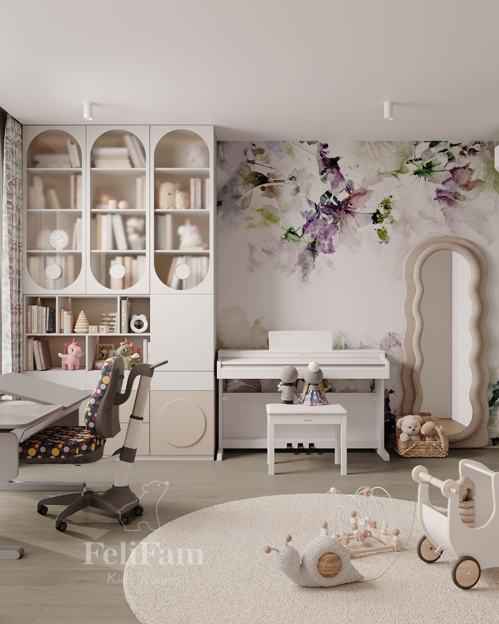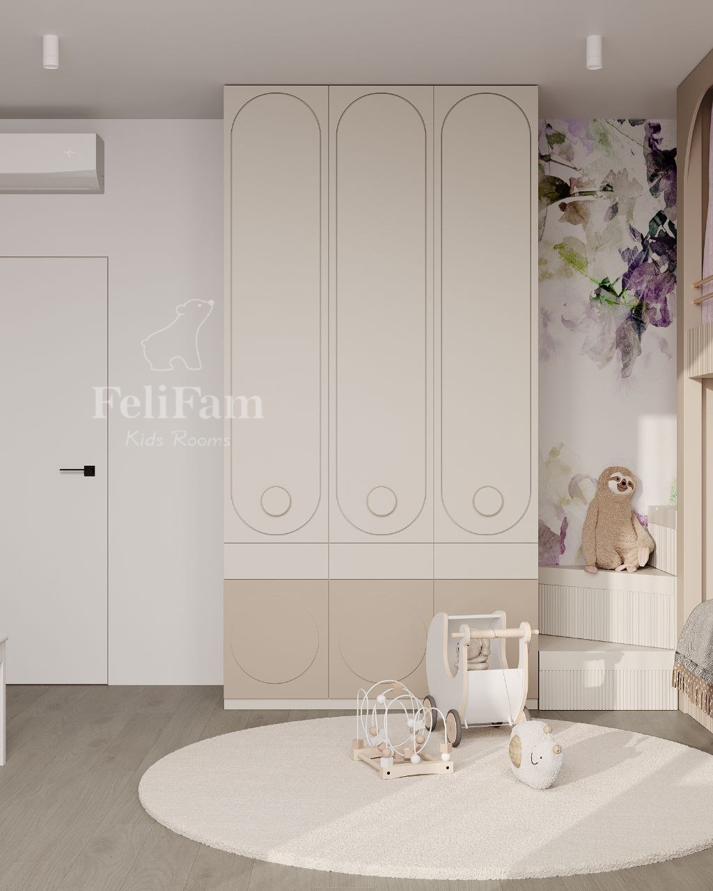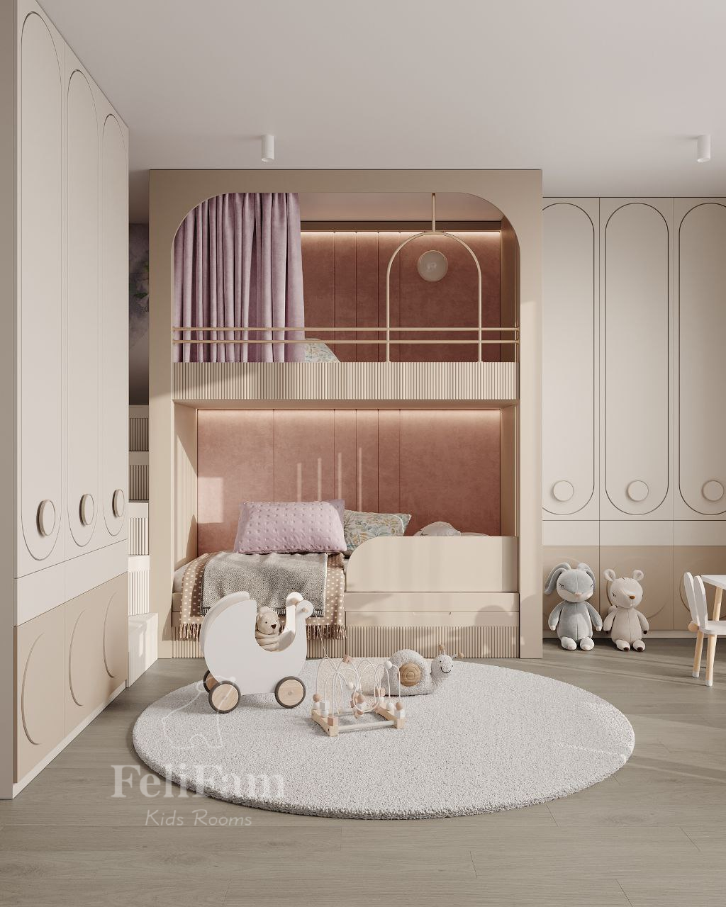 Take a look at this magical room for two sisters! It has everything you need for a comfortable sleep – comfortable beds and their own wardrobes for each little princess. We also created a study space where the girls can improve their knowledge. We did not forget about creativity – there is always a place for inspiration.