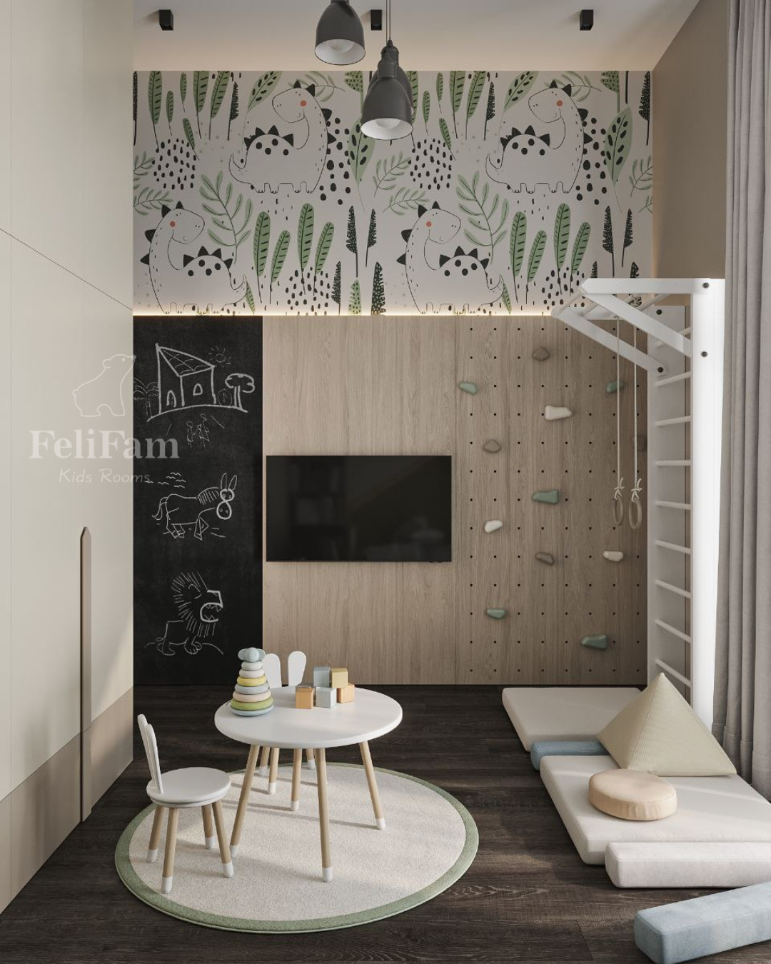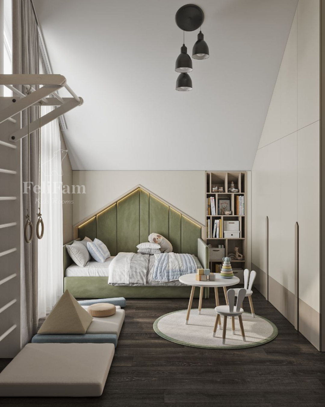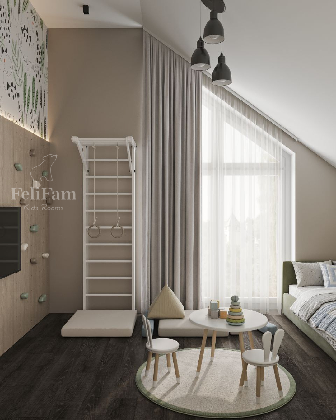 The space is divided into two parts – a sports/play area and a sleep/rest area. We used natural colors to create a calm and cozy atmosphere.