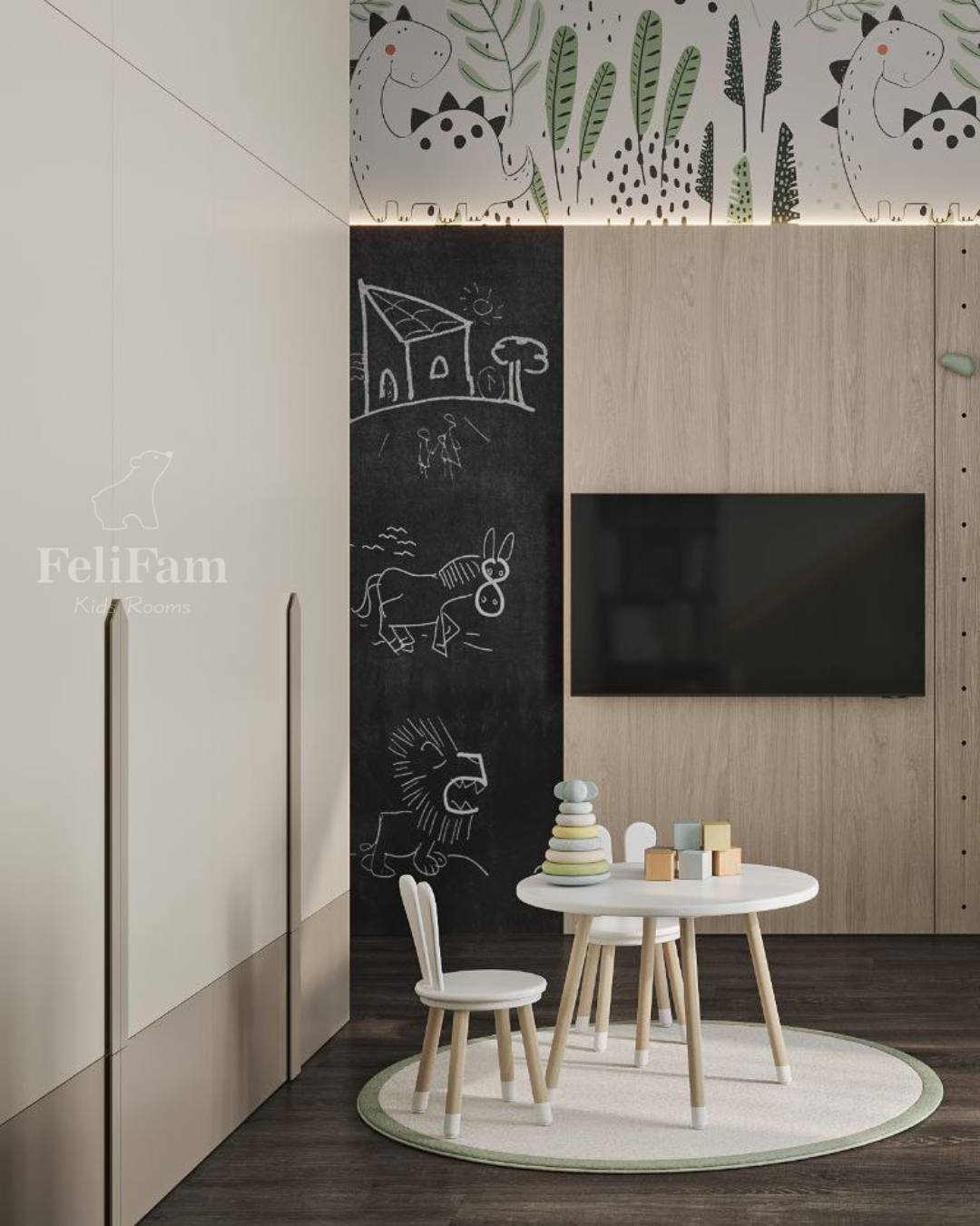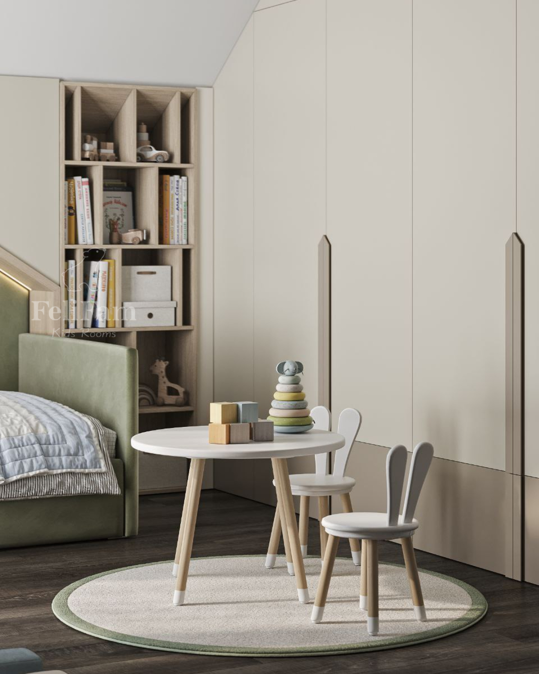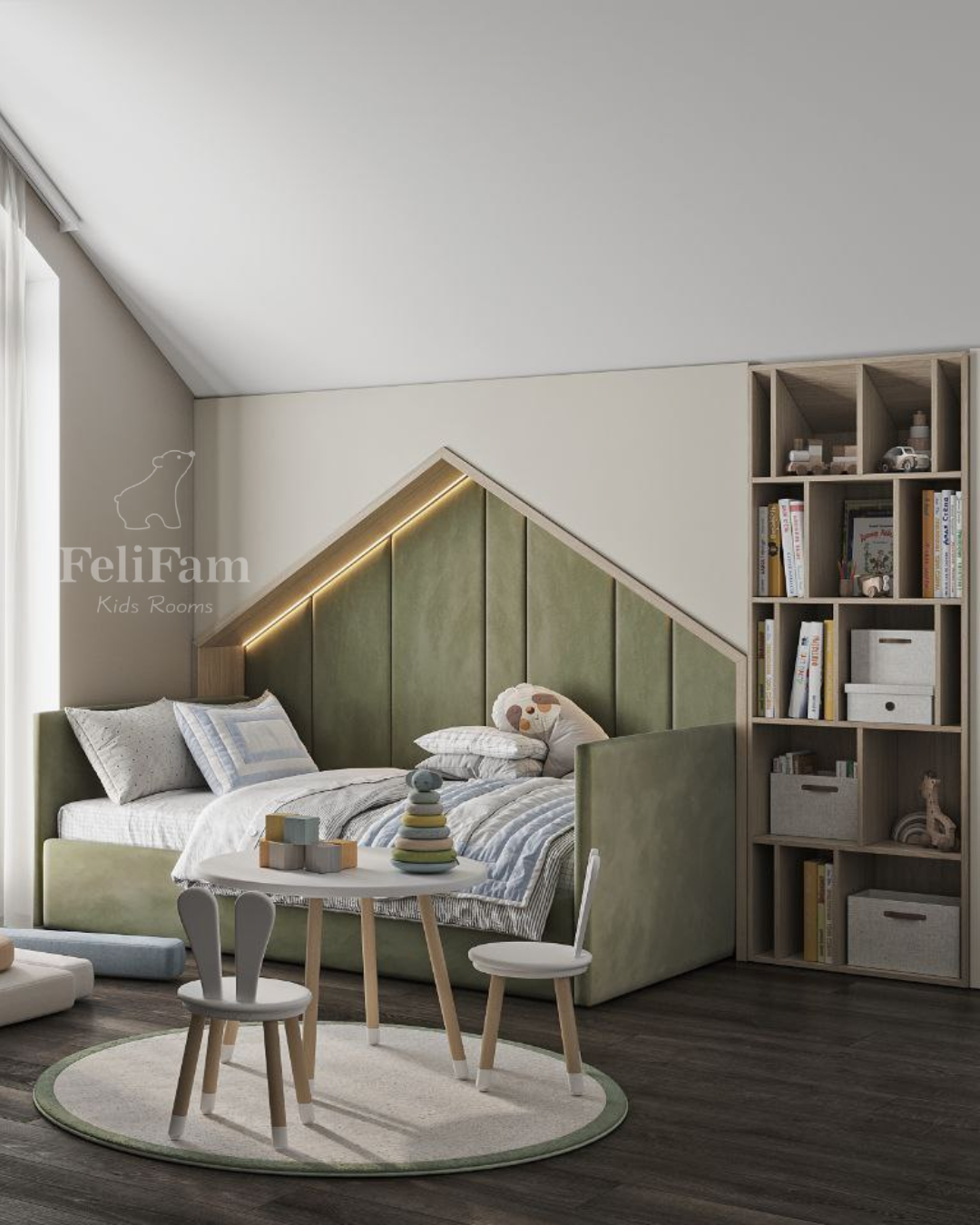 The space is divided into two parts – a sports/play area and a sleep/rest area. We used natural colors to create a calm and cozy atmosphere.