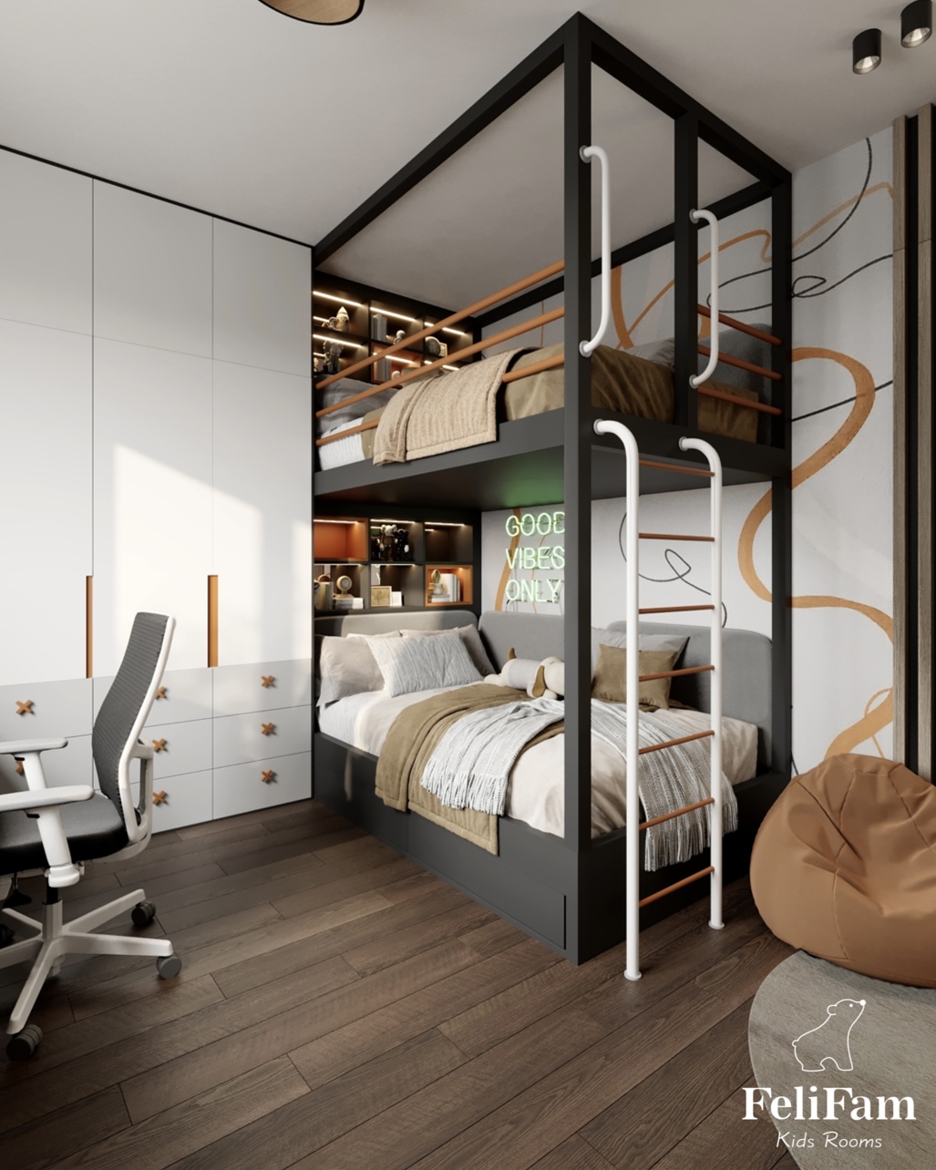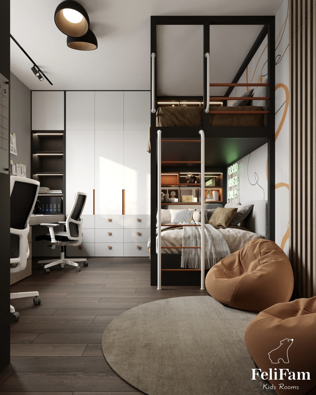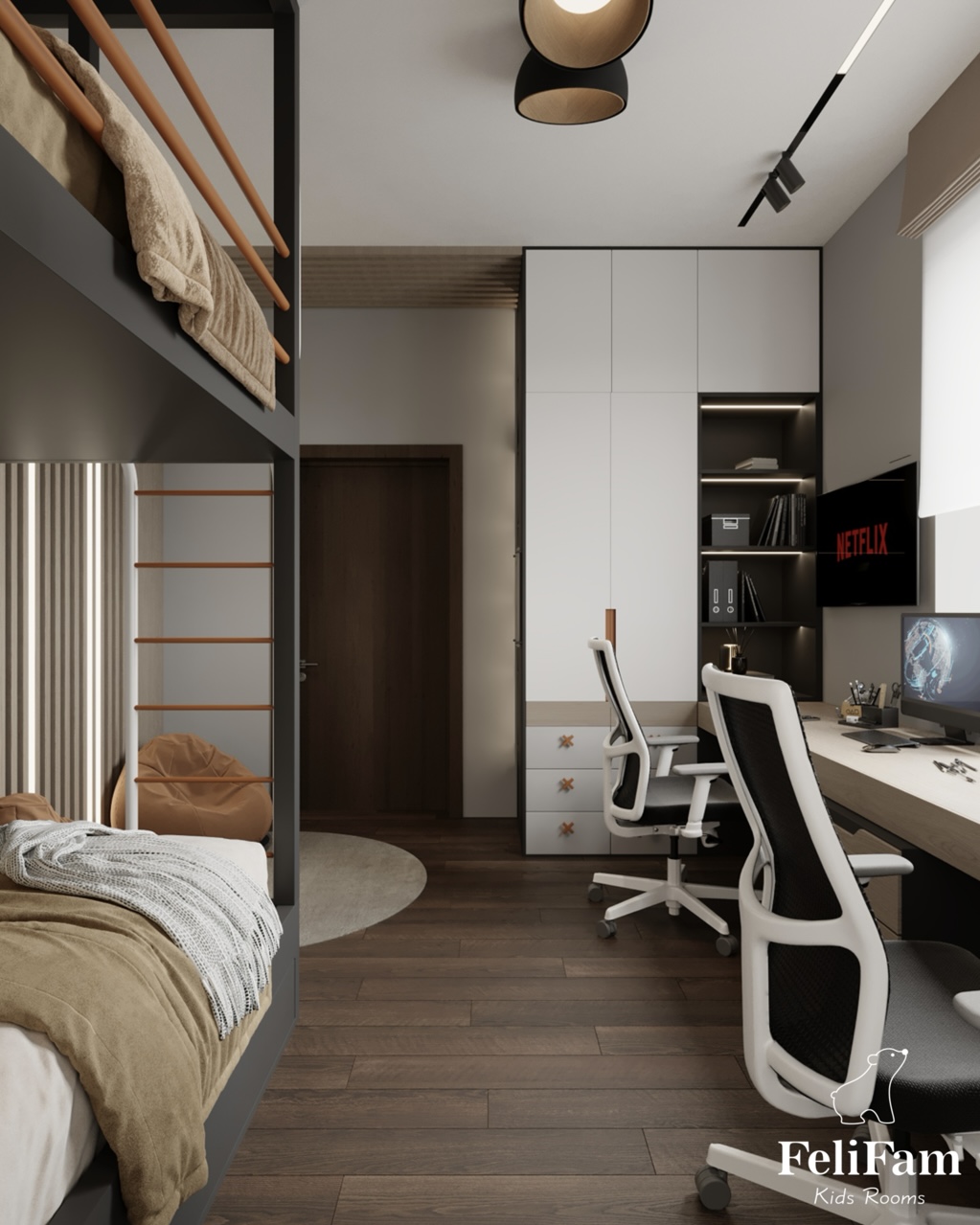 It is important that each child has his or her own space. That’s why we designed this shared room for two boys, so that each of them has his own area for sleeping, studying and storing things.