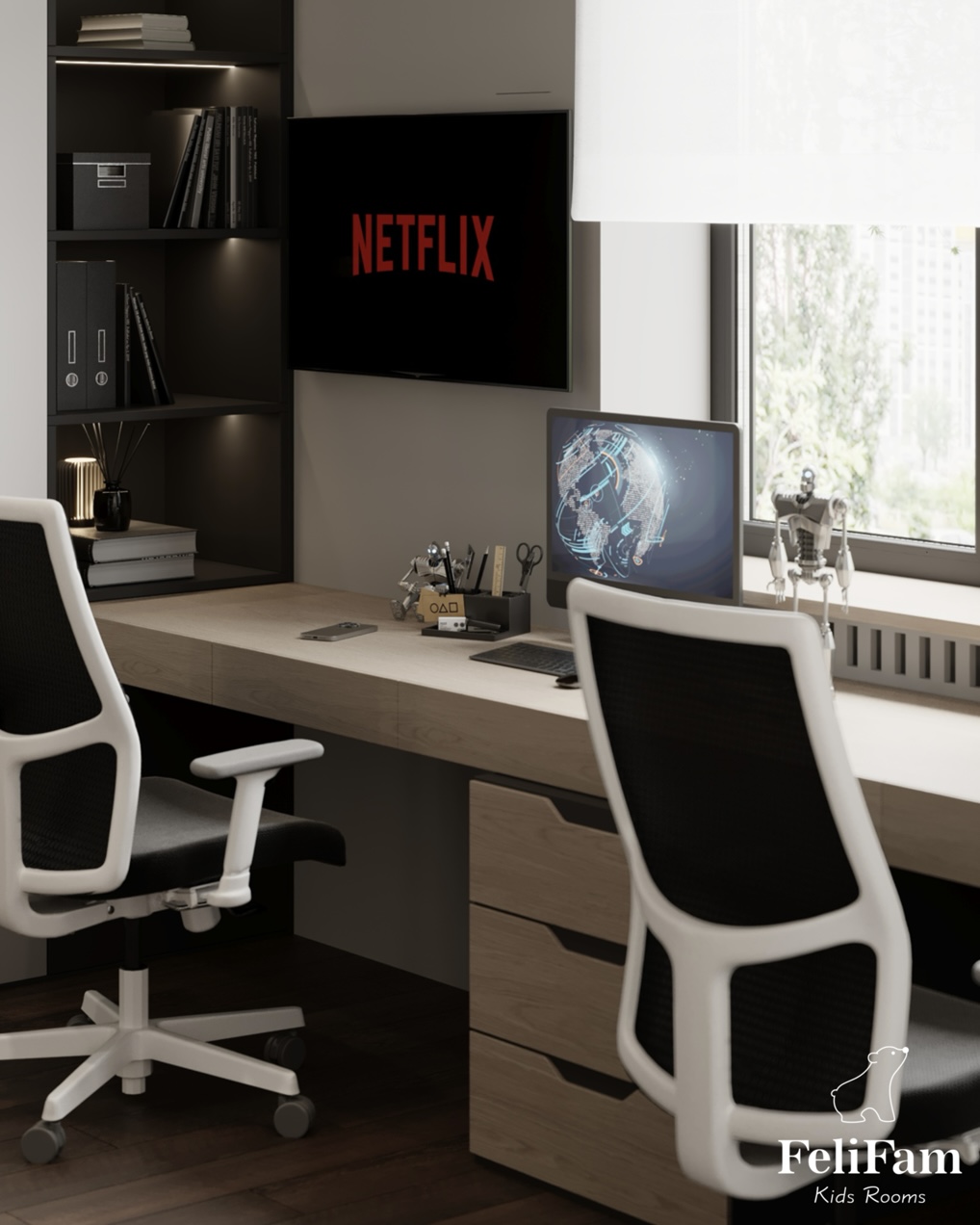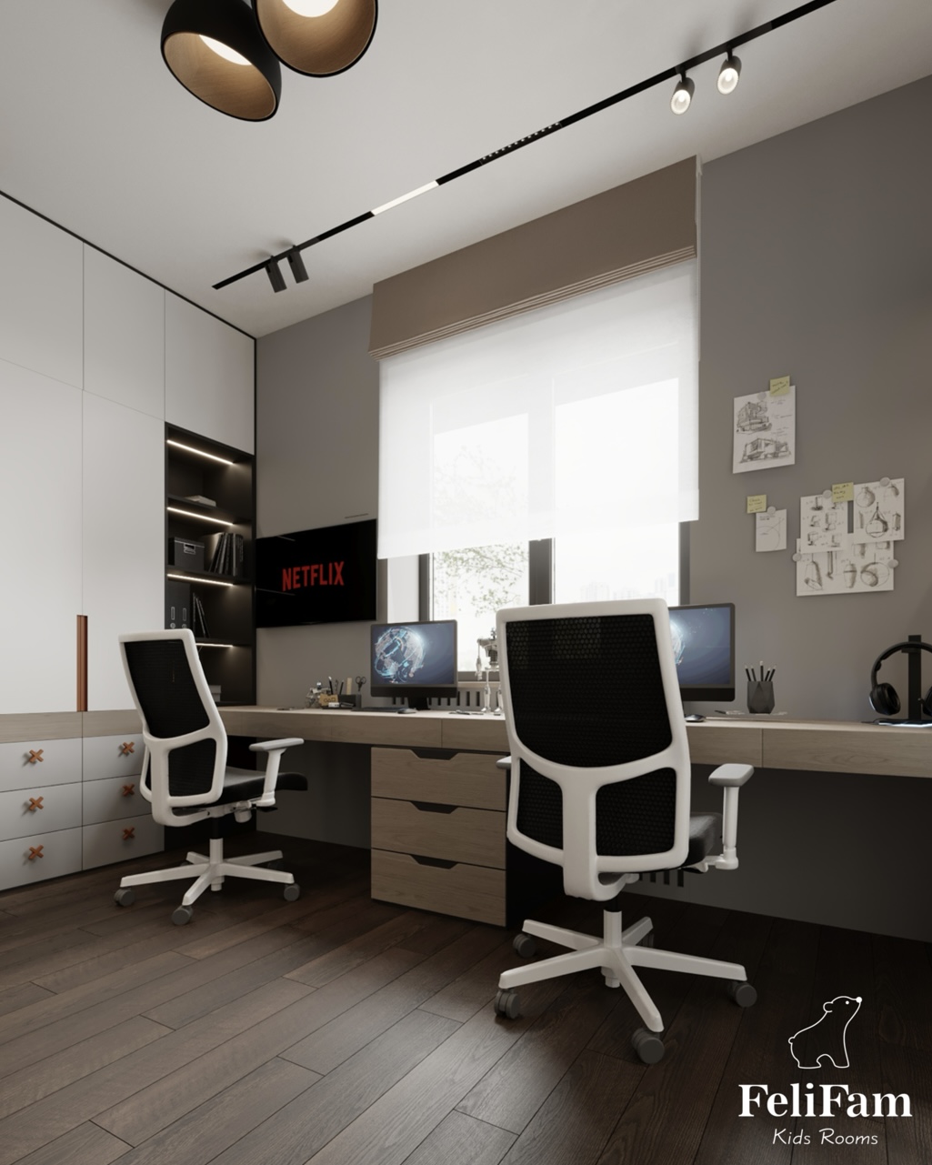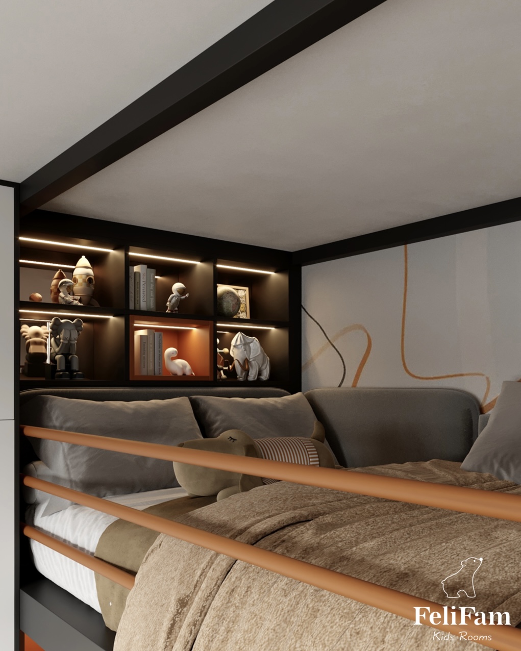 It is important that each child has his or her own space. That’s why we designed this shared room for two boys, so that each of them has his own area for sleeping, studying and storing things.