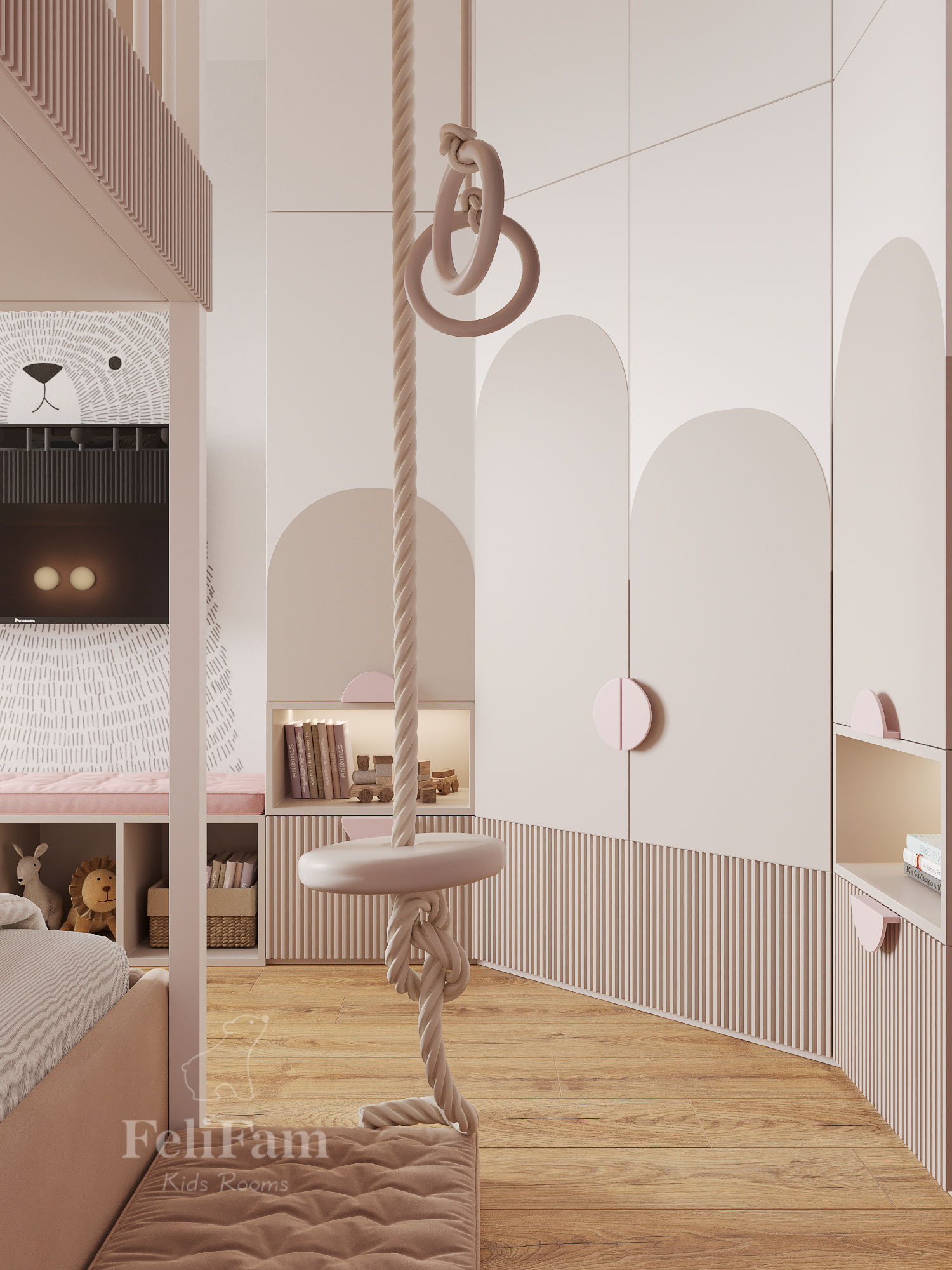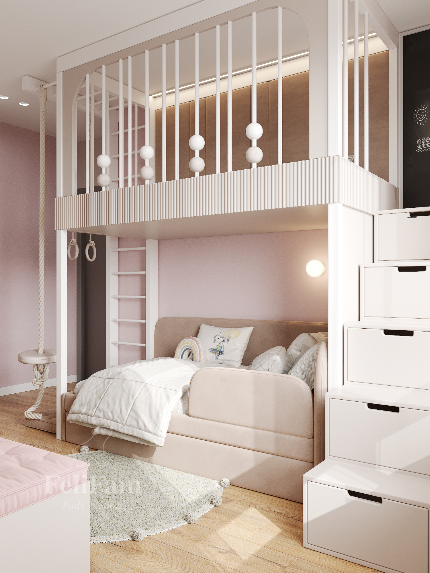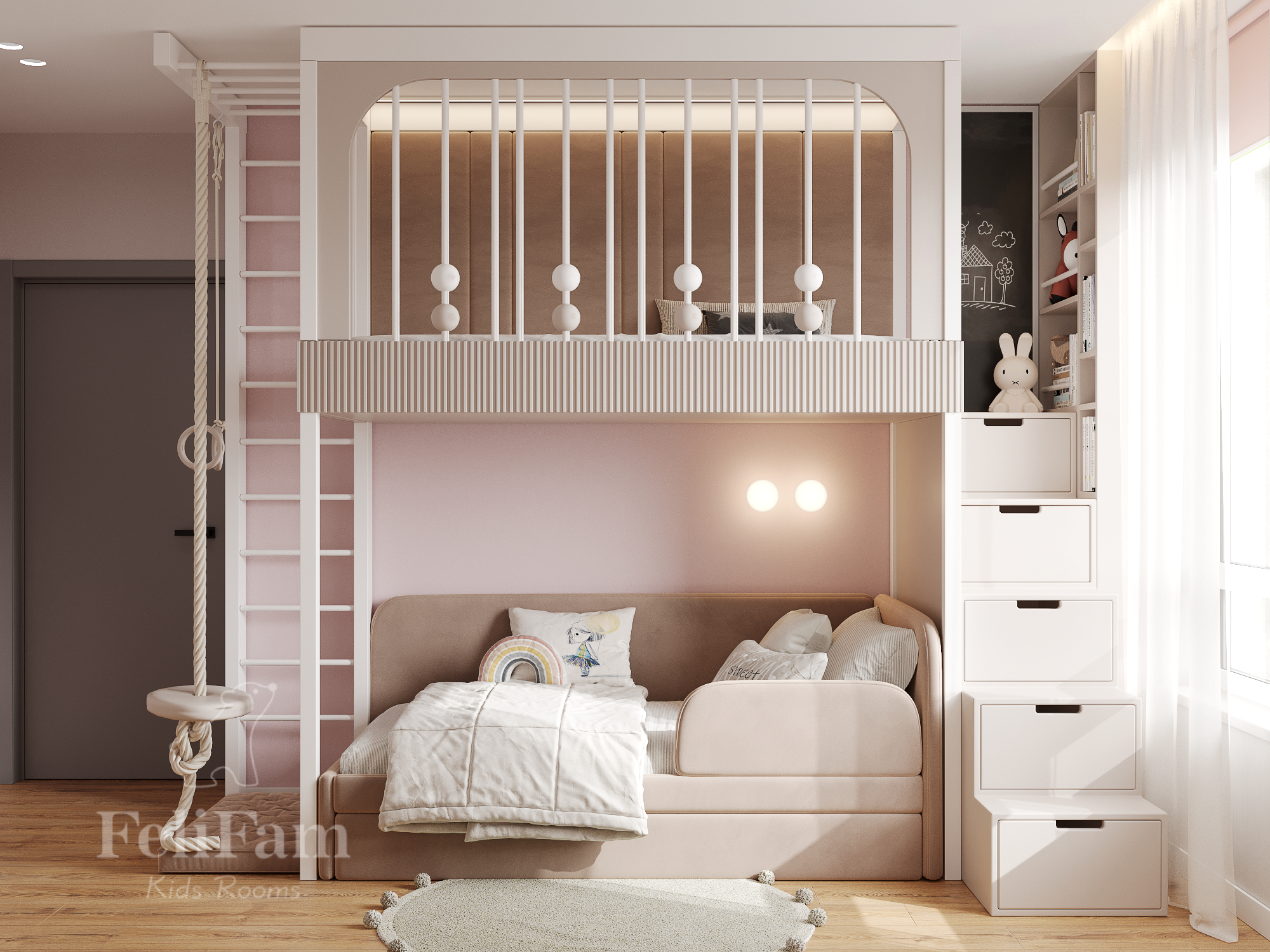 The task was to accommodate a large wardrobe and storage space, and we did it perfectly! We also did not forget about a comfortable sleeping area for a restful sleep and a playful second floor with a Swedish wall for active games and entertainment. And the delicate pastel colors we chose added elegance and comfort to the room. We are sure that this space will become your child’s favorite place!