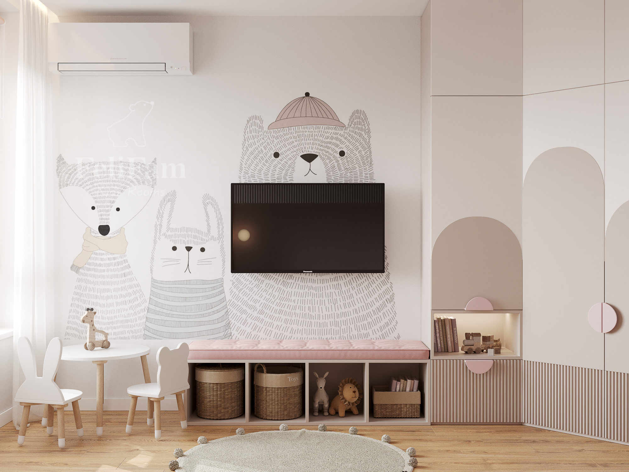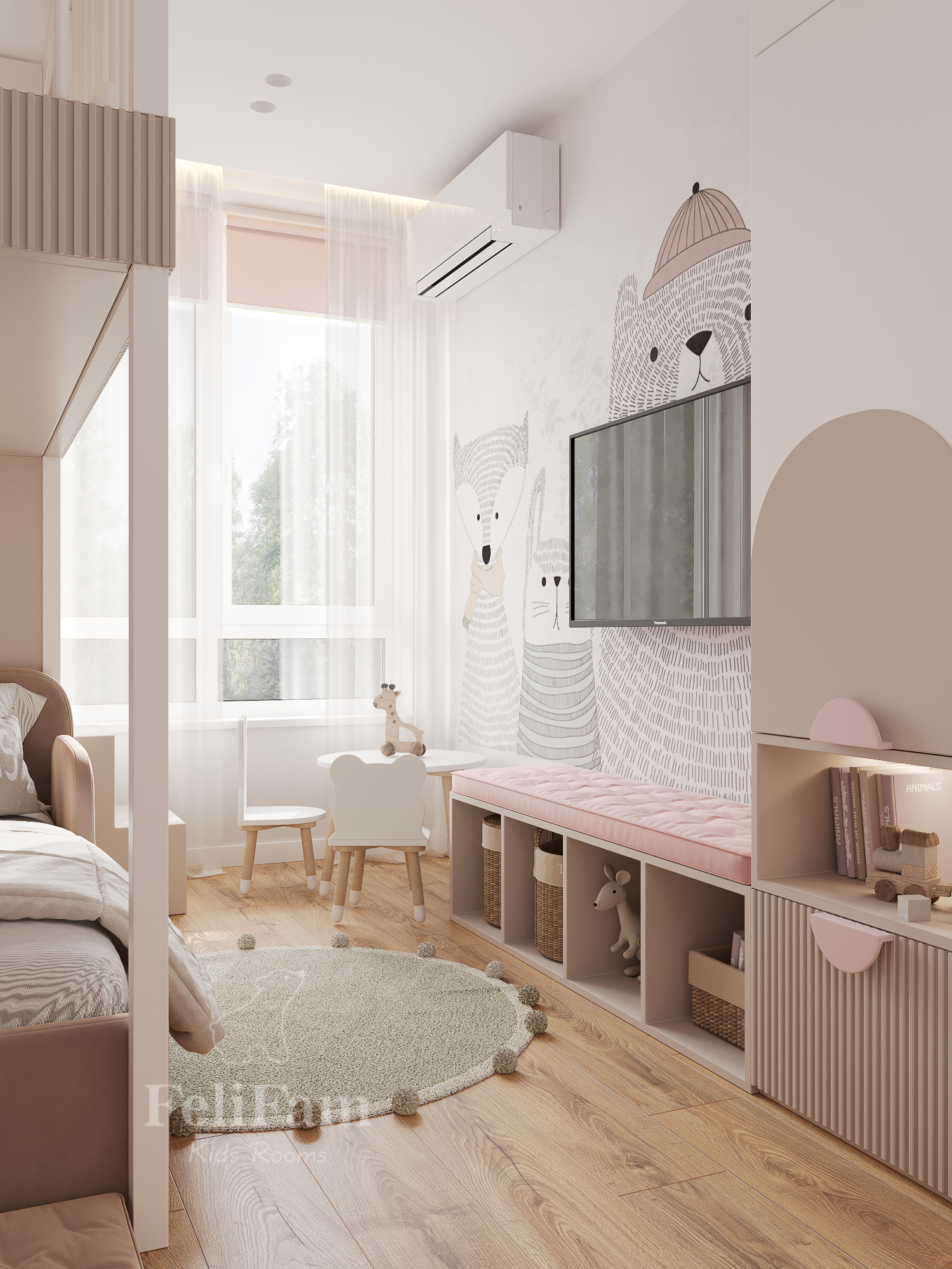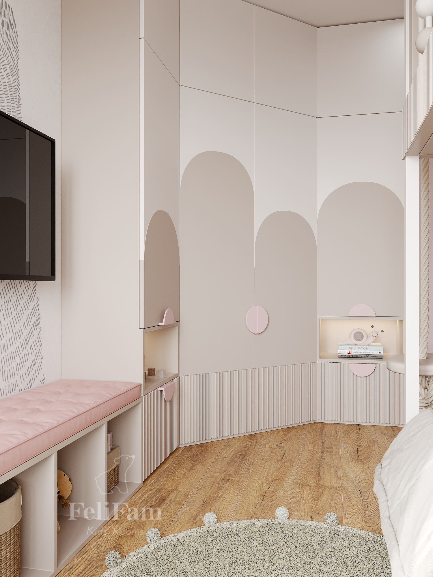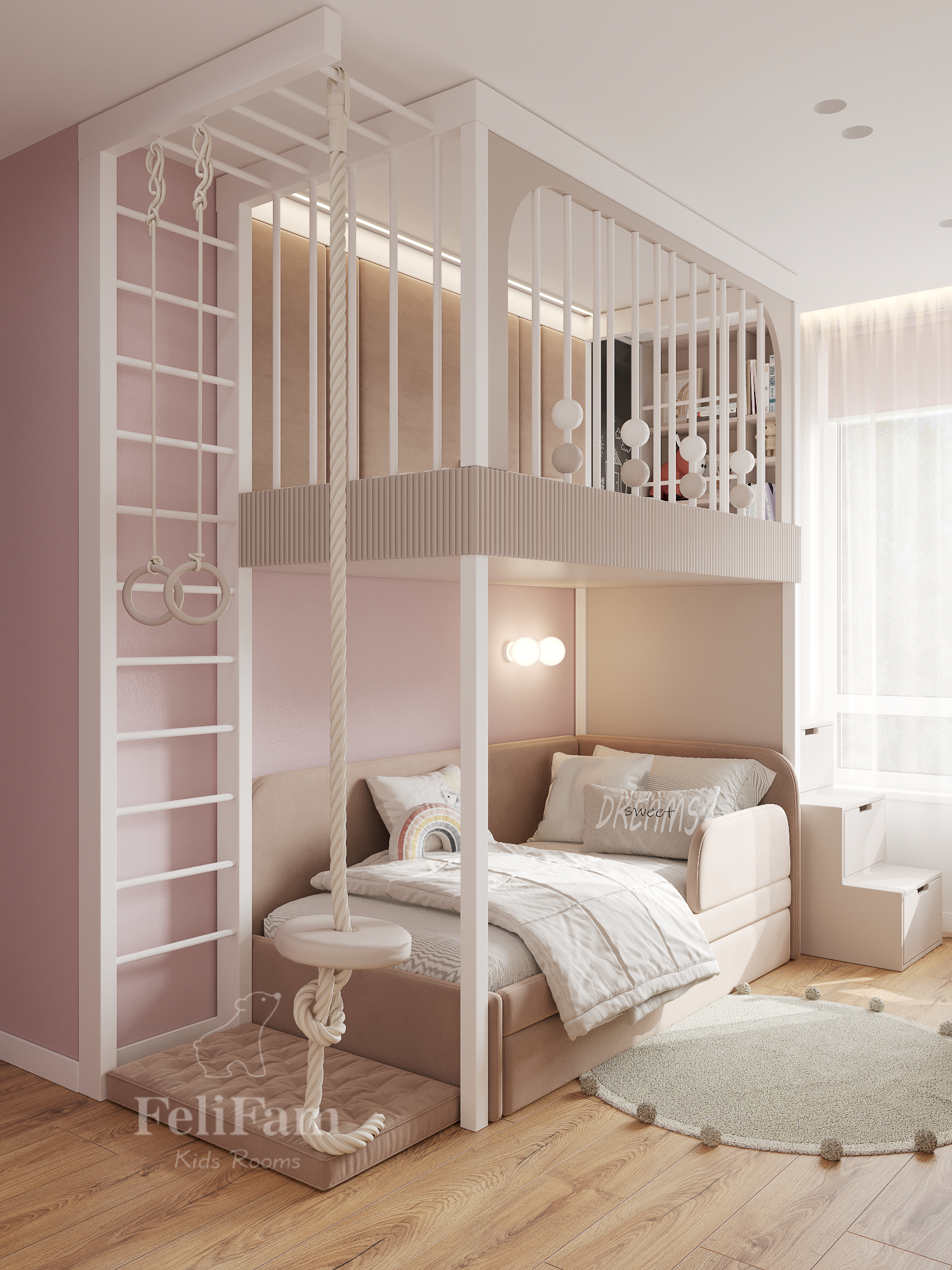 The task was to accommodate a large wardrobe and storage space, and we did it perfectly! We also did not forget about a comfortable sleeping area for a restful sleep and a playful second floor with a Swedish wall for active games and entertainment. And the delicate pastel colors we chose added elegance and comfort to the room. We are sure that this space will become your child’s favorite place!