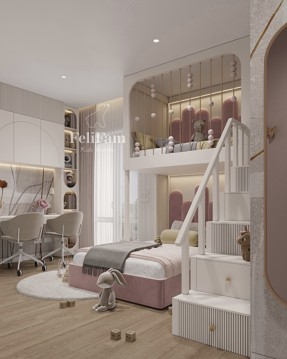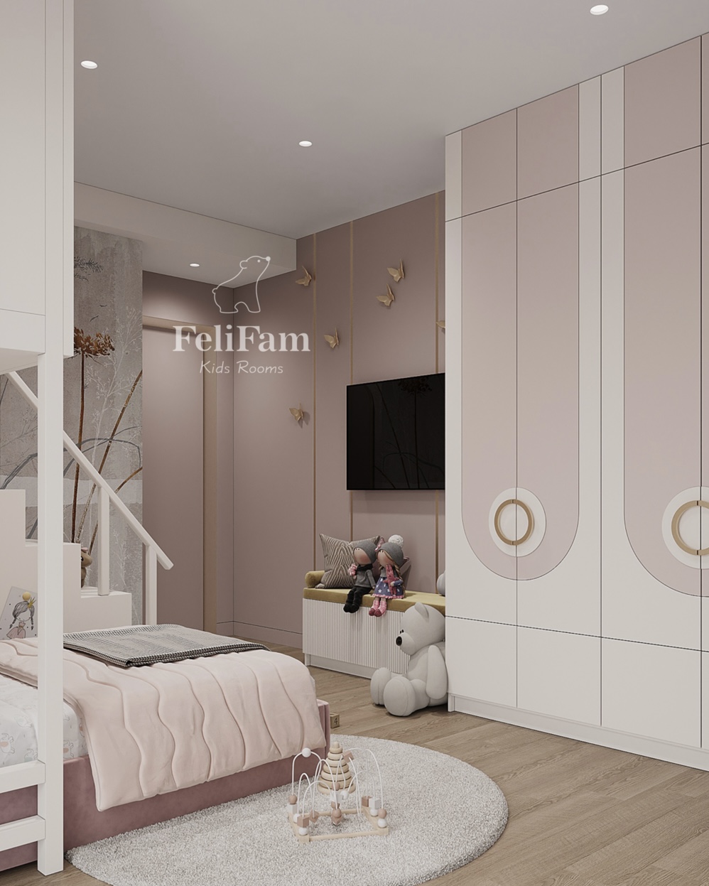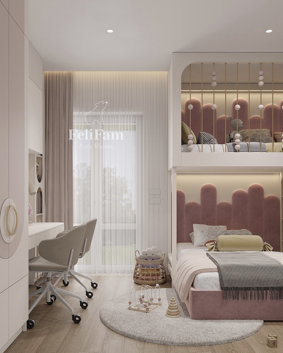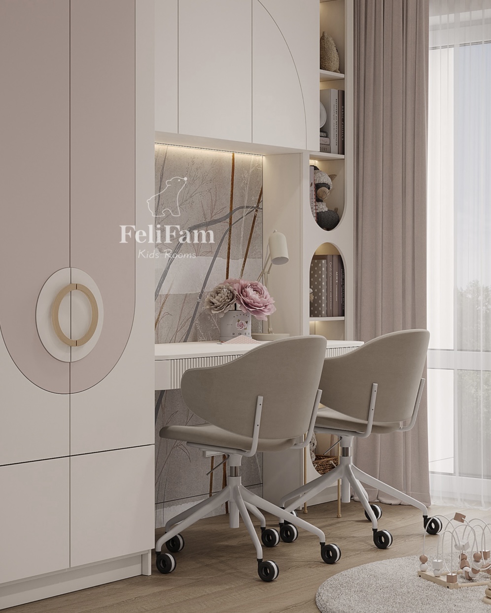 A good solution is a bunk bed with storage drawers in the steps, an adjacent study area, and a corner wardrobe for clothes and other items. In this room for two girls, we have implemented all possible elements to increase the functionality of the room.