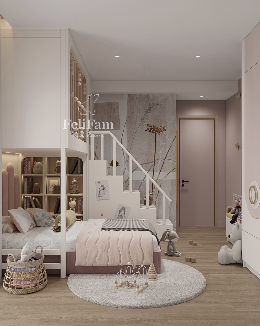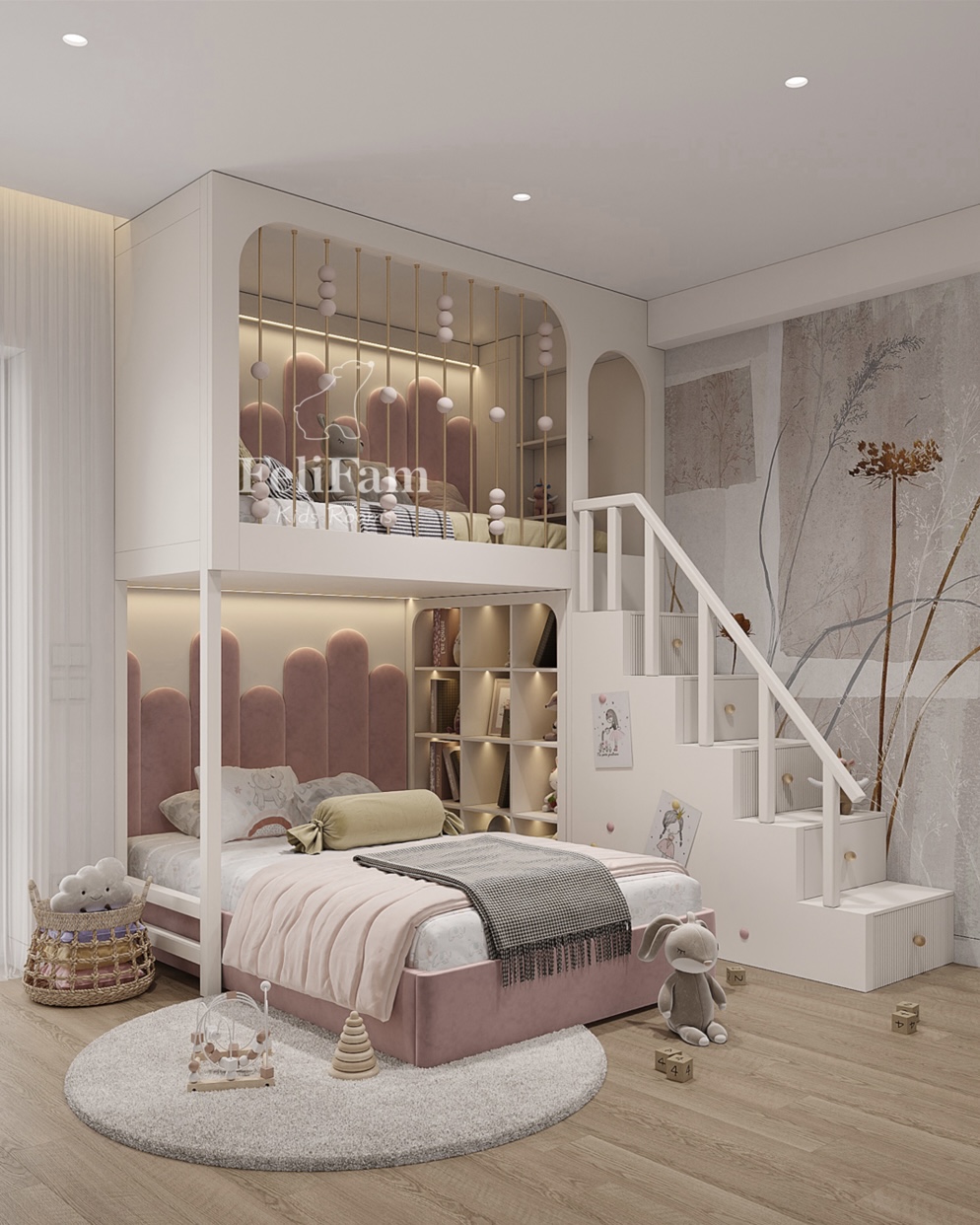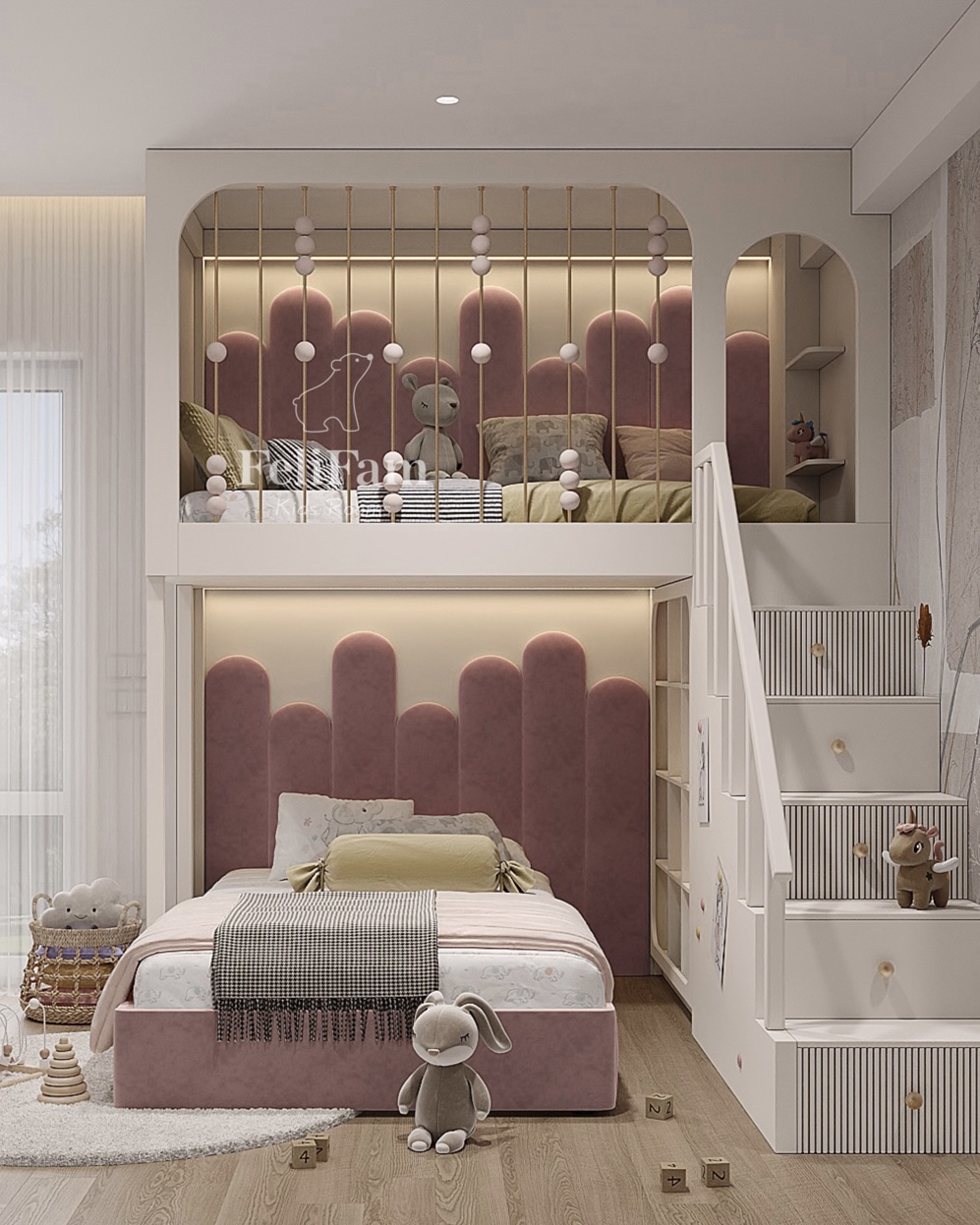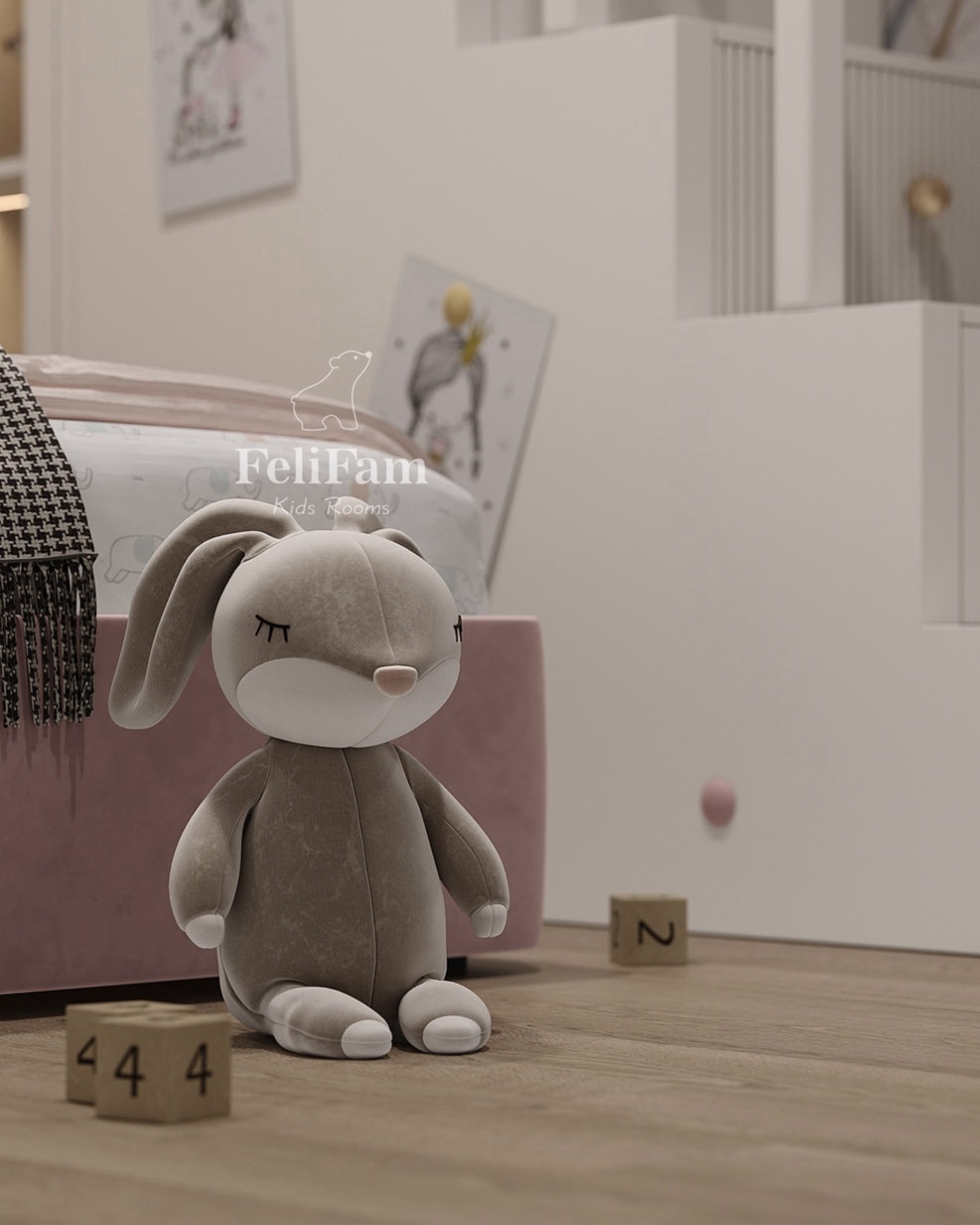 A good solution is a bunk bed with storage drawers in the steps, an adjacent study area, and a corner wardrobe for clothes and other items. In this room for two girls, we have implemented all possible elements to increase the functionality of the room.