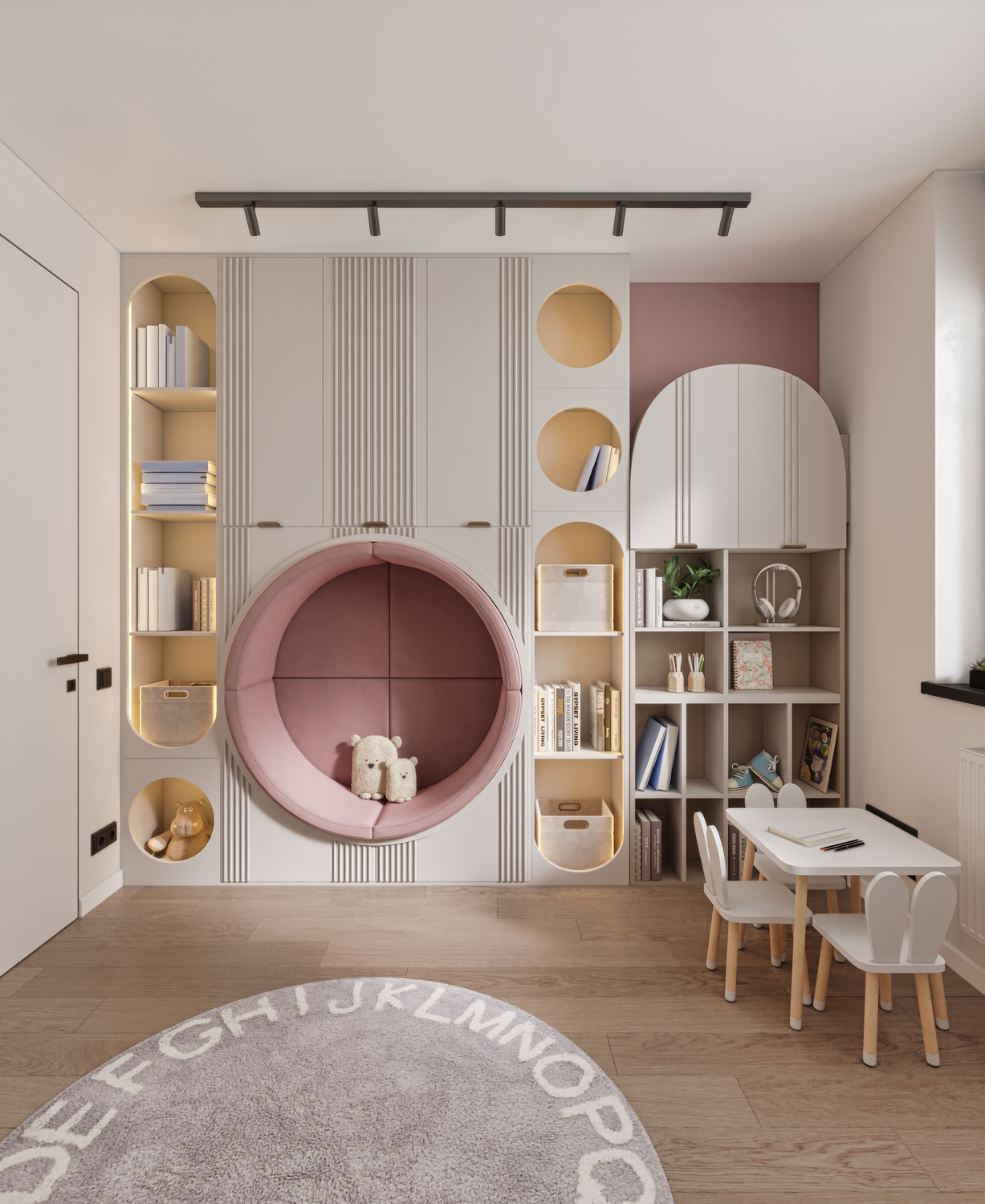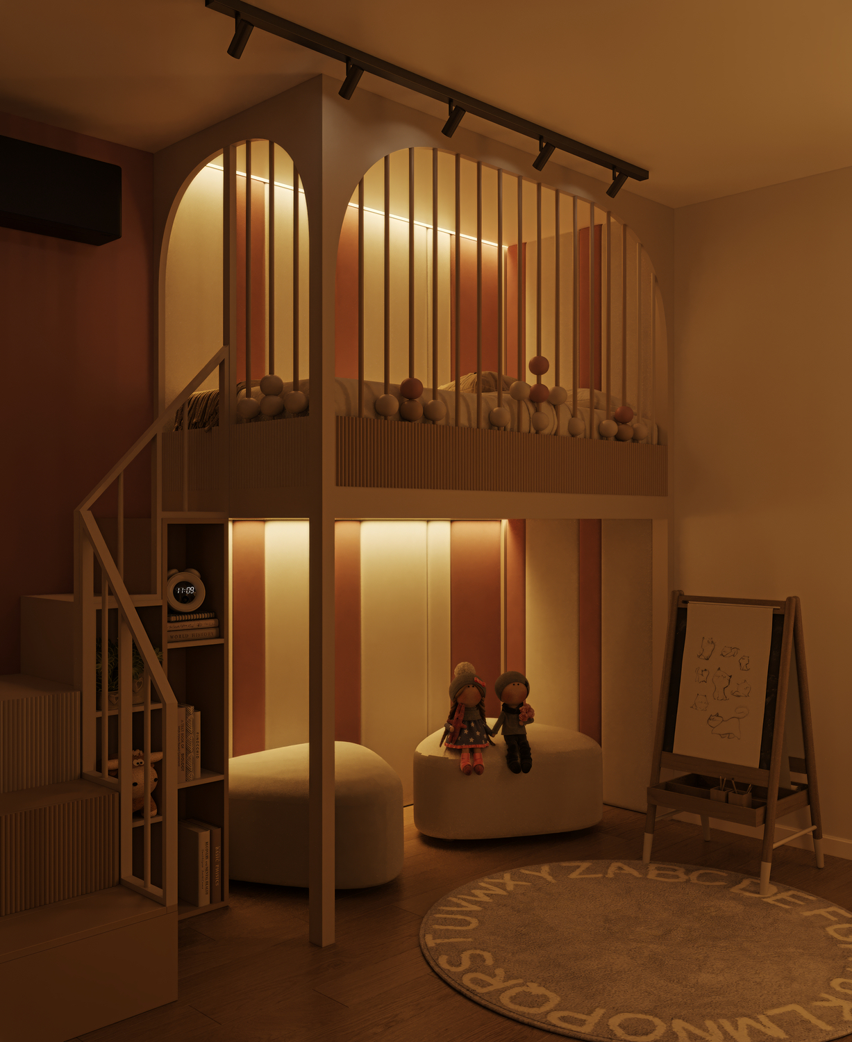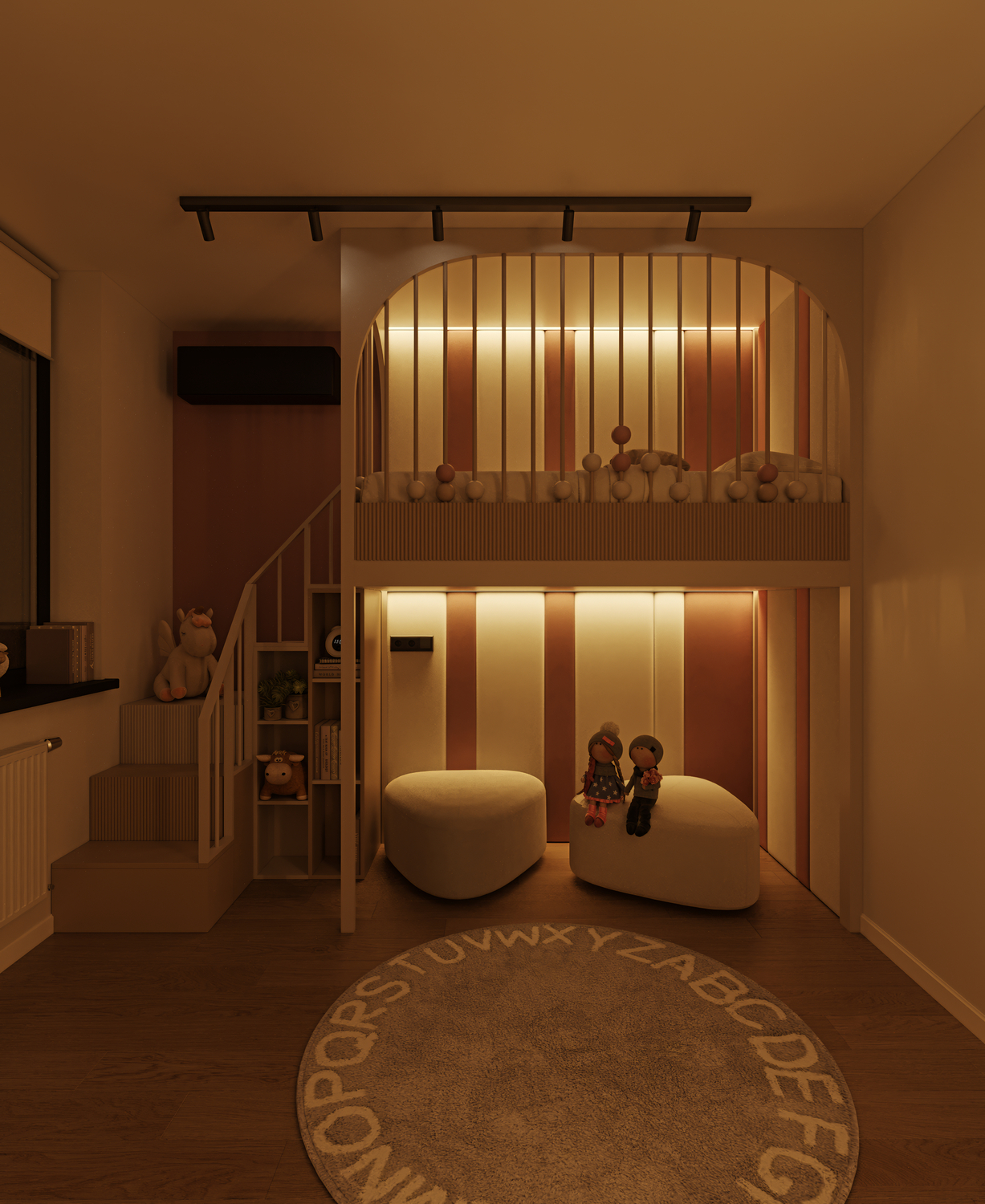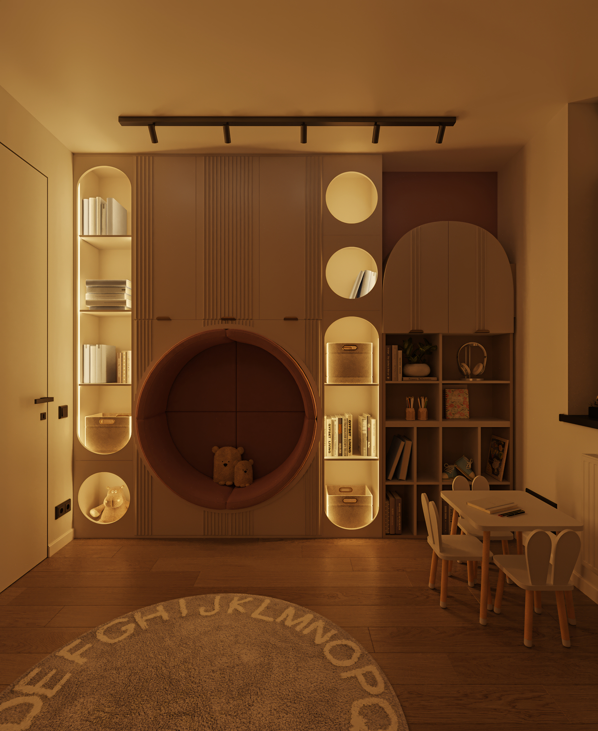 Lighting plays a crucial role in creating coziness and comfort in a children’s room. In this project, the atmosphere is complemented by lighting on the shelves and in the sleeping area, which promotes relaxation and a sense of security.