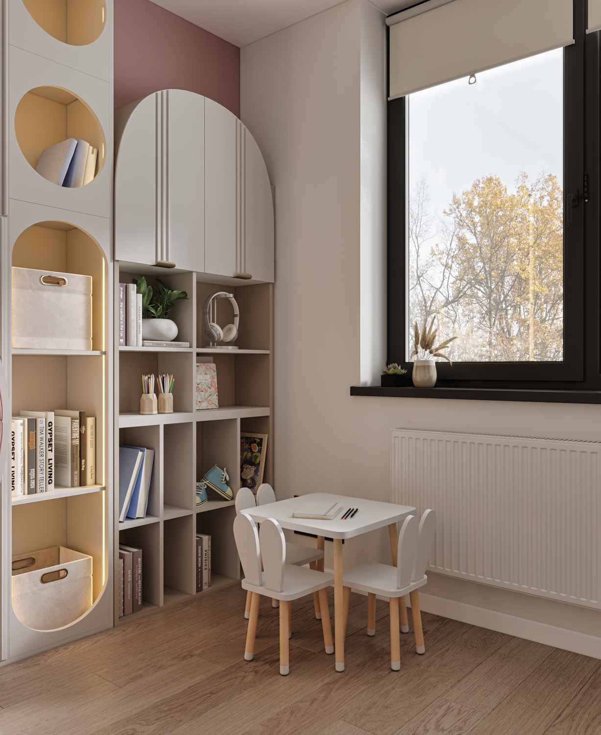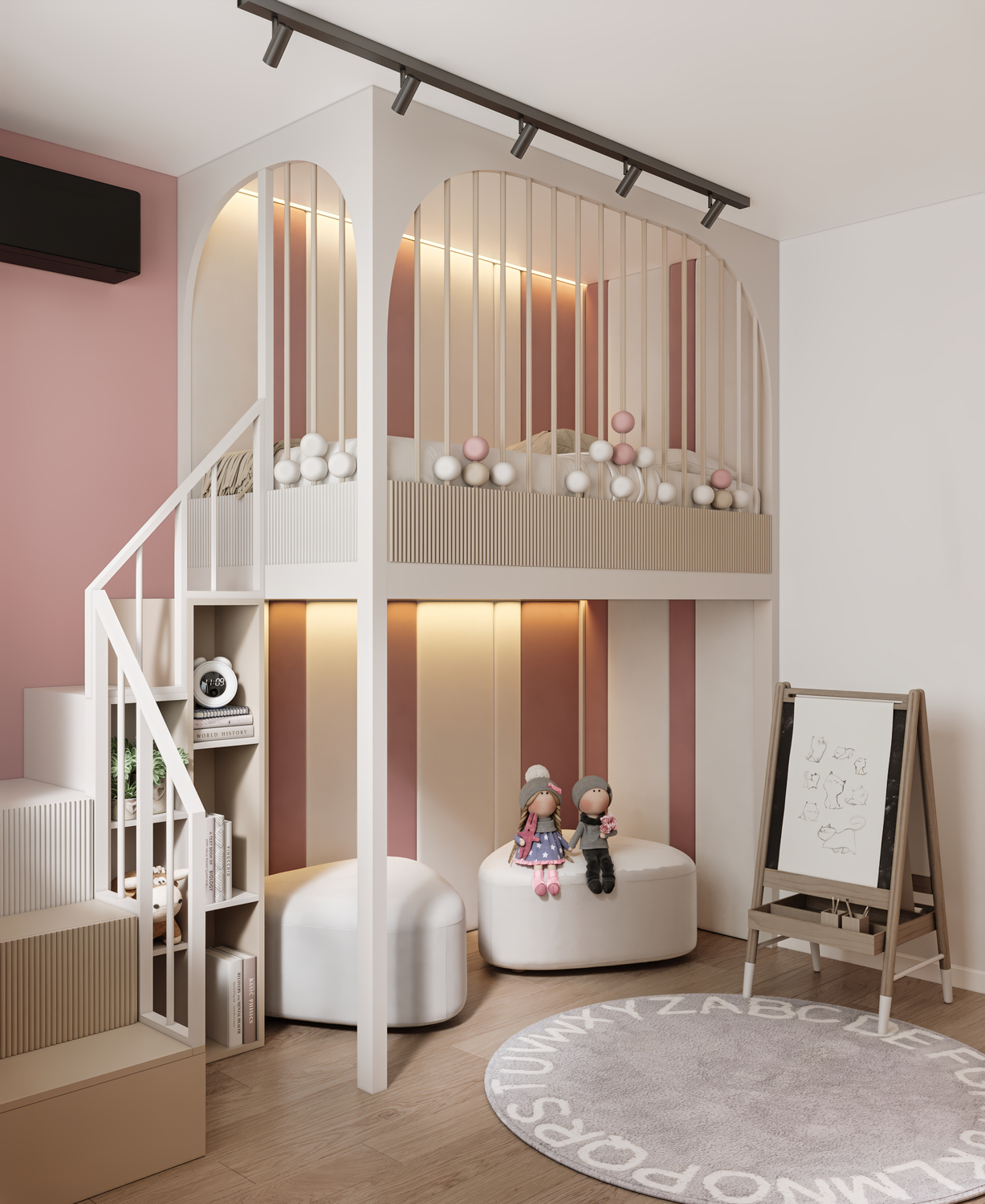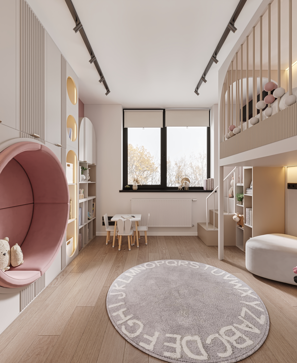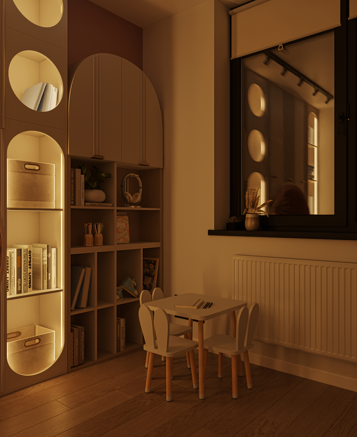 Lighting plays a crucial role in creating coziness and comfort in a children’s room. In this project, the atmosphere is complemented by lighting on the shelves and in the sleeping area, which promotes relaxation and a sense of security.