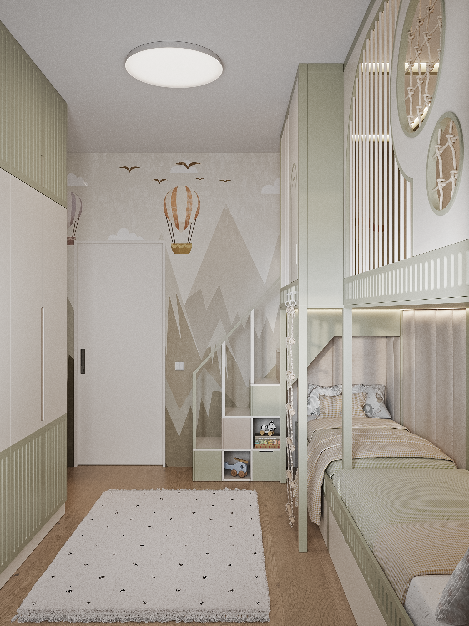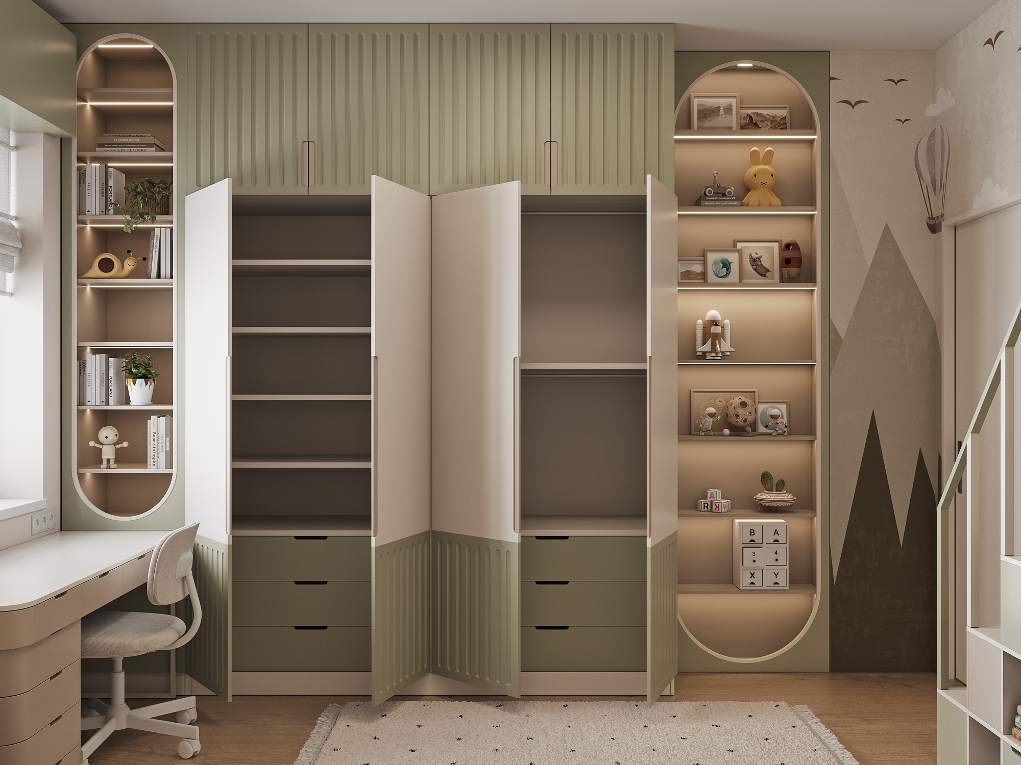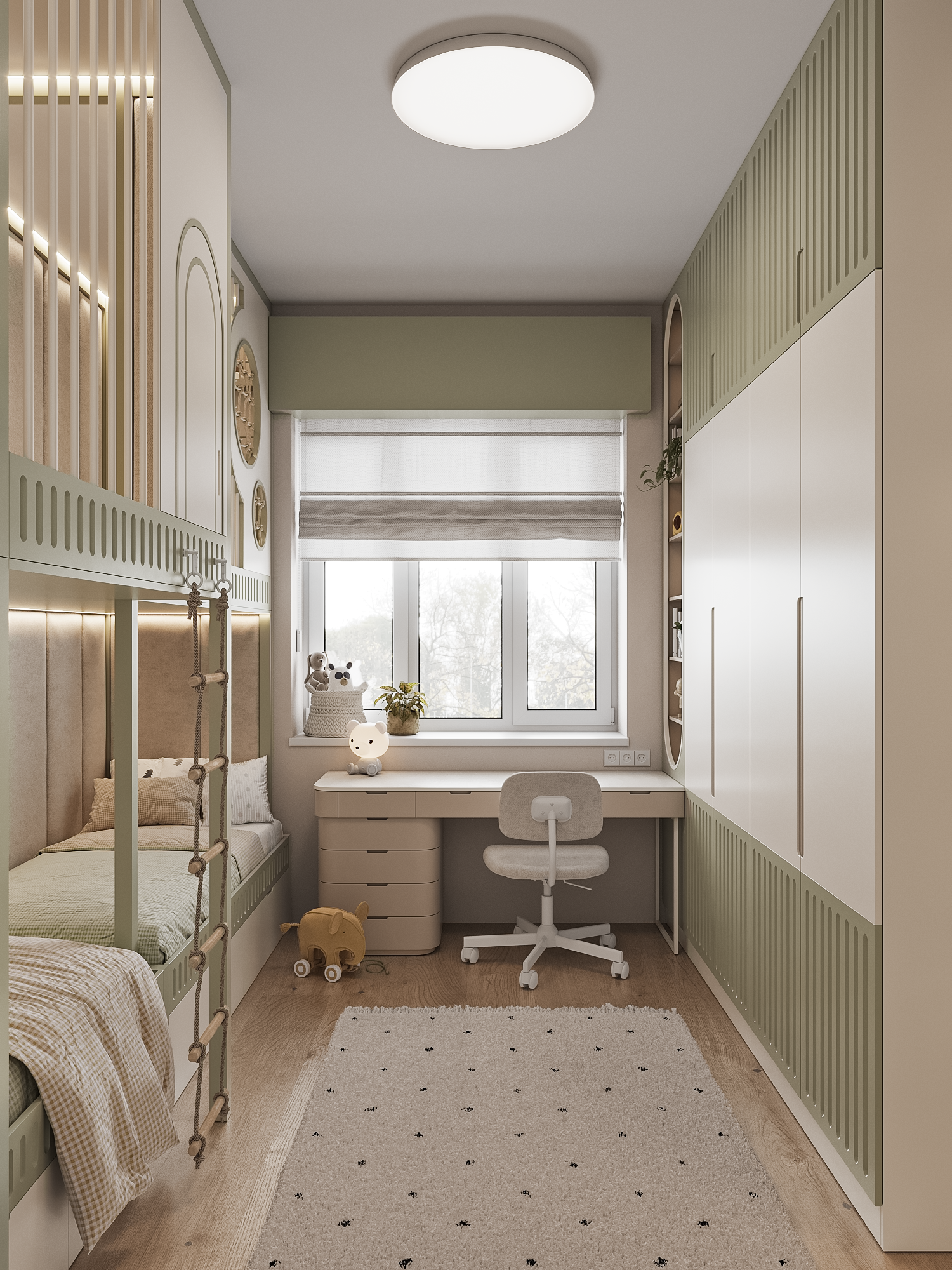 This project features universal colors that appeal to both boys and girls, creating a cozy atmosphere for everyone. The wardrobe is designed with thoughtful organization, ensuring that everything has its place—from toys to schoolbooks. Every detail is carefully considered for maximum convenience and order!