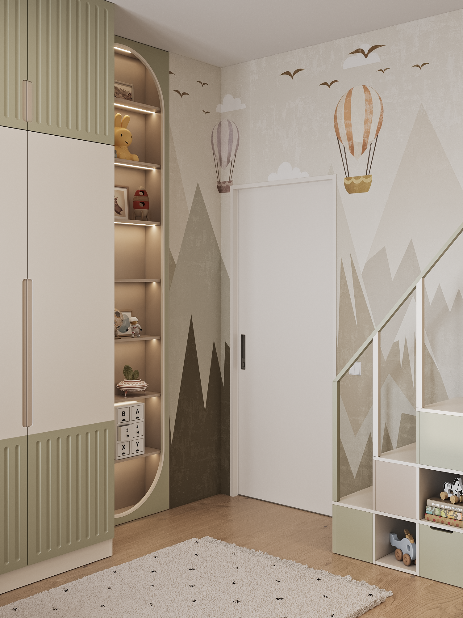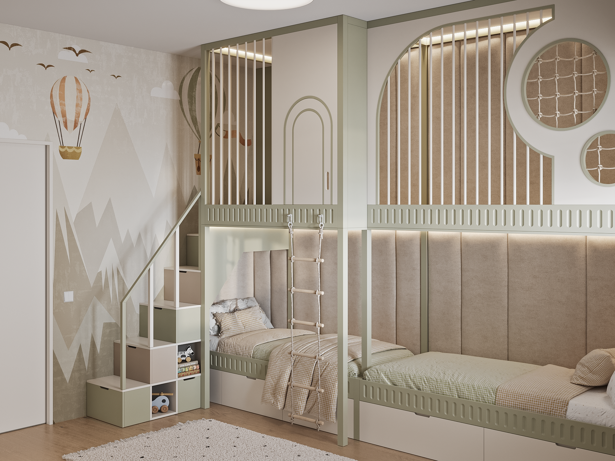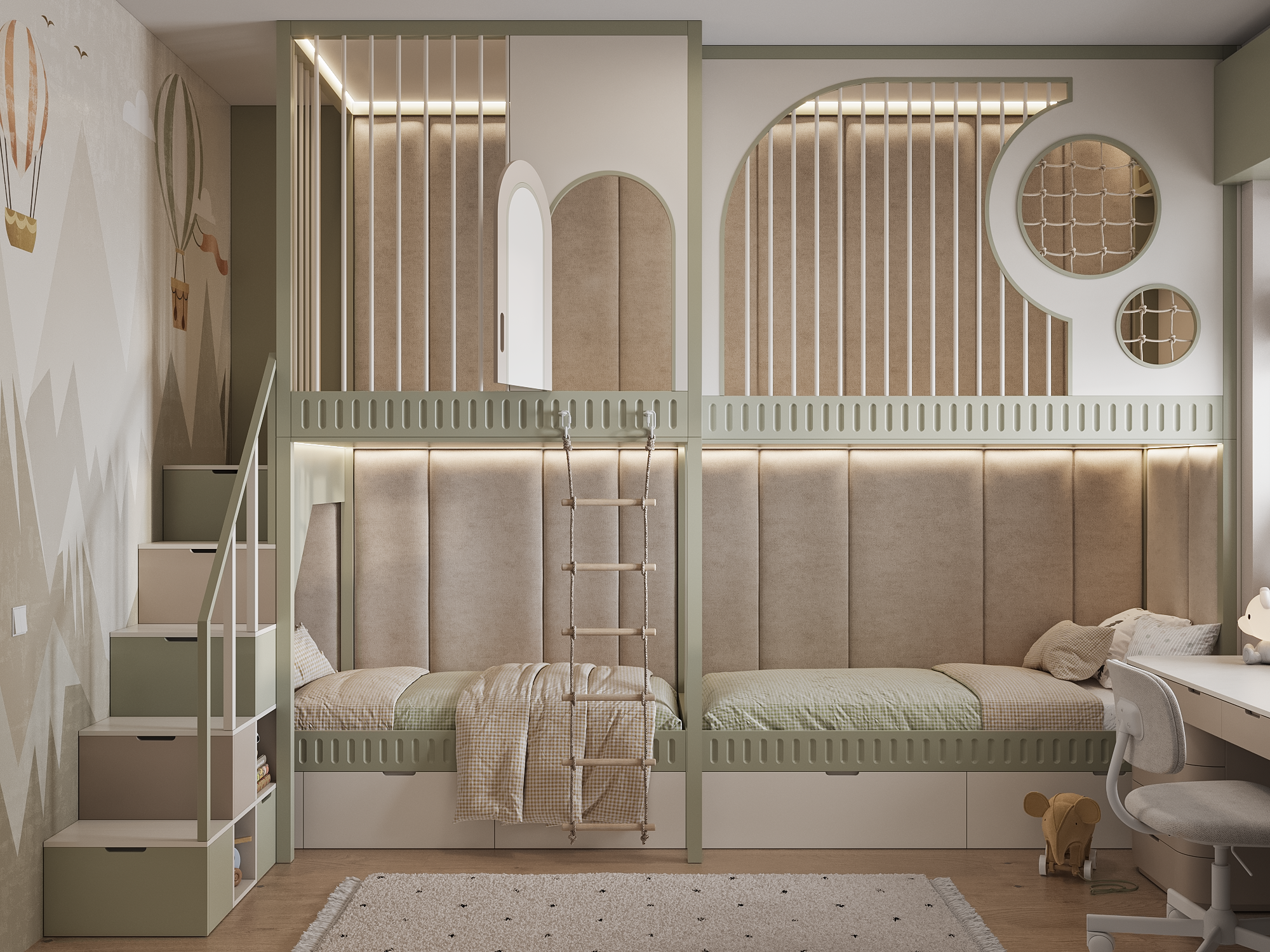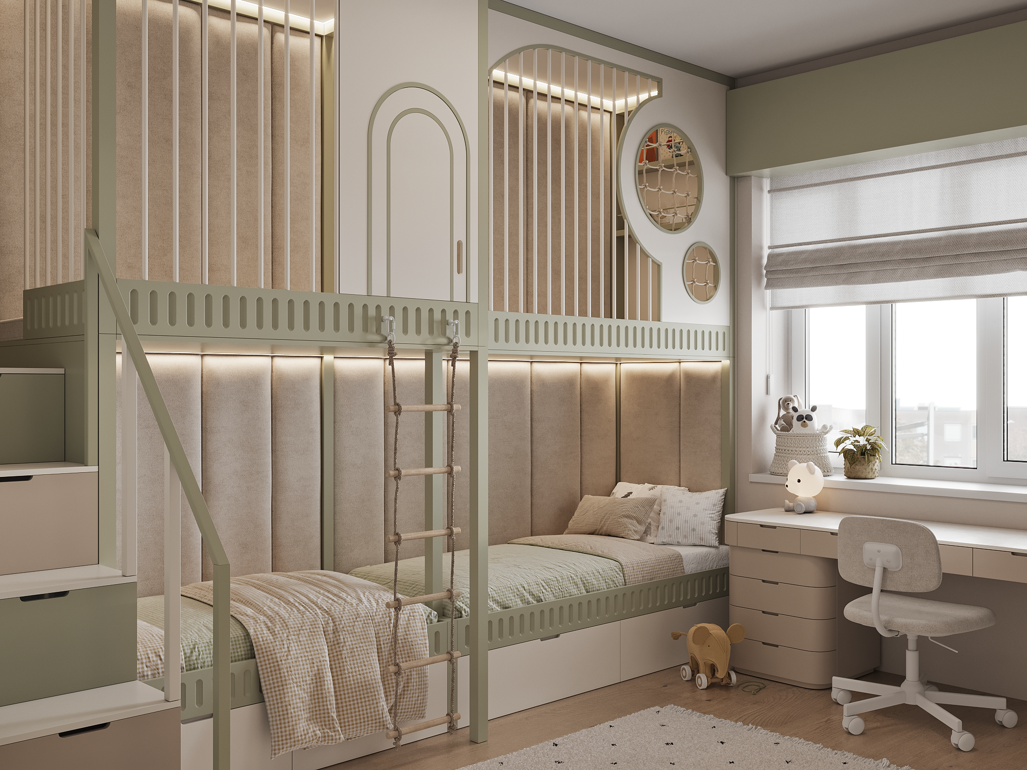 This project features universal colors that appeal to both boys and girls, creating a cozy atmosphere for everyone. The wardrobe is designed with thoughtful organization, ensuring that everything has its place—from toys to schoolbooks. Every detail is carefully considered for maximum convenience and order!