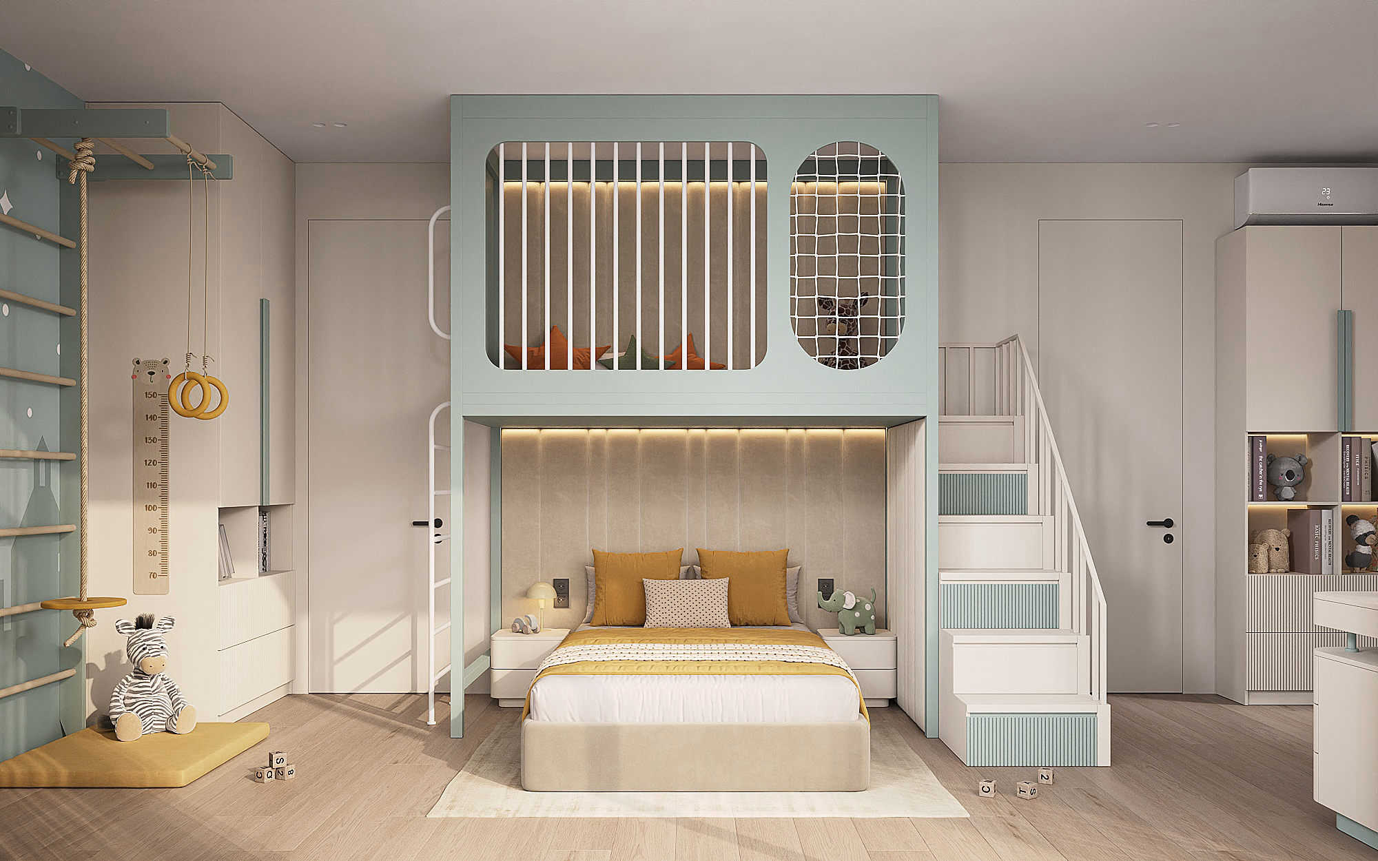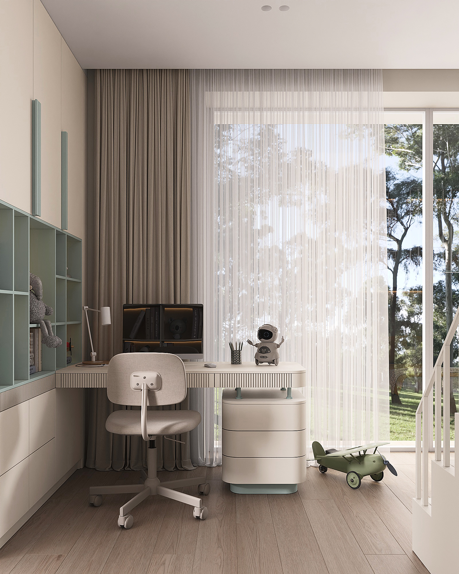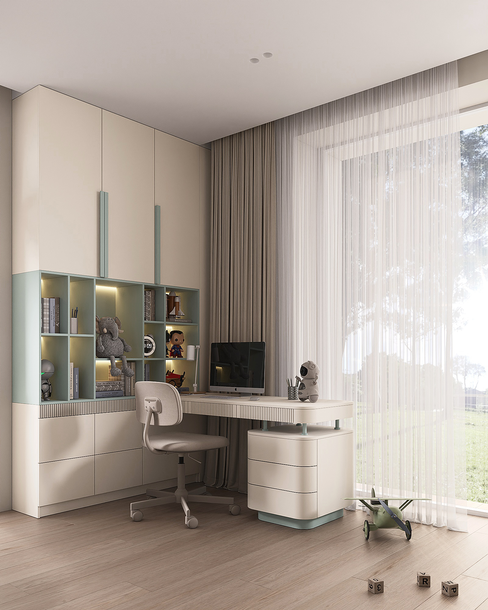 A spacious and functional room with a dressing room for a 4-year-old boy.