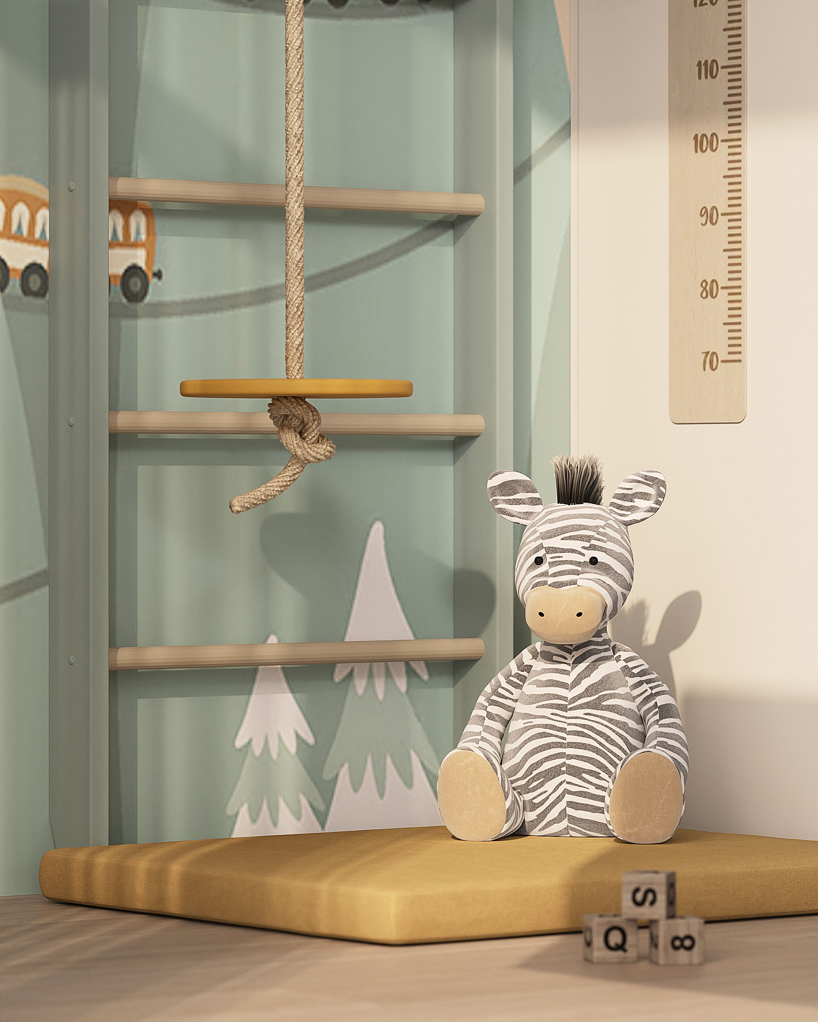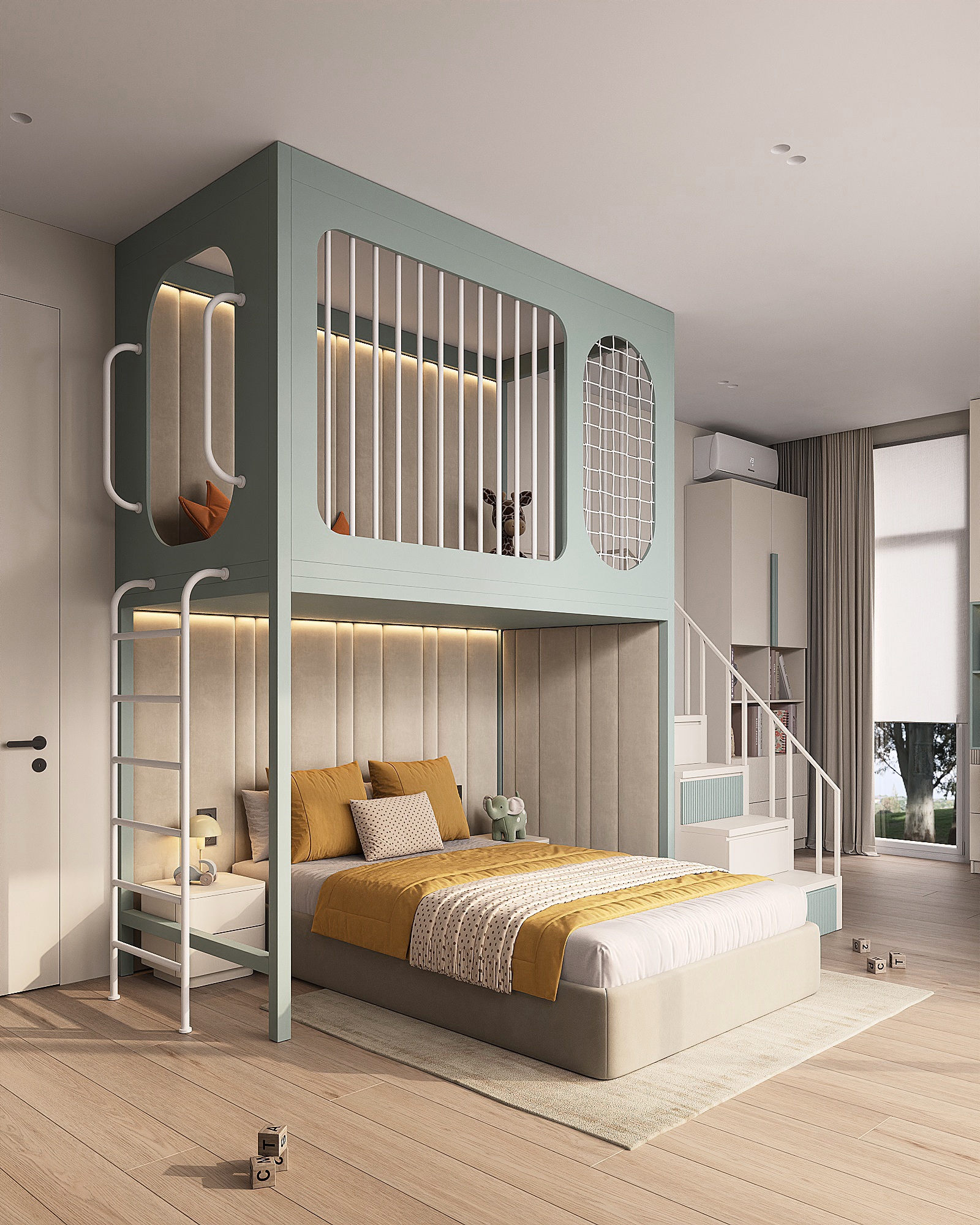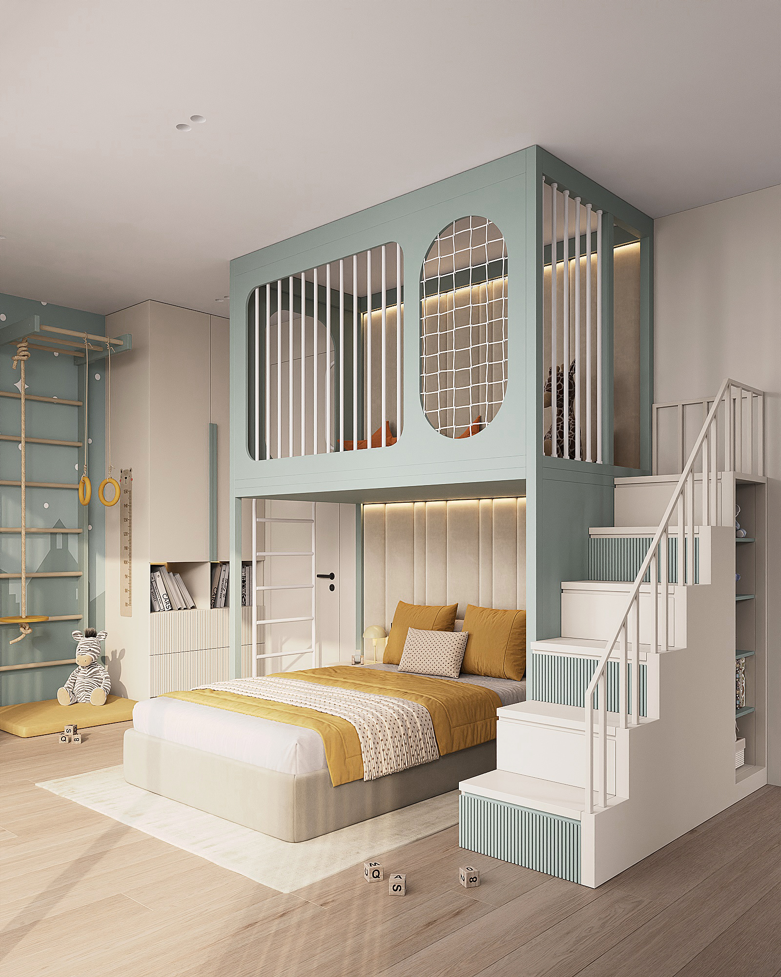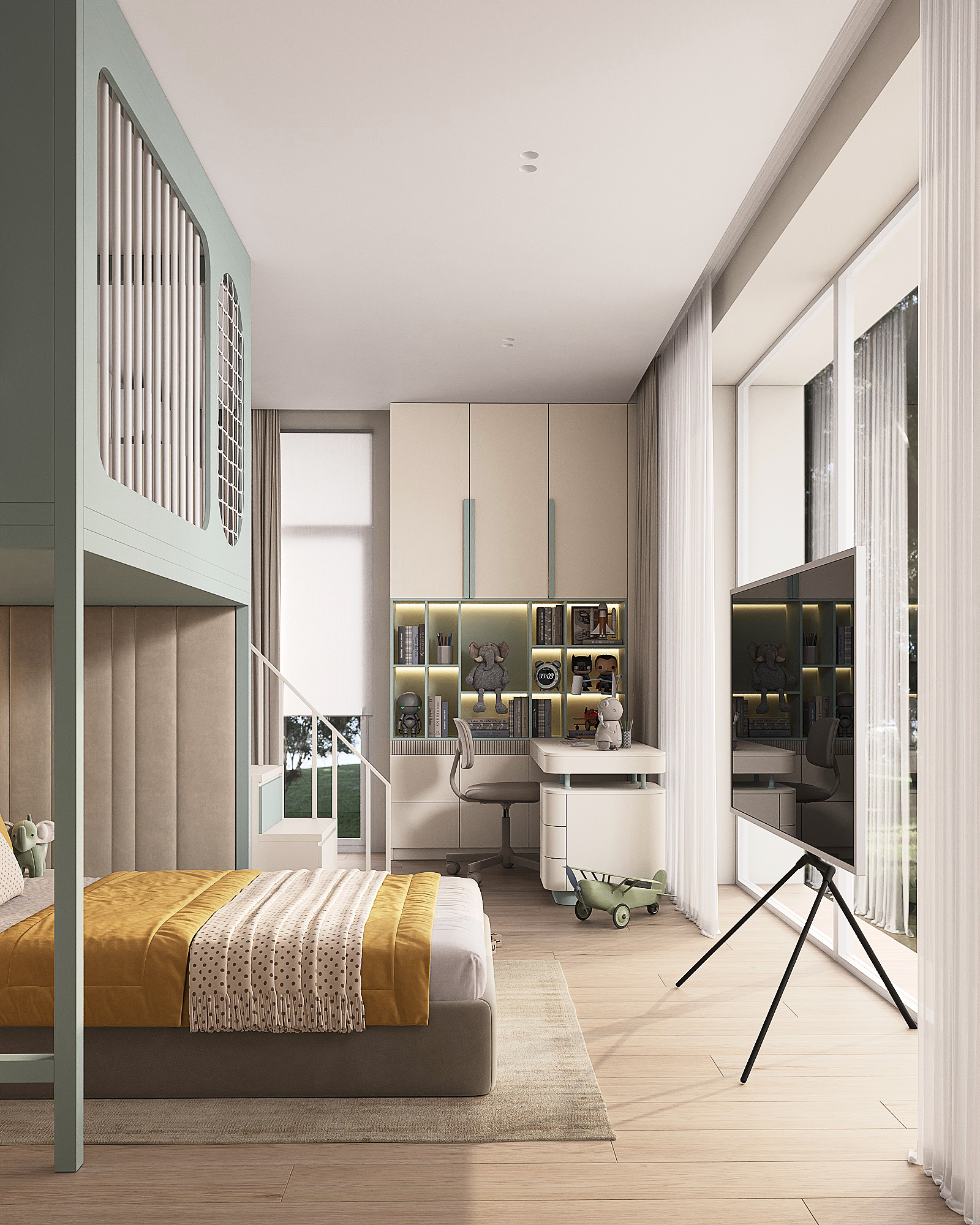 A spacious and functional room with a dressing room for a 4-year-old boy.