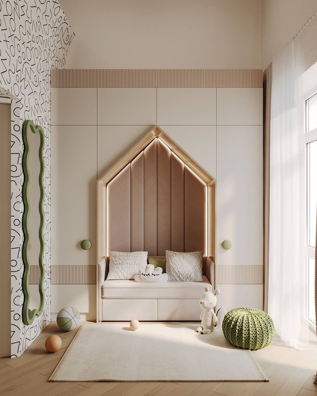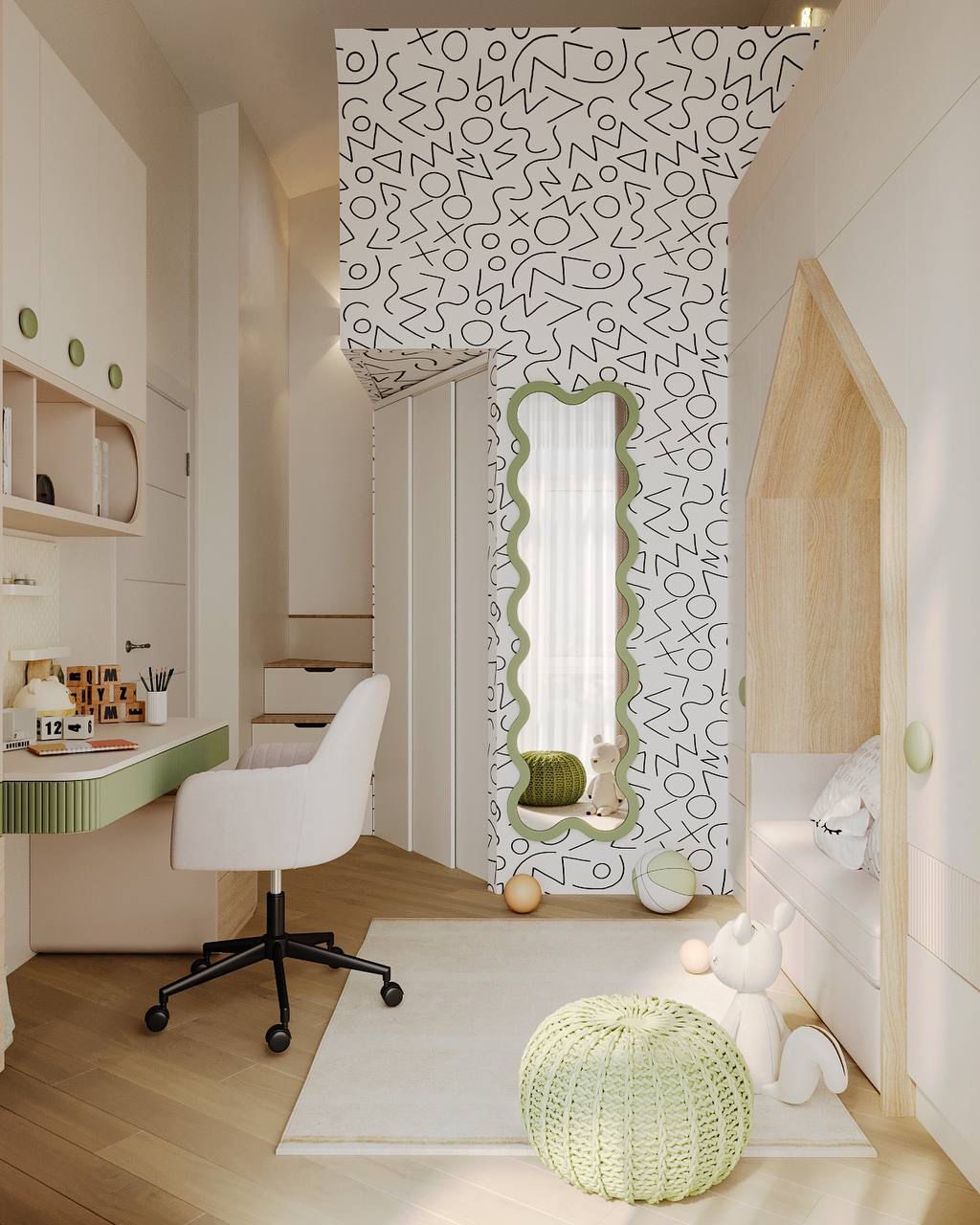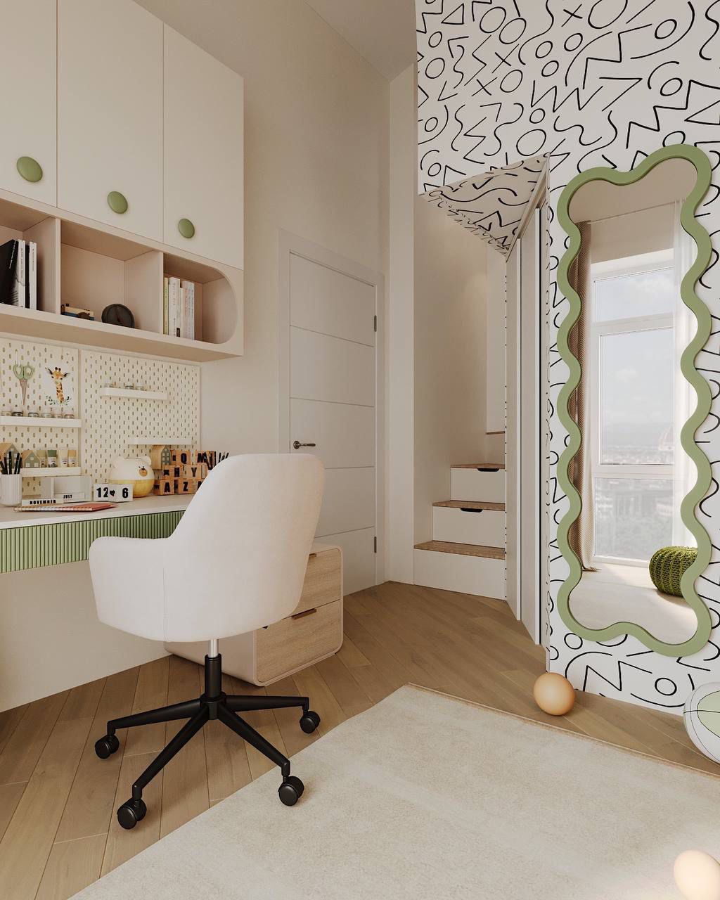 The two-level children’s room has a lower level intended for study and relaxation, and a convenient staircase leads to the upper level, where the bed is located.