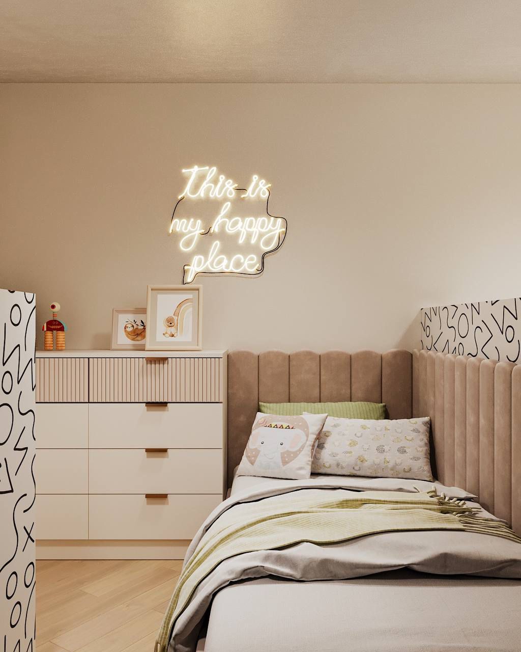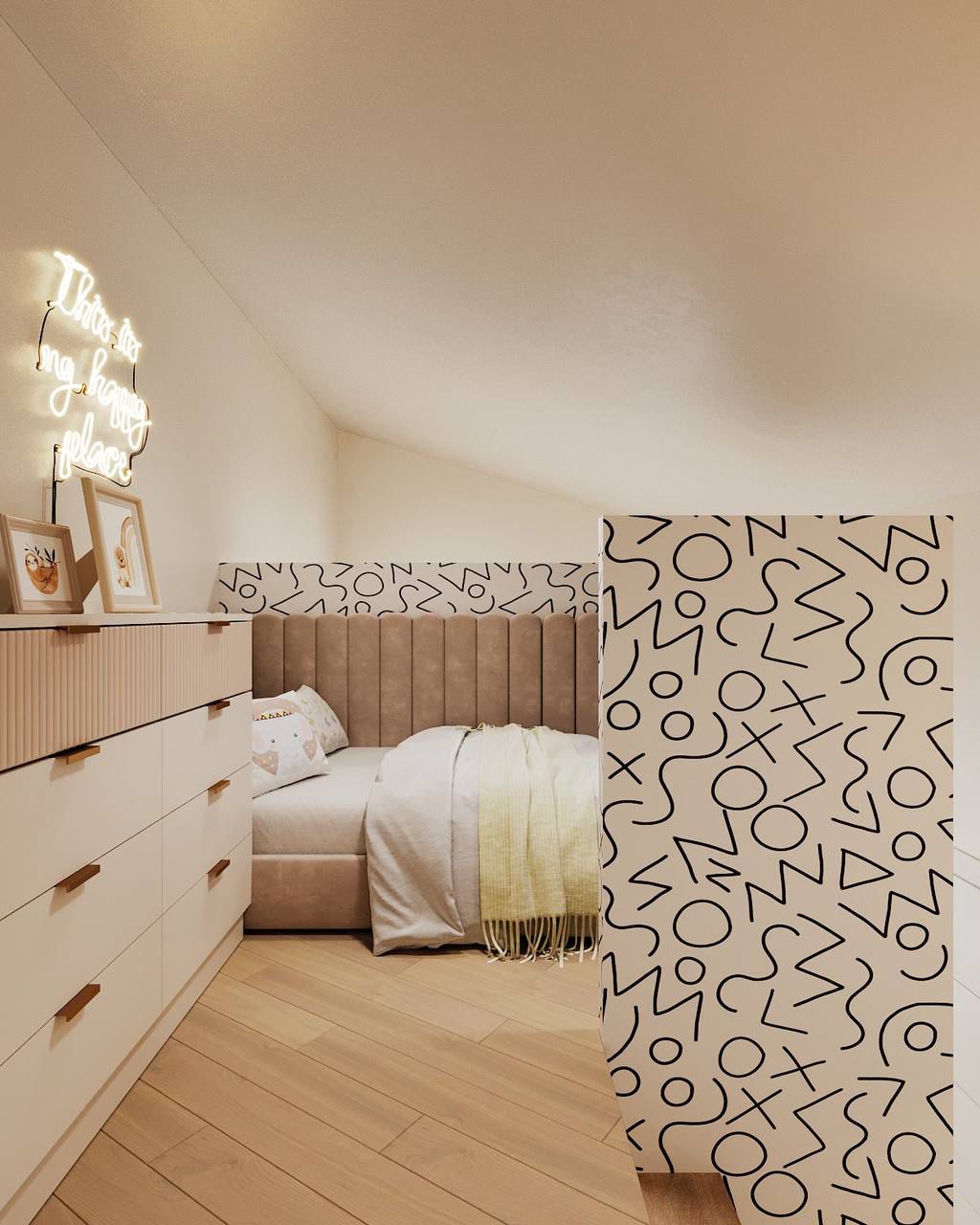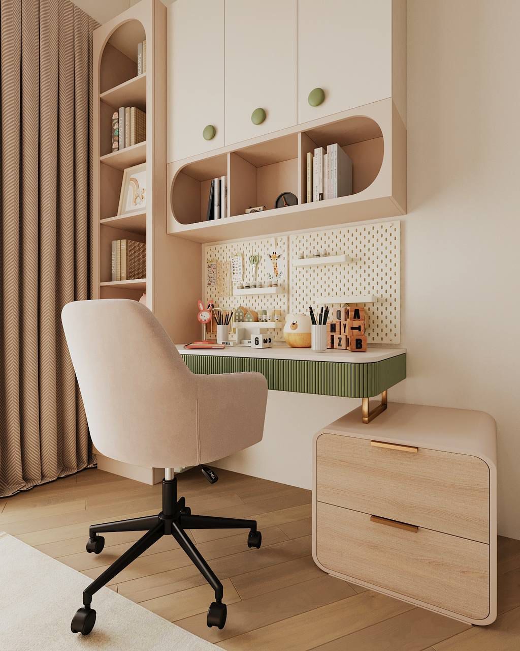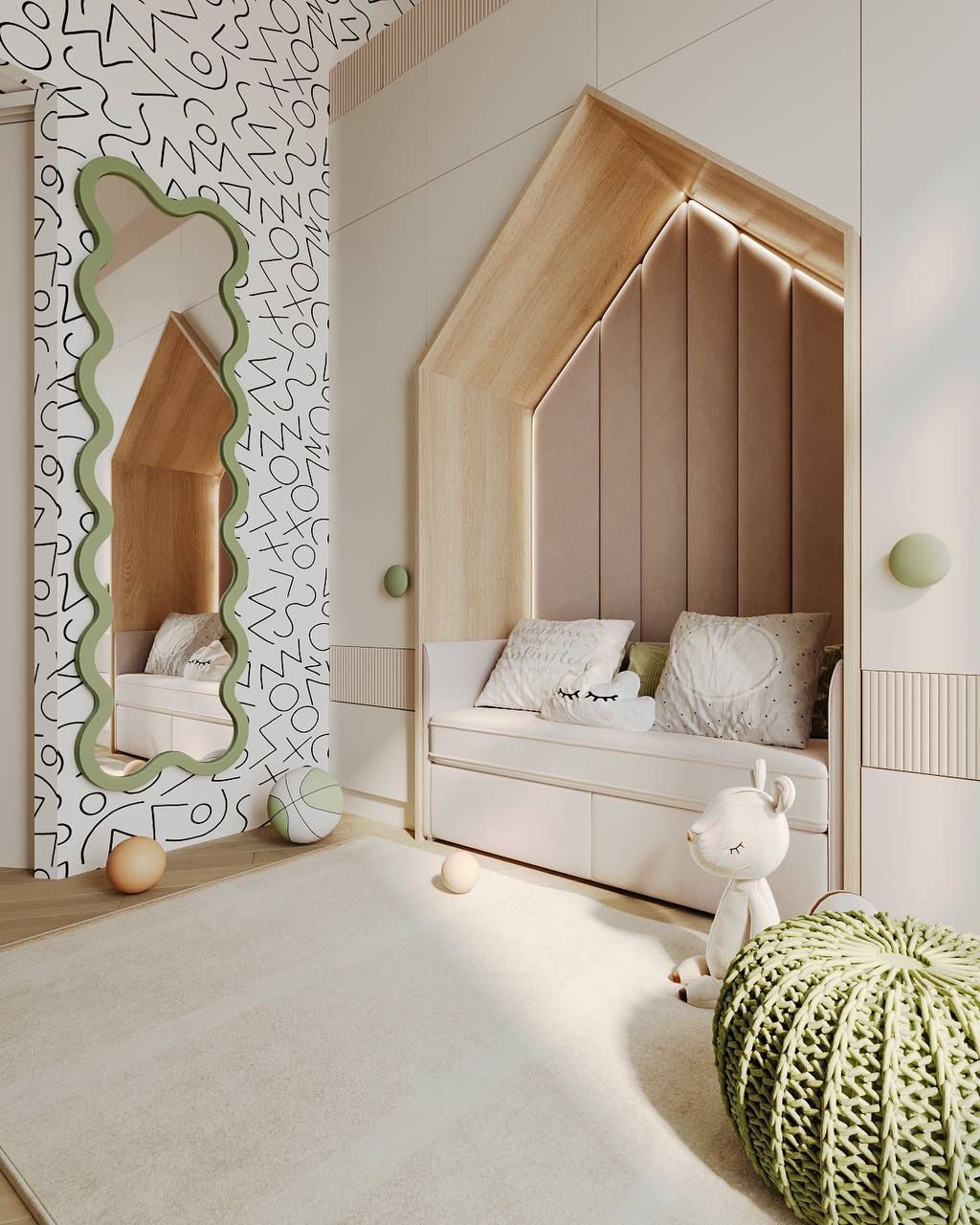 The two-level children’s room has a lower level intended for study and relaxation, and a convenient staircase leads to the upper level, where the bed is located.
