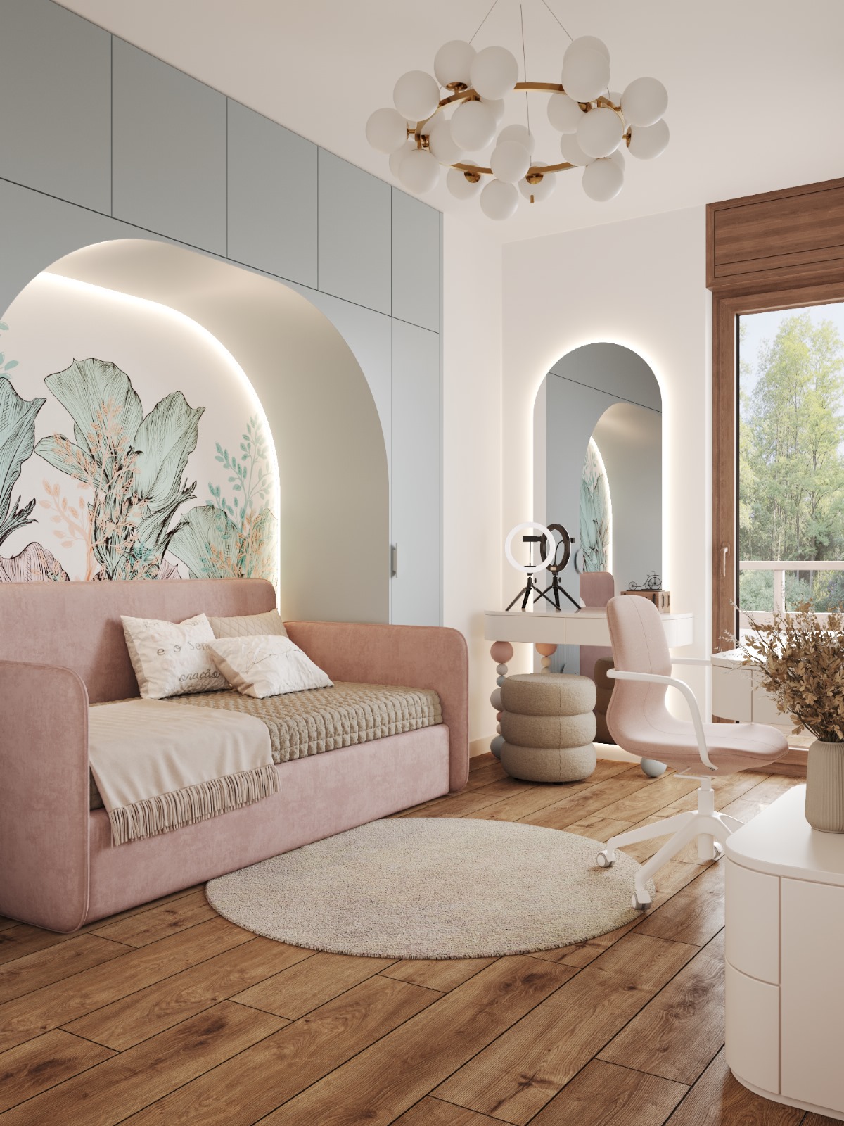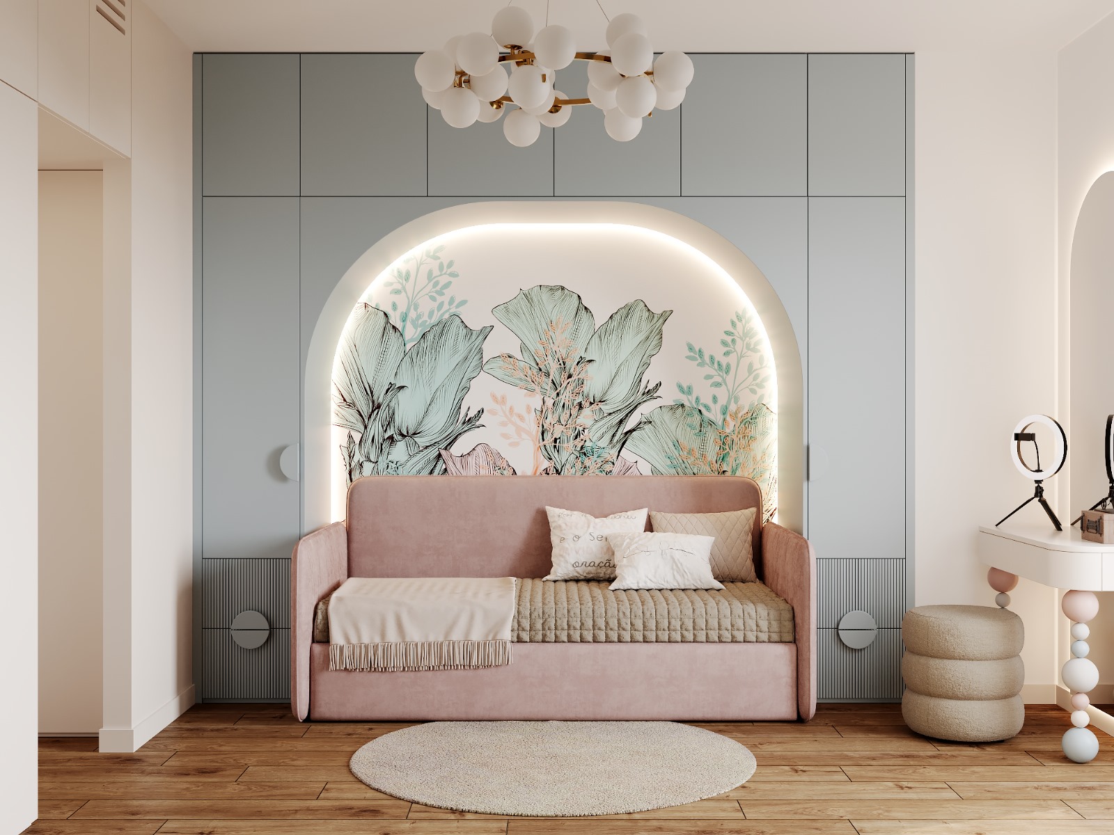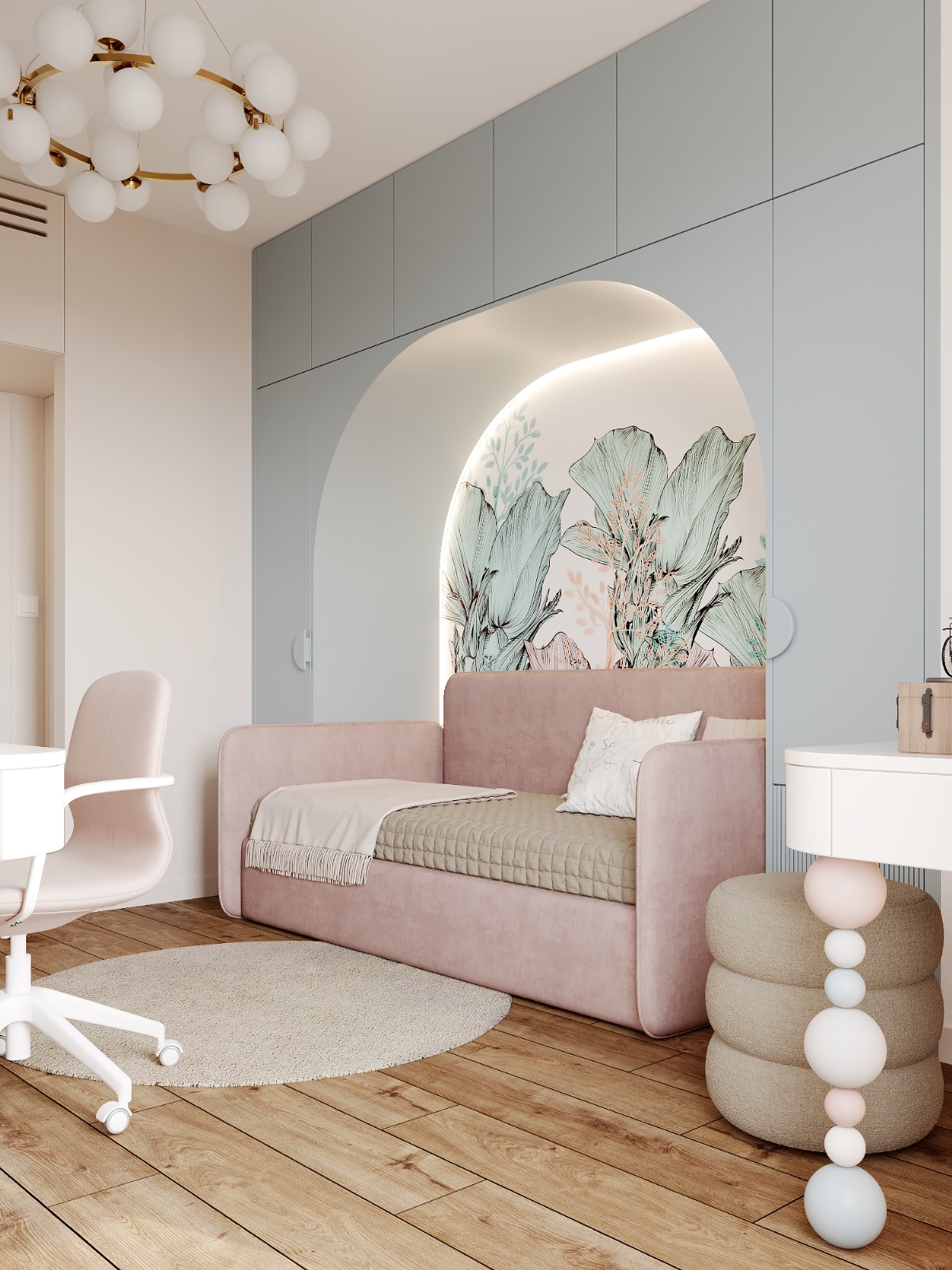 A modern room for a girl, which combines contrasting shades of blue and pink to create a fairy-tale atmosphere. Smooth lines and arches emphasize the elegance of space in this design.