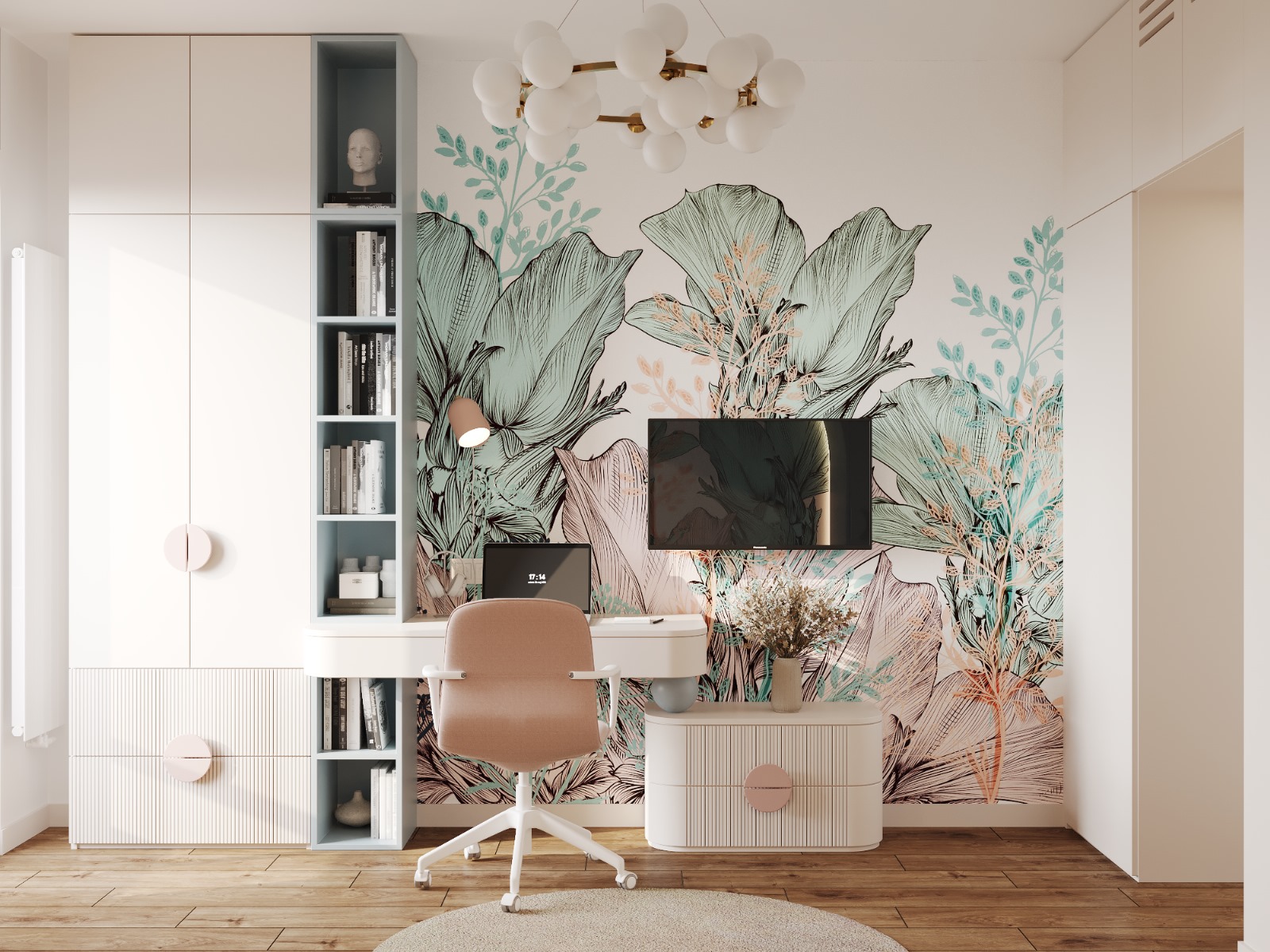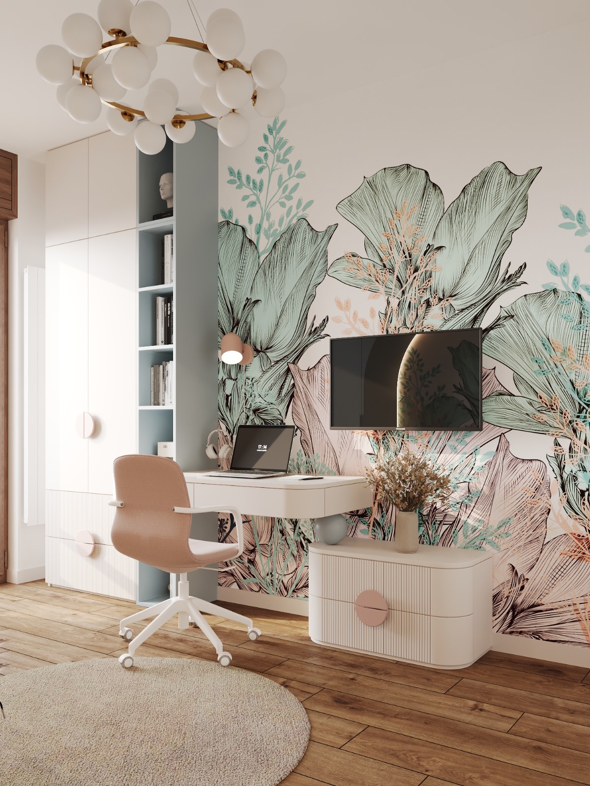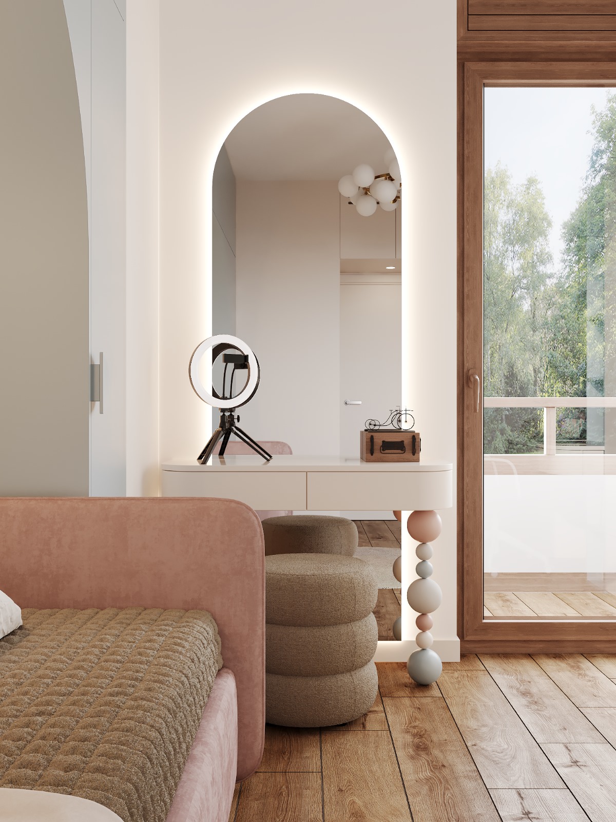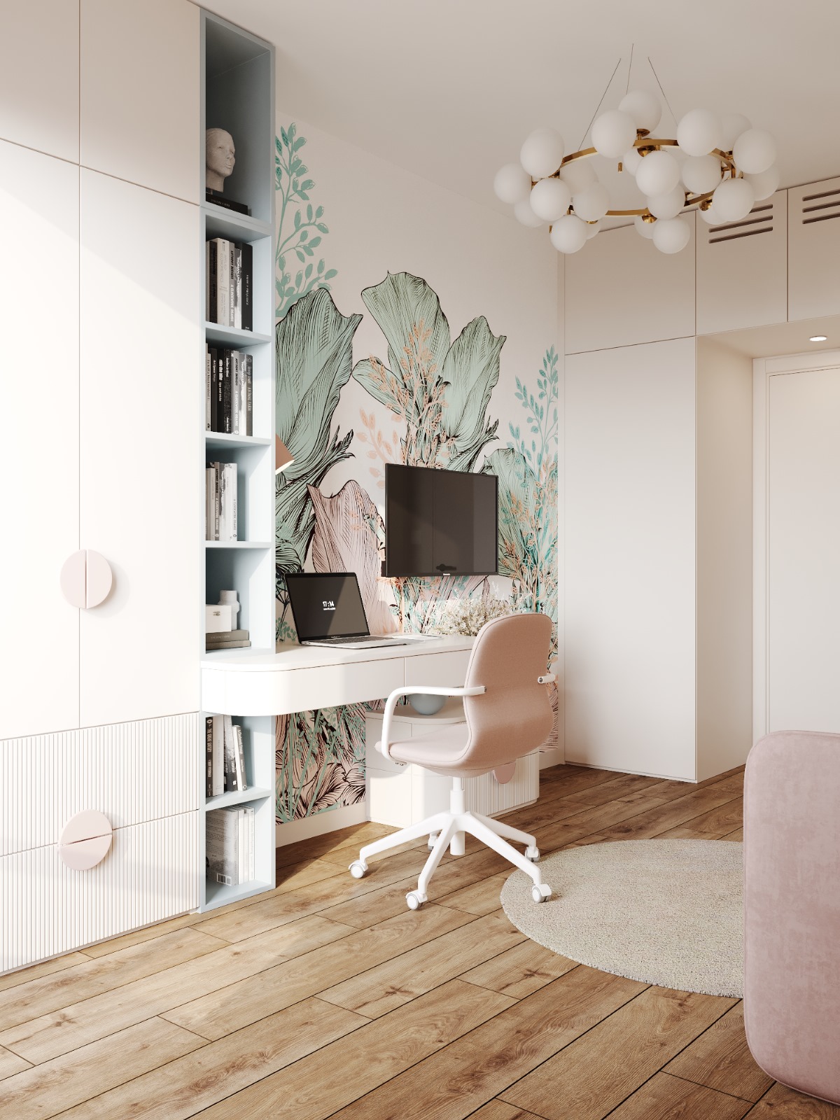 A modern room for a girl, which combines contrasting shades of blue and pink to create a fairy-tale atmosphere. Smooth lines and arches emphasize the elegance of space in this design.