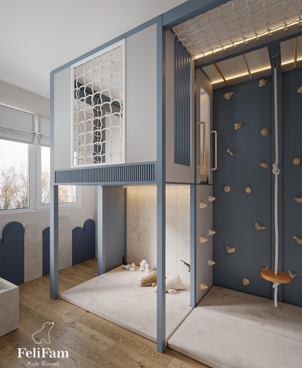 Therefore, we took into account his interests and created a space for active recreation. Climbing, ropes, ladders and other equipment create conditions for the child’s physical development and fun entertainment at home.