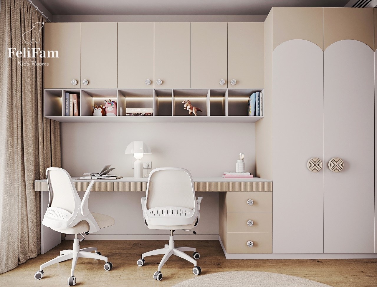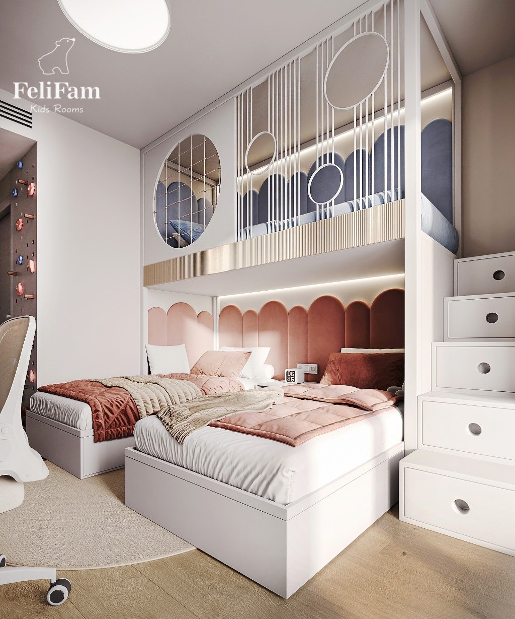 We know how to create a comfortable and functional space even for three children. It is important not only to place the furniture, but also to correctly separate the zones so that each child has their own corner for relaxation, study and games.