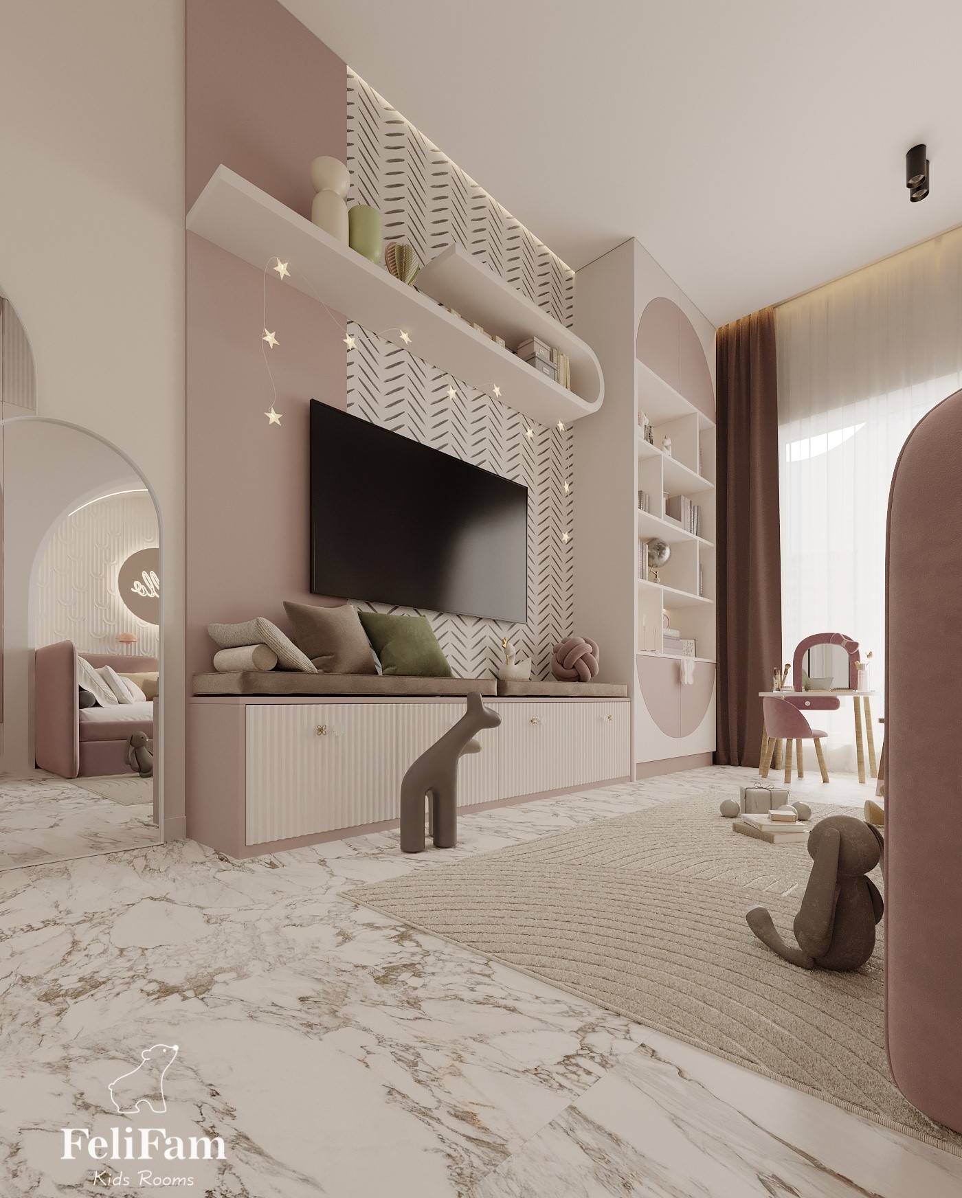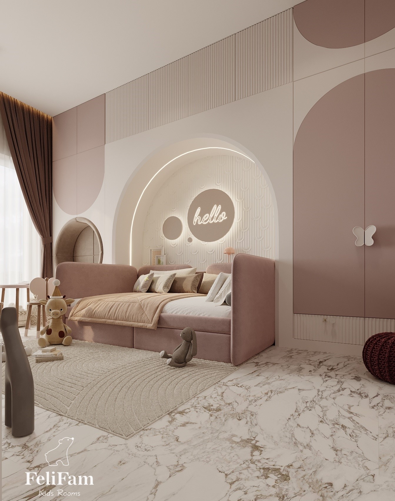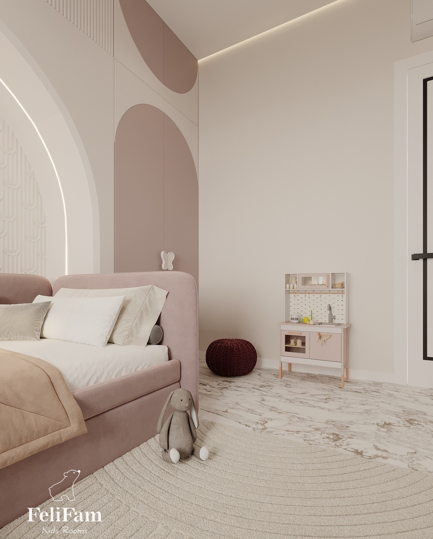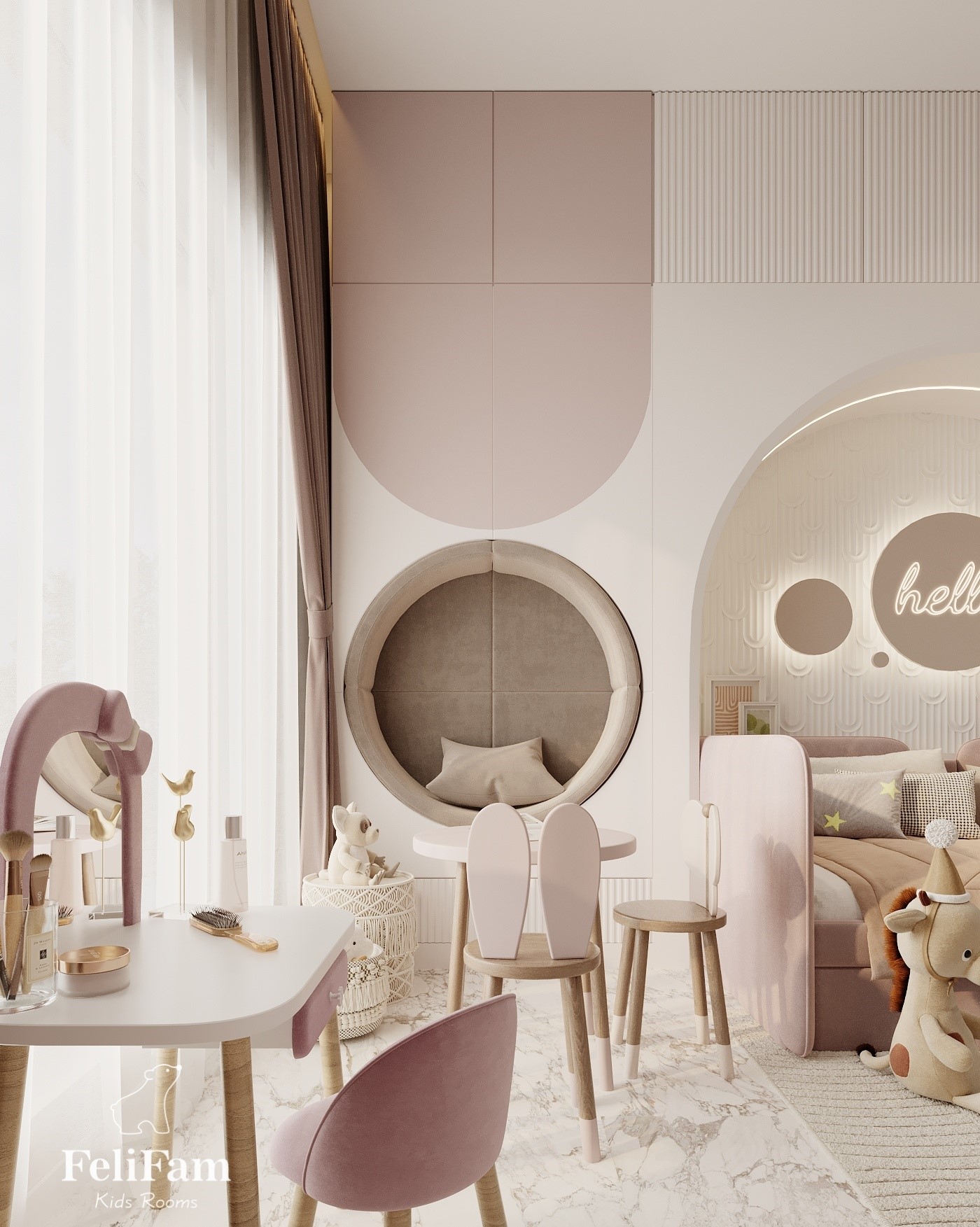 The bunk bed not only saves space, but also adds a dynamic and modern look to the room. The study area with a comfortable desk and bookshelves is designed for convenience and concentration on studies. The makeup table is her personal corner where Alessandra can experiment with looks.