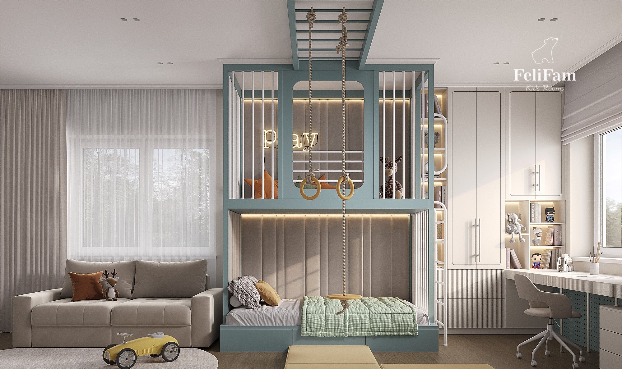 In this project, we combined: a play area above the bed with ladders and a climbing frame, a spacious study area and a place to relax with a soft sofa and TV. And a convenient storage system in the form of a mirrored wardrobe will help maintain order.