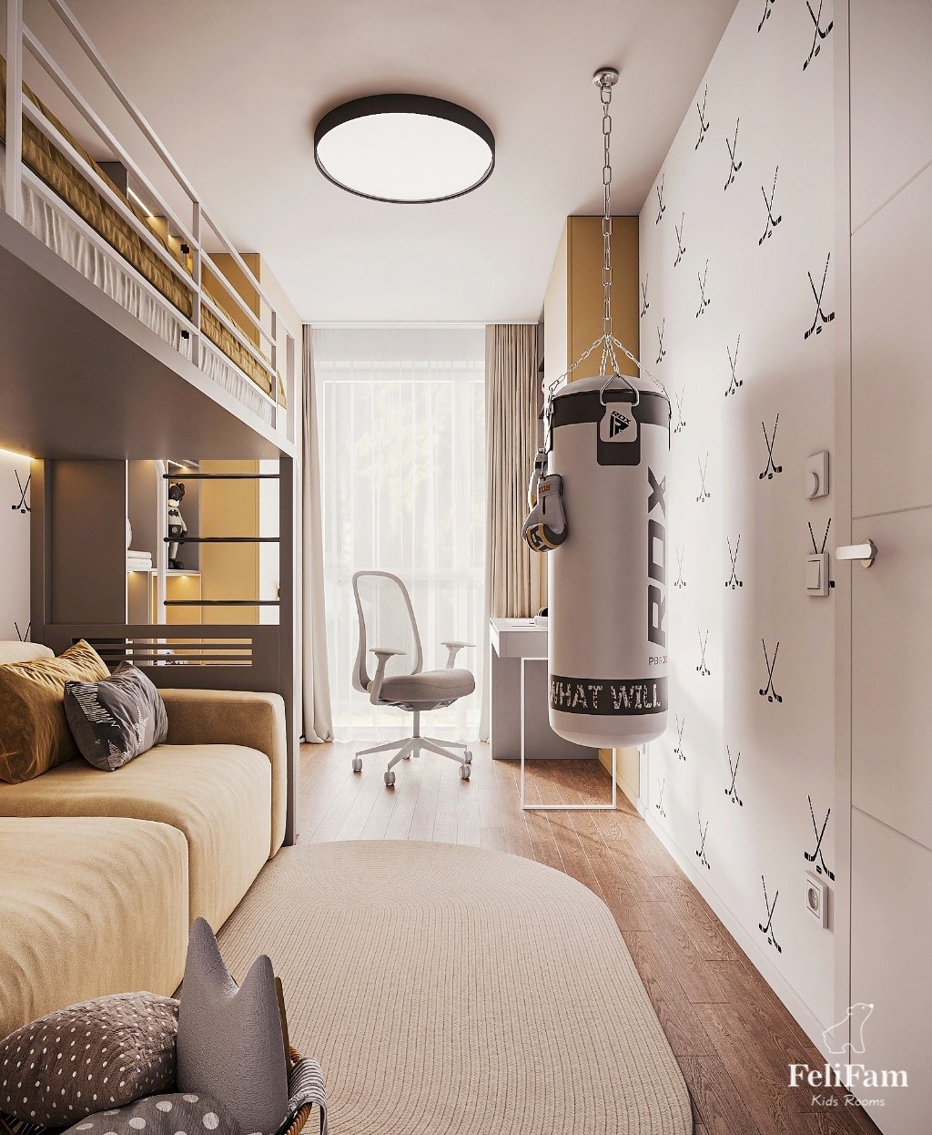 The upper level is for sweet dreams, and the lower one is for rest and games.