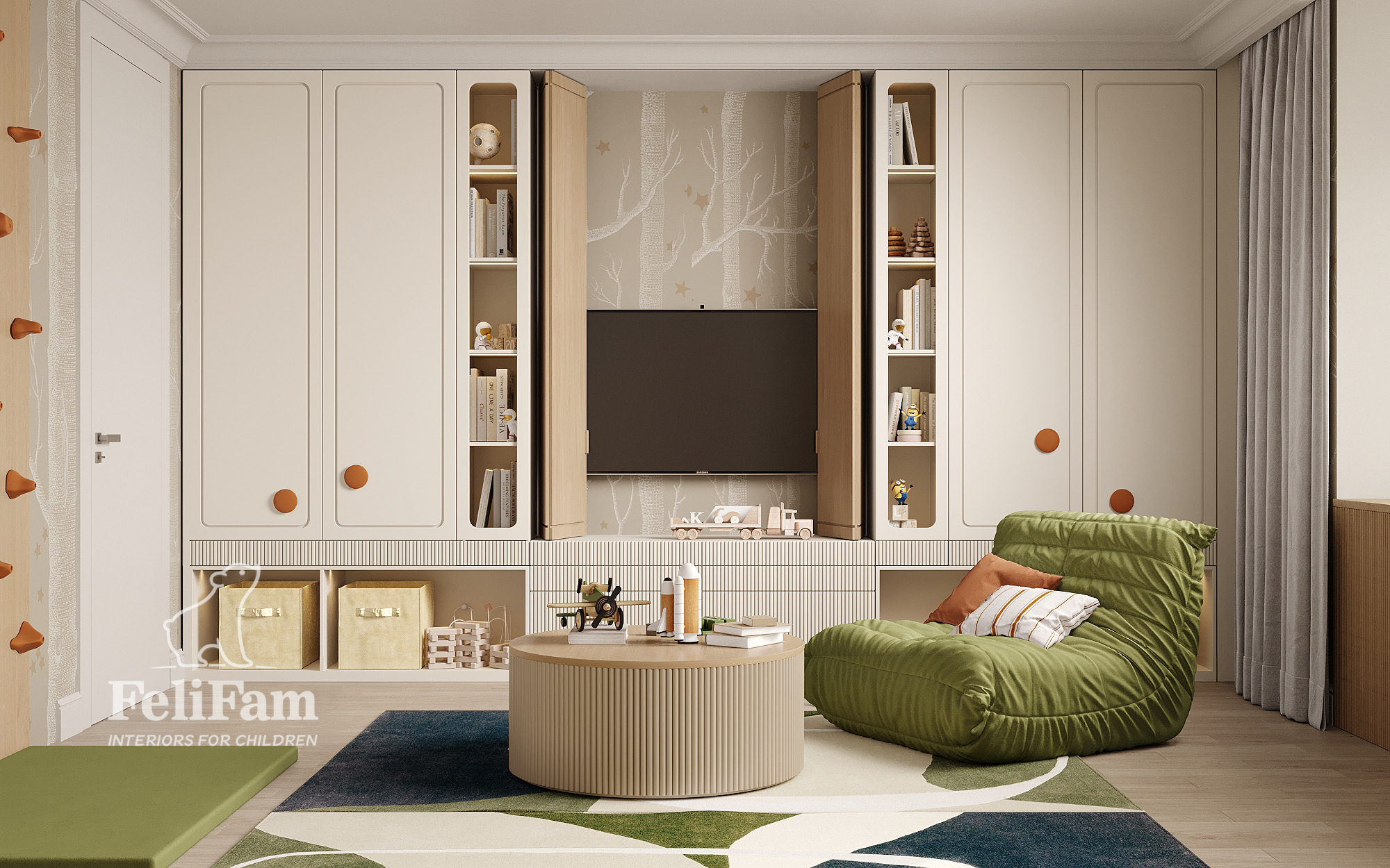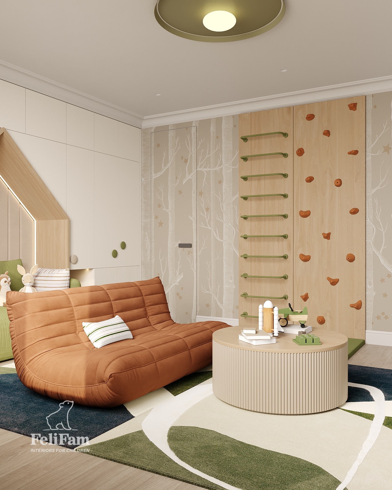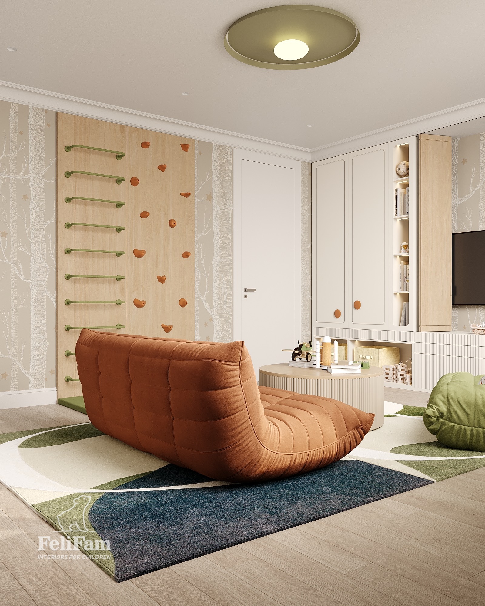 The project features soft seating in khaki and terracotta tones, a large round table for group activities, a climbing wall and ladder for physical exercise, as well as integrated storage solutions. For safety, the TV is concealed within the furniture, allowing the space to be used actively without risk.