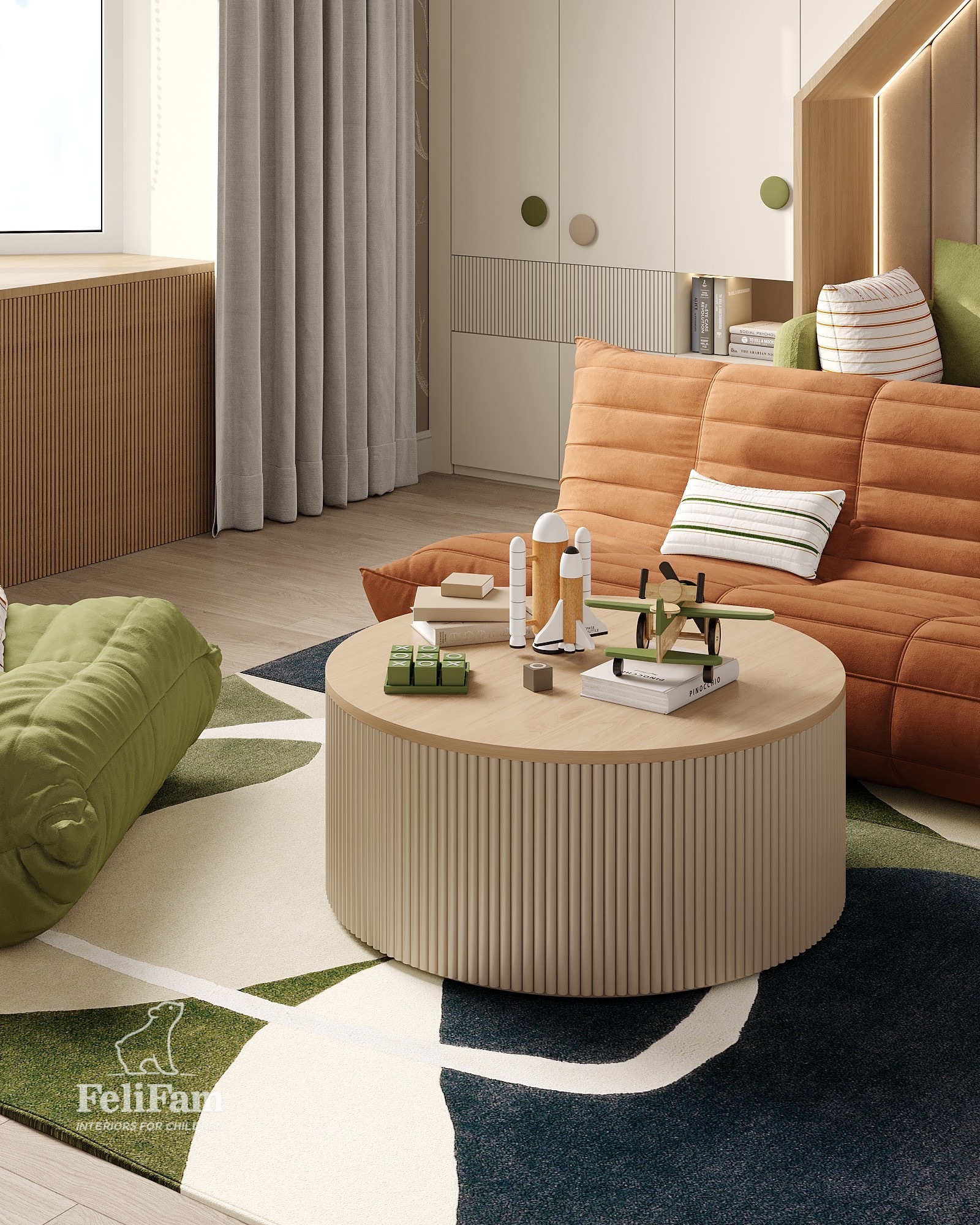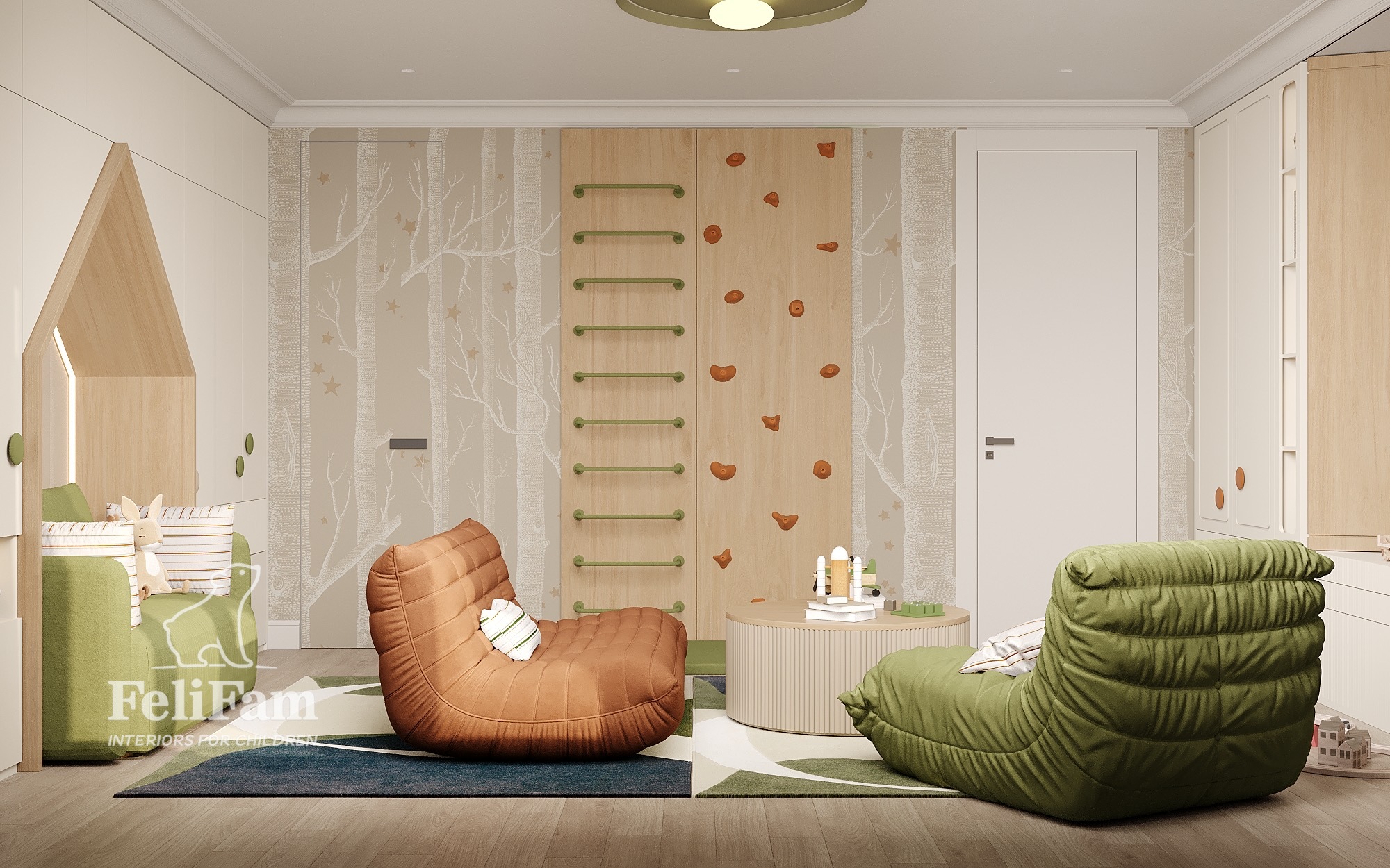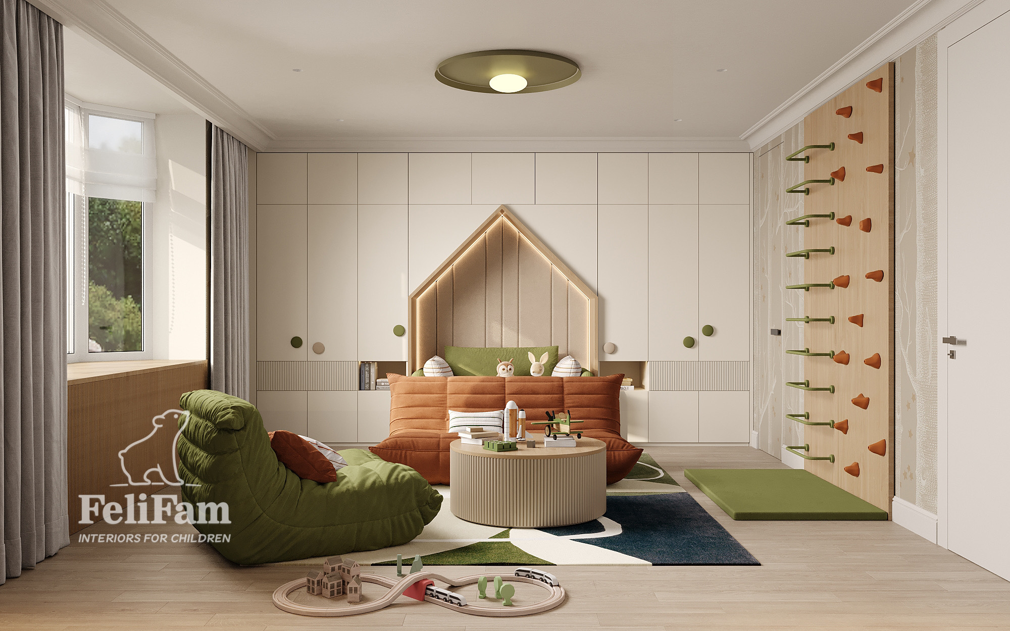 The project features soft seating in khaki and terracotta tones, a large round table for group activities, a climbing wall and ladder for physical exercise, as well as integrated storage solutions. For safety, the TV is concealed within the furniture, allowing the space to be used actively without risk.