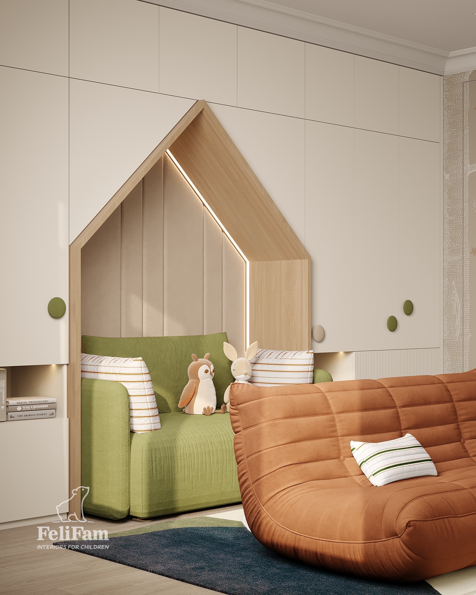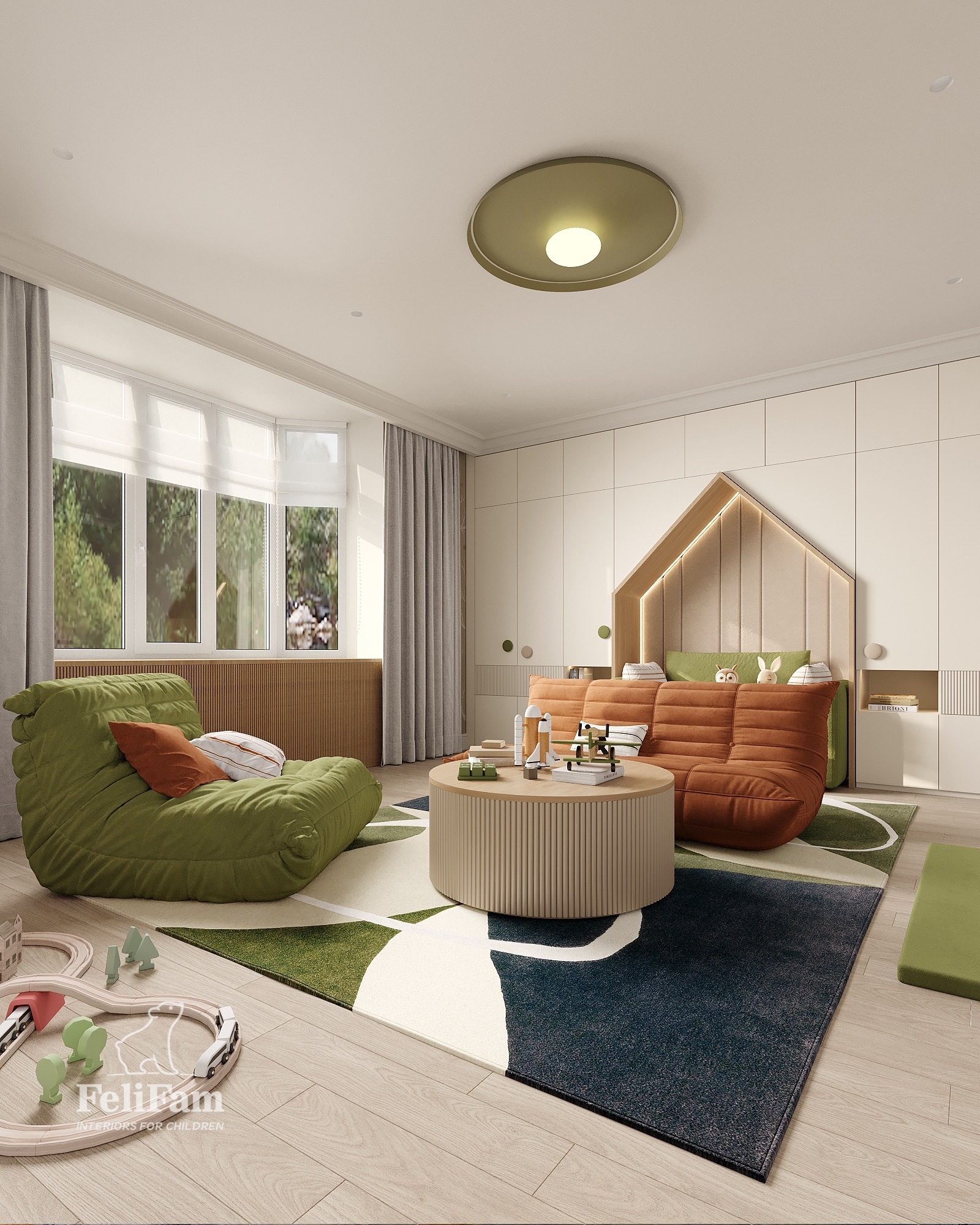 A compact yet functional children’s play and creative area, designed for kids to play, explore, and engage in creative activities within a thoughtfully organized space. The layout seamlessly combines active play with quieter activities, ensuring comfort for children of different ages.