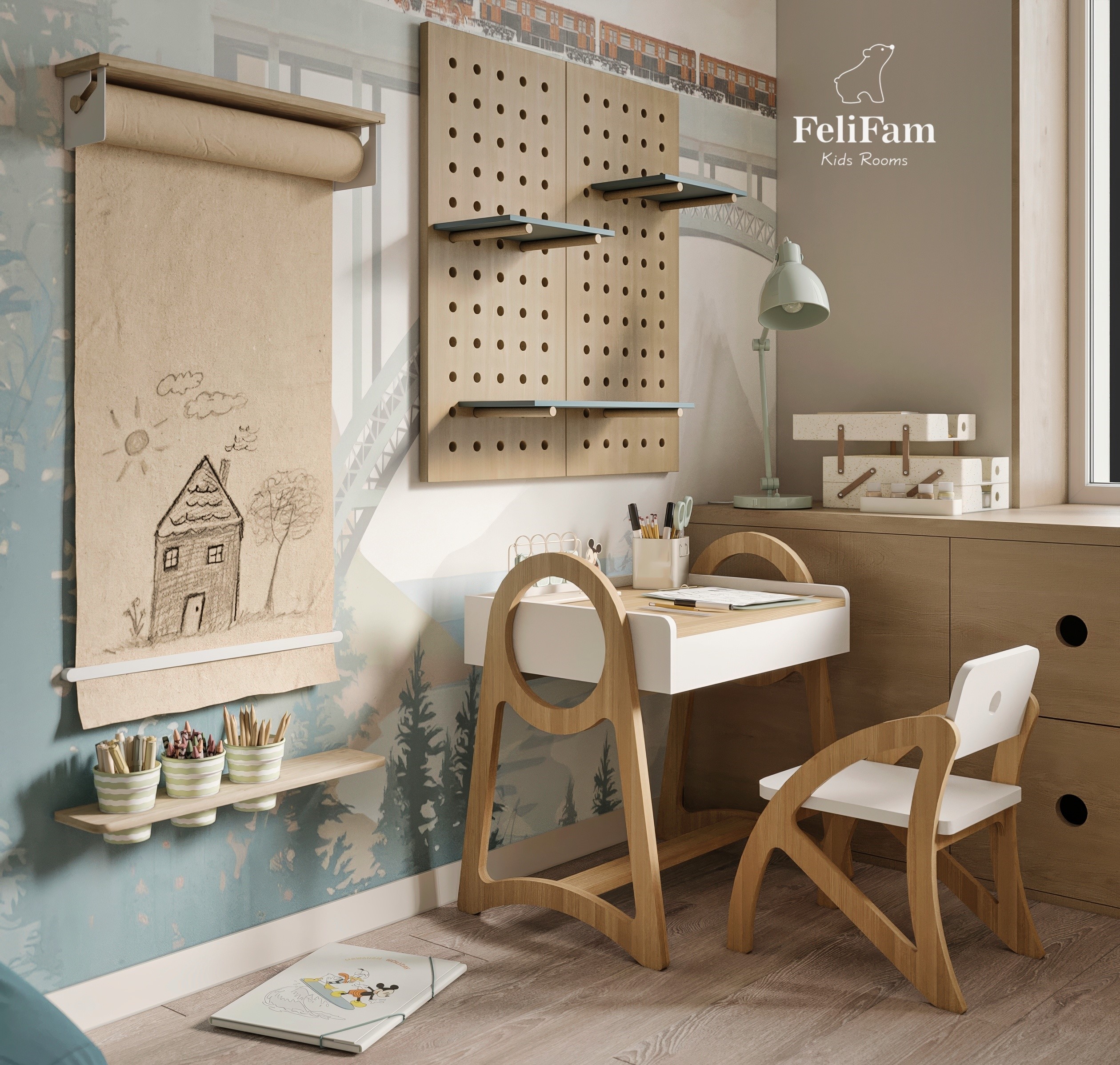 Photo wallpapers with wonderful natural motifs have become a real accent in the room, adding magic and warmth to it. An important element of the design are wooden elements and accents that emphasize the naturalness of the interior, creating a cozy atmosphere for the child.