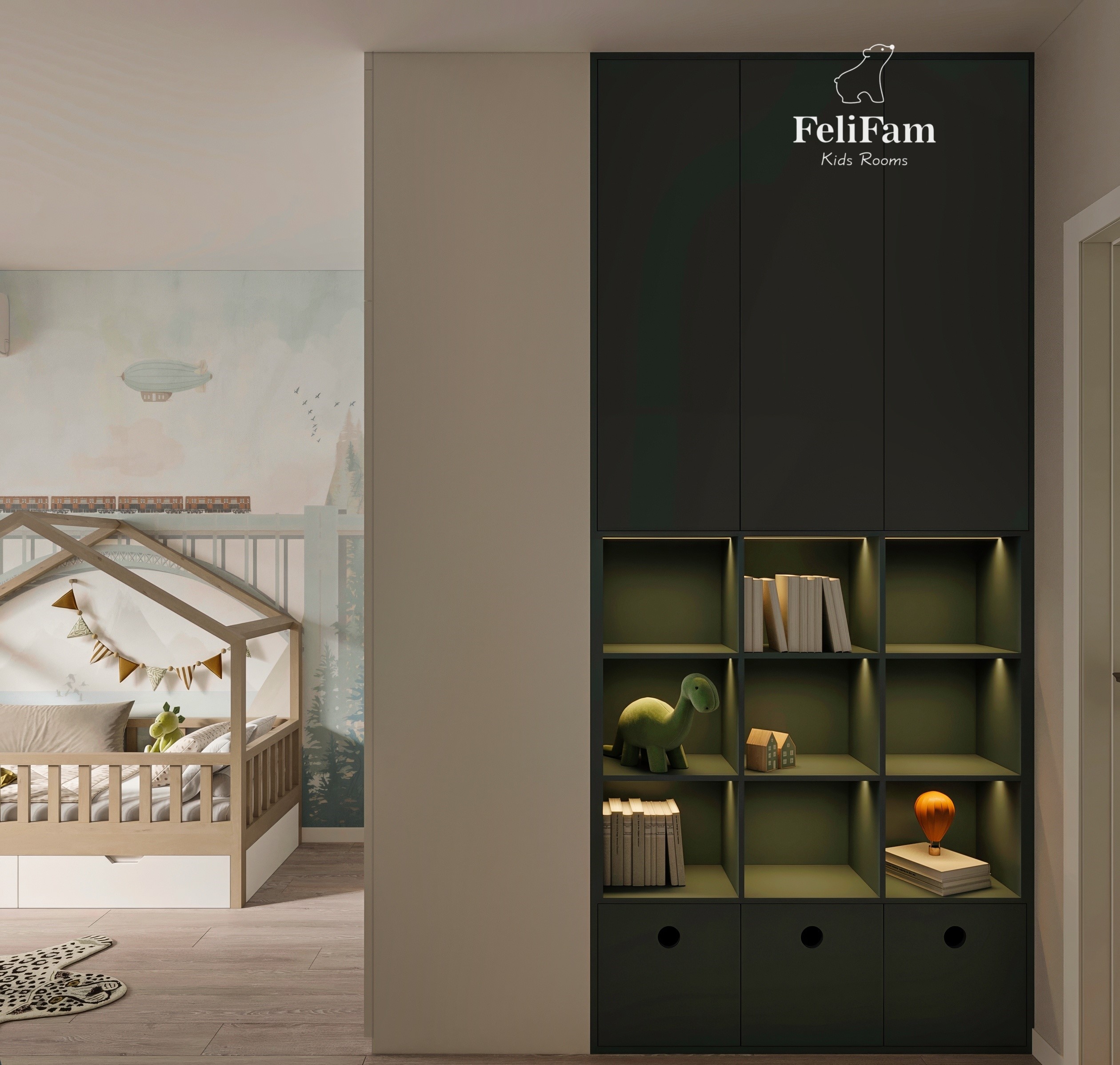 The space is divided into functional areas: play, for relaxation and for learning, which makes it possible to form positive habits in the child from an early age.