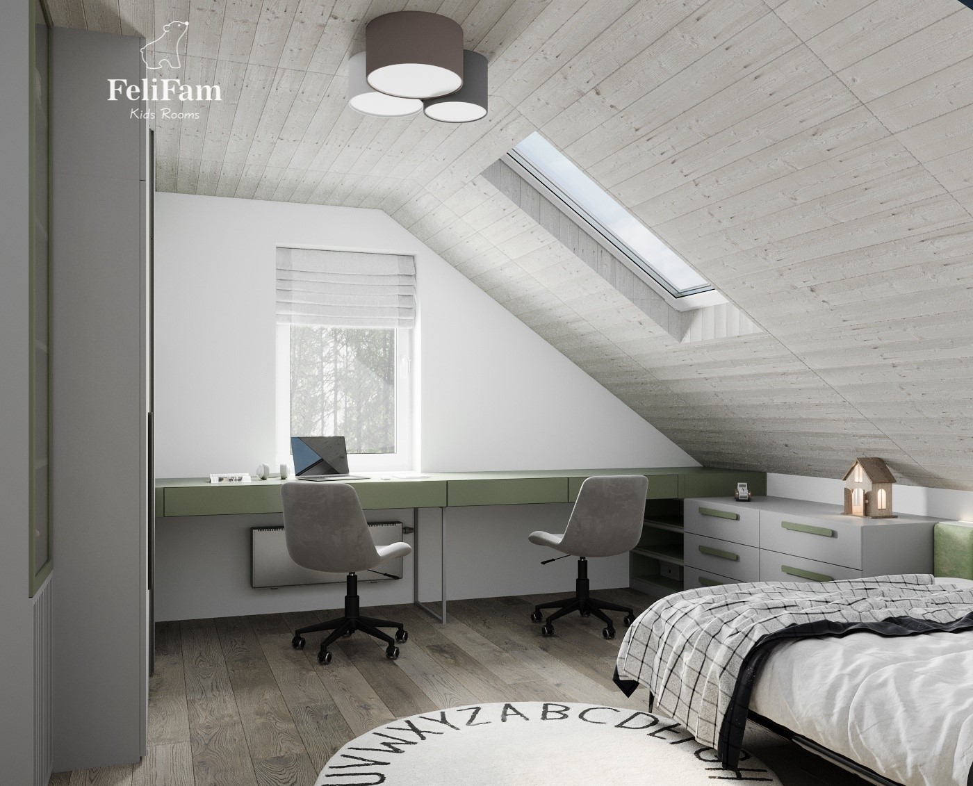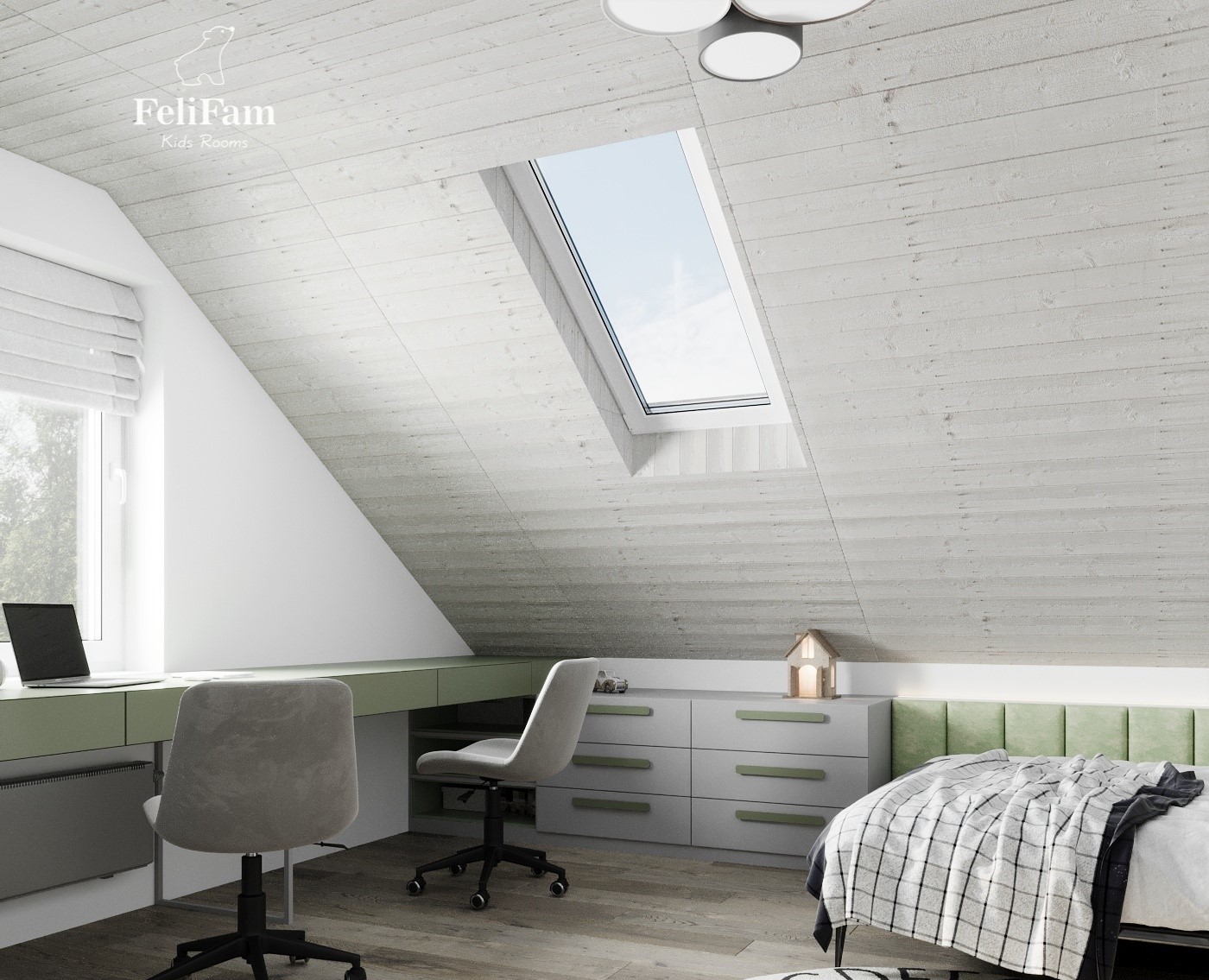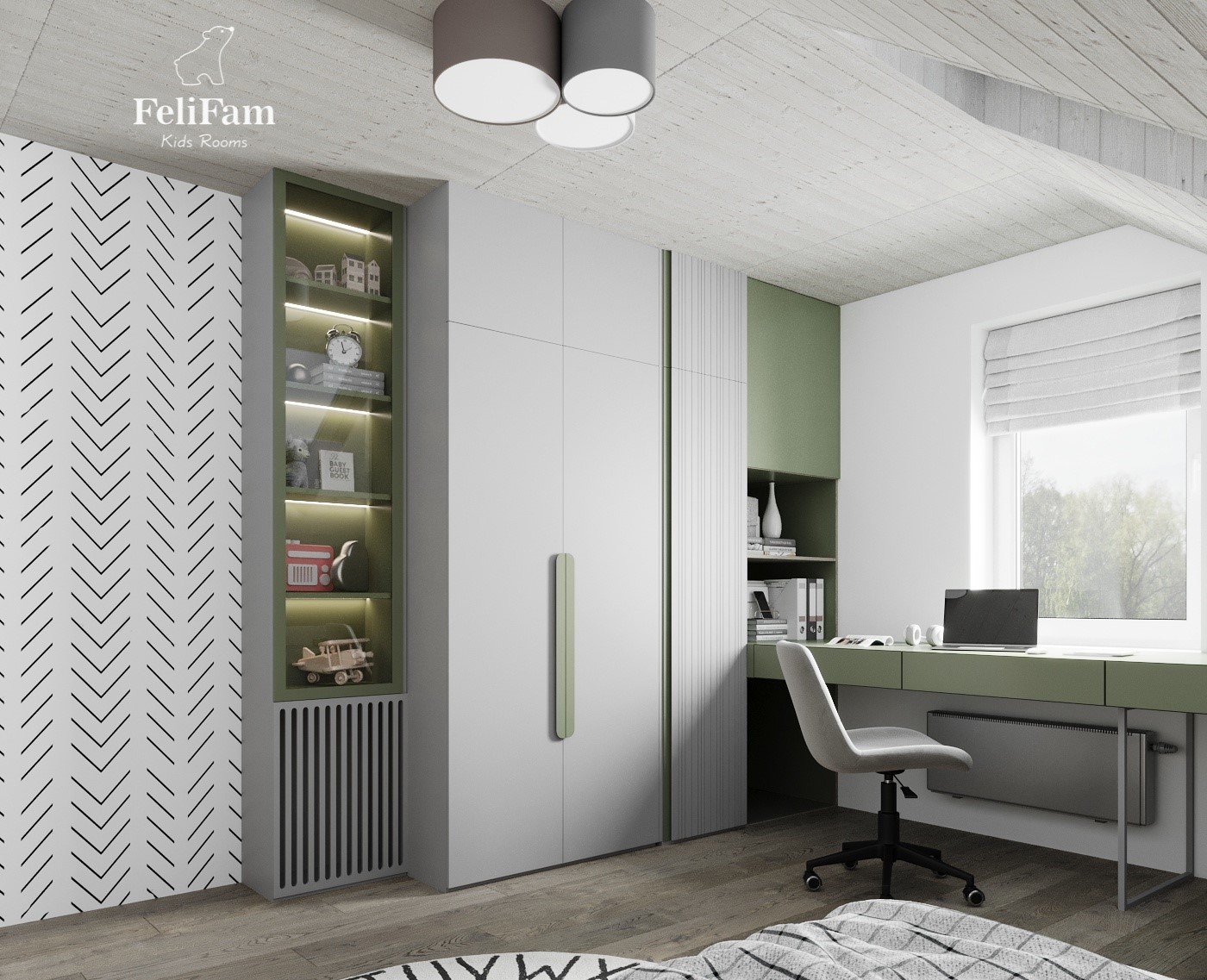 In this project, each element has its own place: a storage area, a study area, and a relaxation area. They are harmoniously combined, leaving enough free space for the child. Functional and stylish!