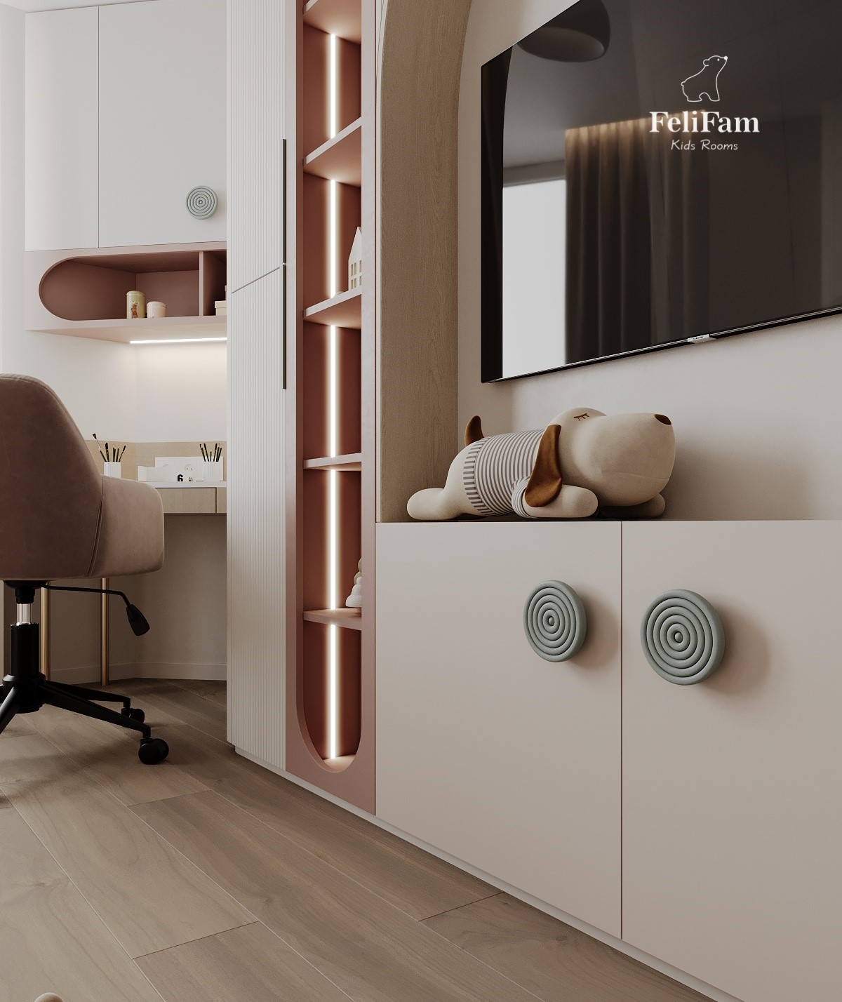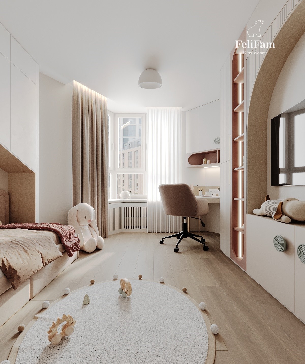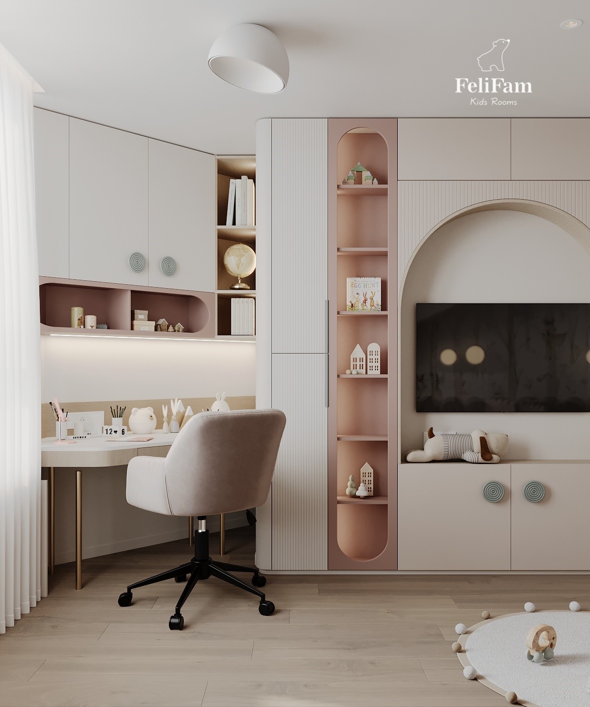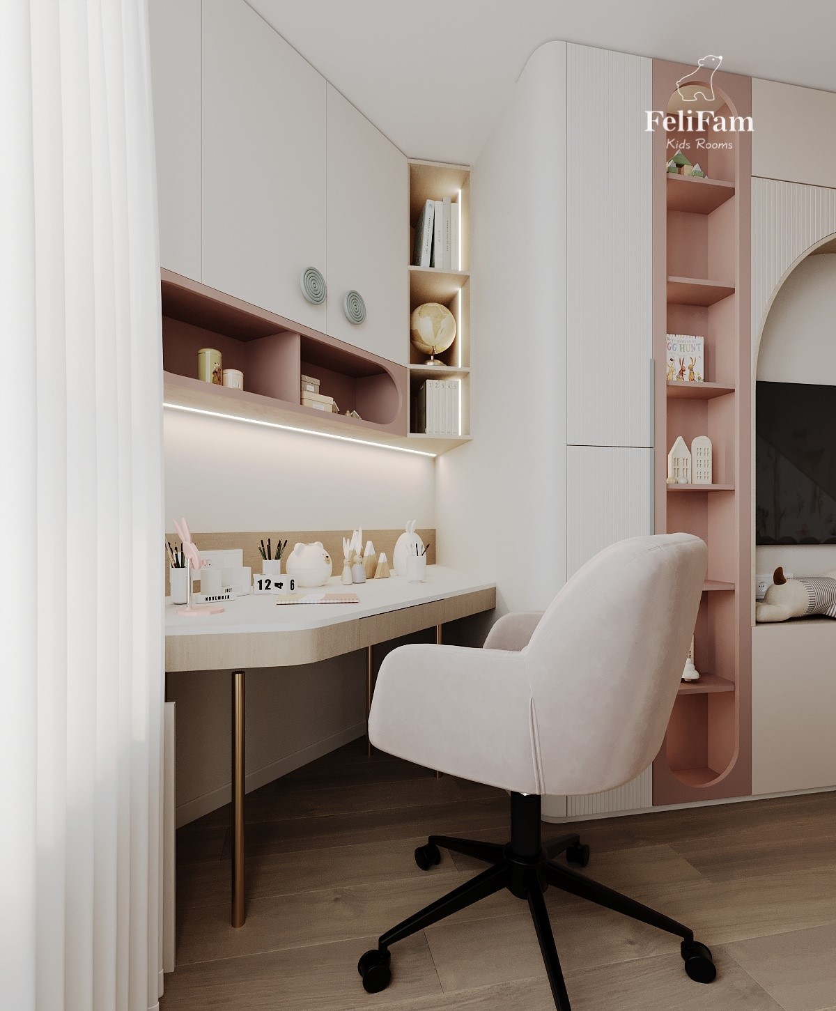 This interior emphasizes the individuality of girls, gives inspiration for creativity and creates a harmonious space for relaxation, study and hobbies!