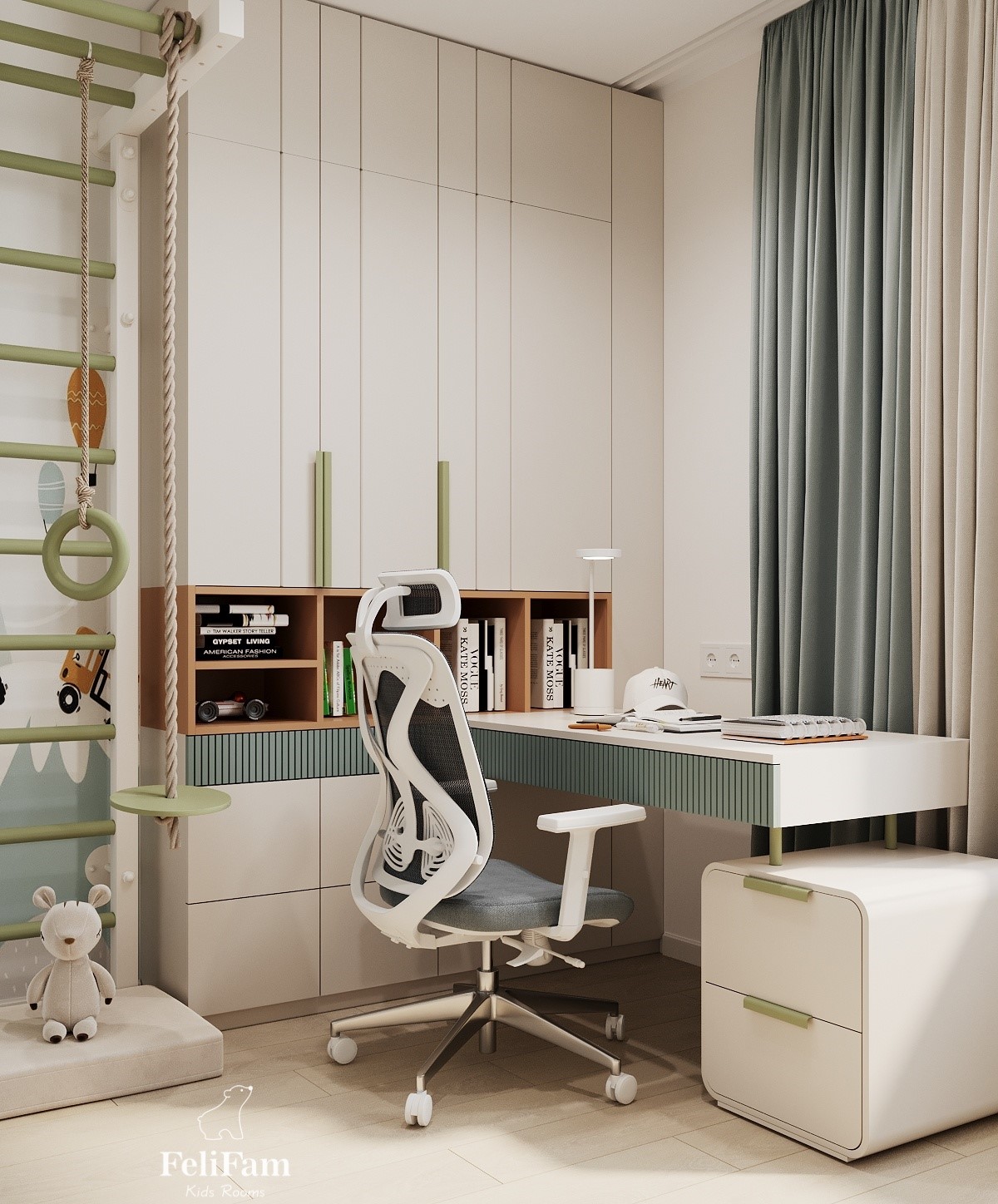 This laconic design allows you to keep the space organized and comfortable, where each element of furniture and decor performs its function, and the colors create a wonderful atmosphere for development and relaxation.