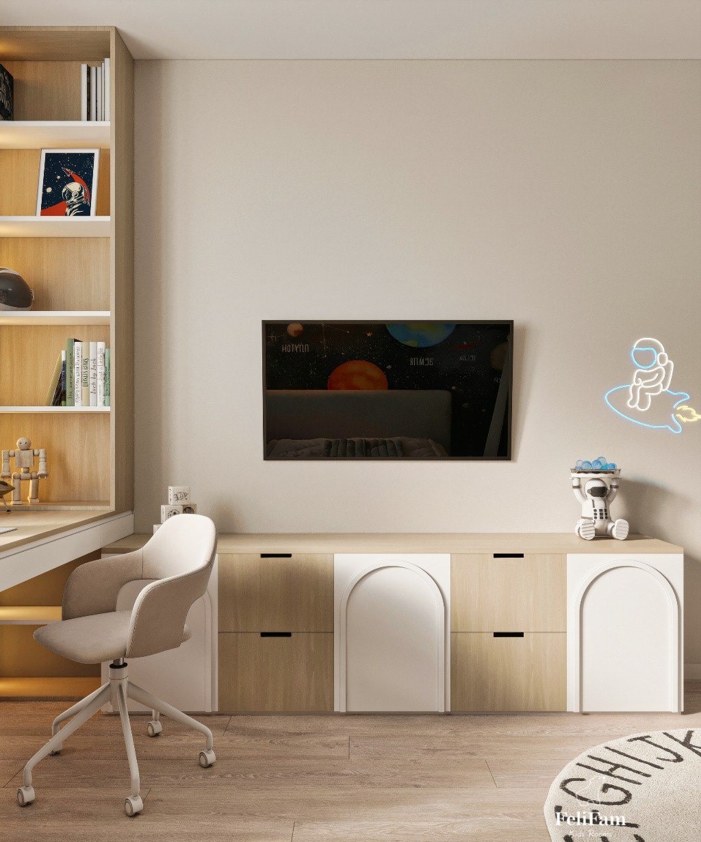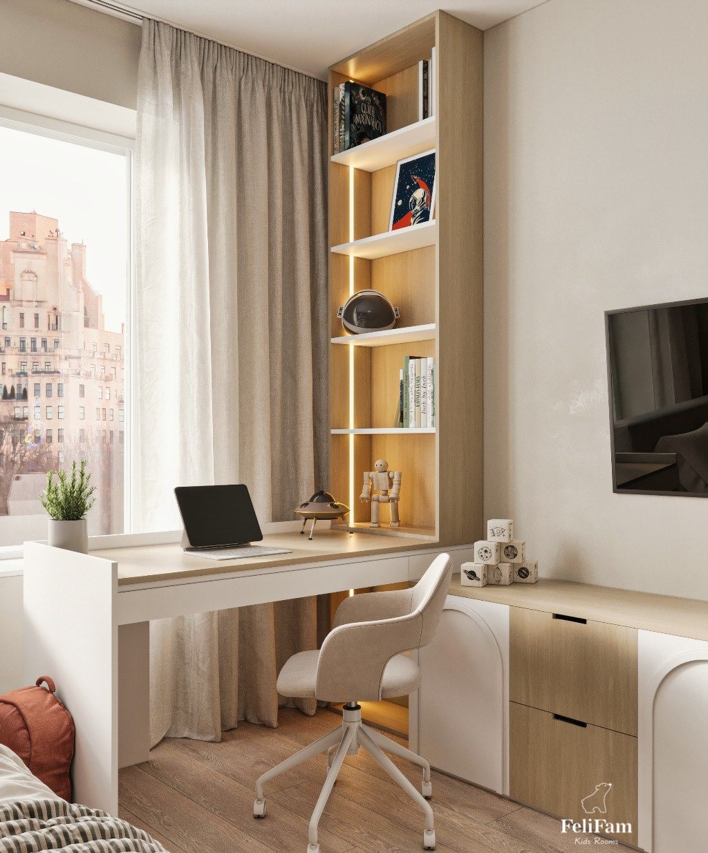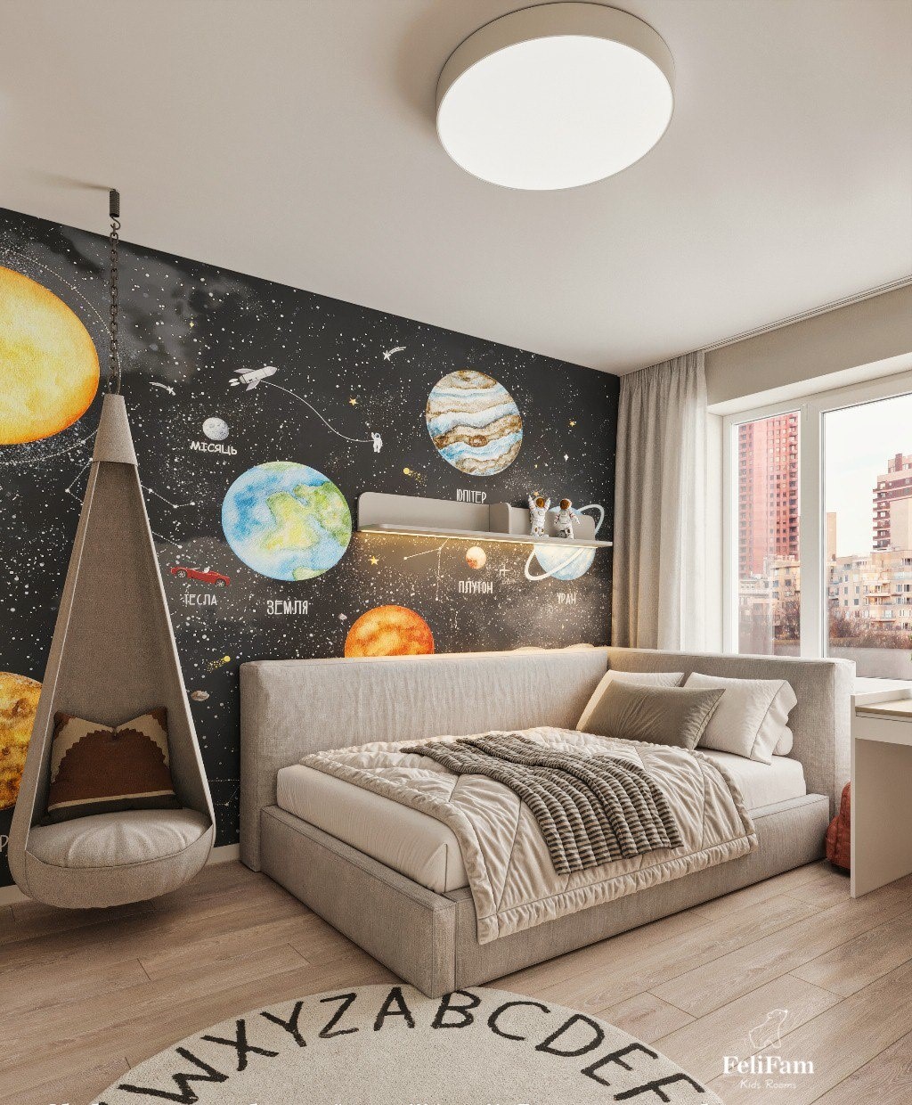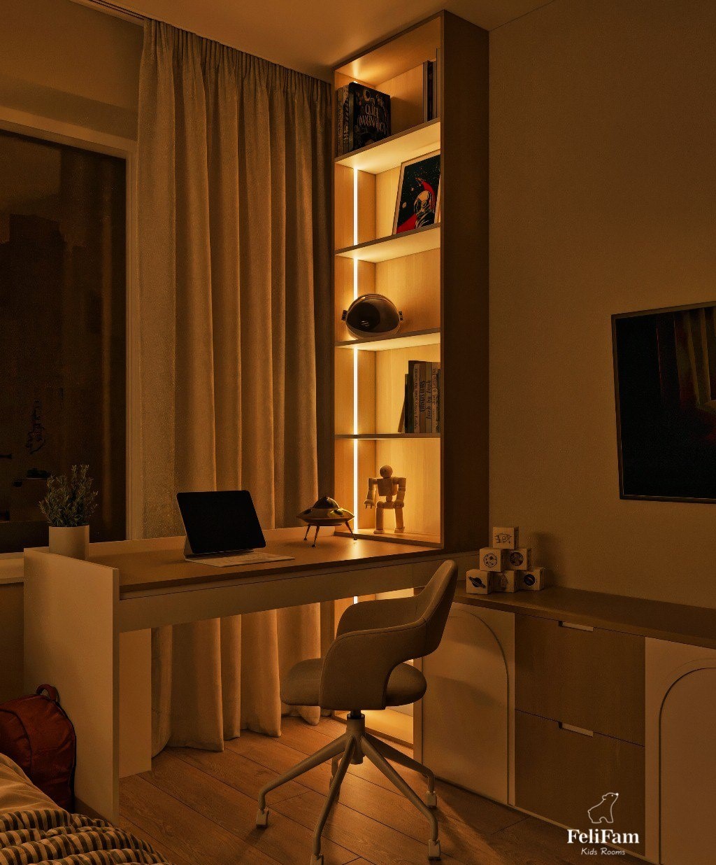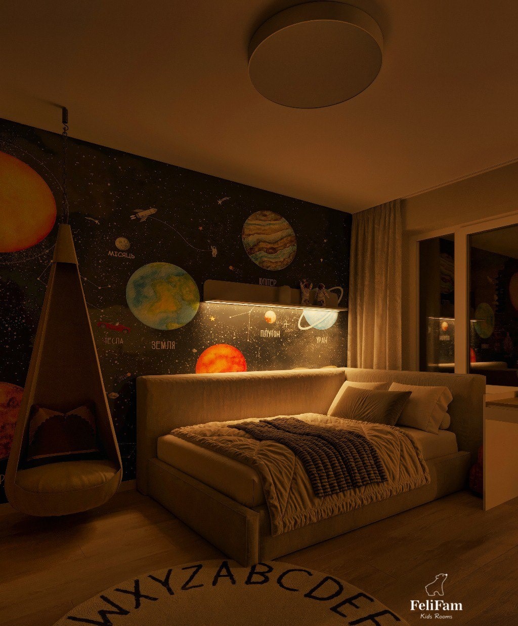 Children’s Room for Exploration and Discovery This space is created for a boy who explores the world, dreams, and develops every day! The room features many interactive elements that combine play and learning: a climbing wall for physical development, a magnetic or chalkboard wall for creativity, and a zone for construction and discoveries. Natural shades and materials create an atmosphere of harmony and tranquility, helping the child to focus, imagine, and relax. This is not just a room; it’s an environment that supports curiosity, independence, and active growth. Here, the boy doesn’t just live — he discovers new horizons every day!