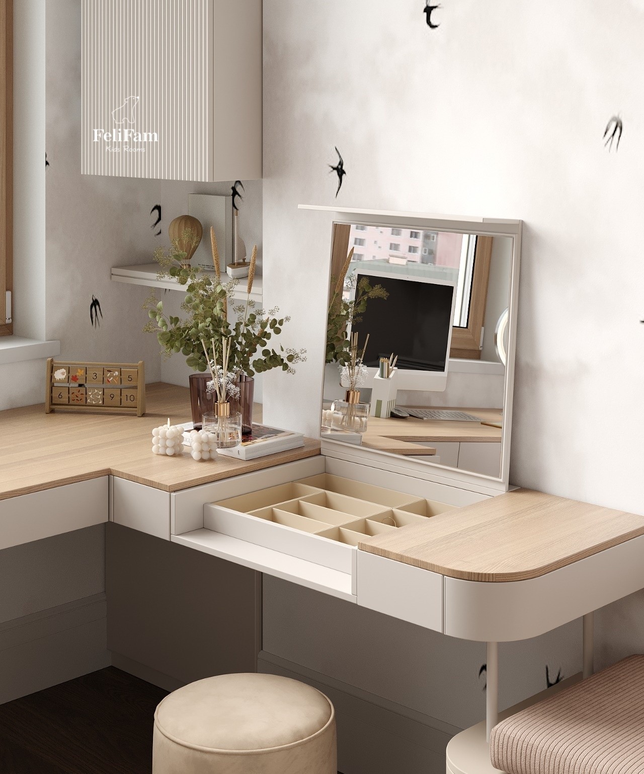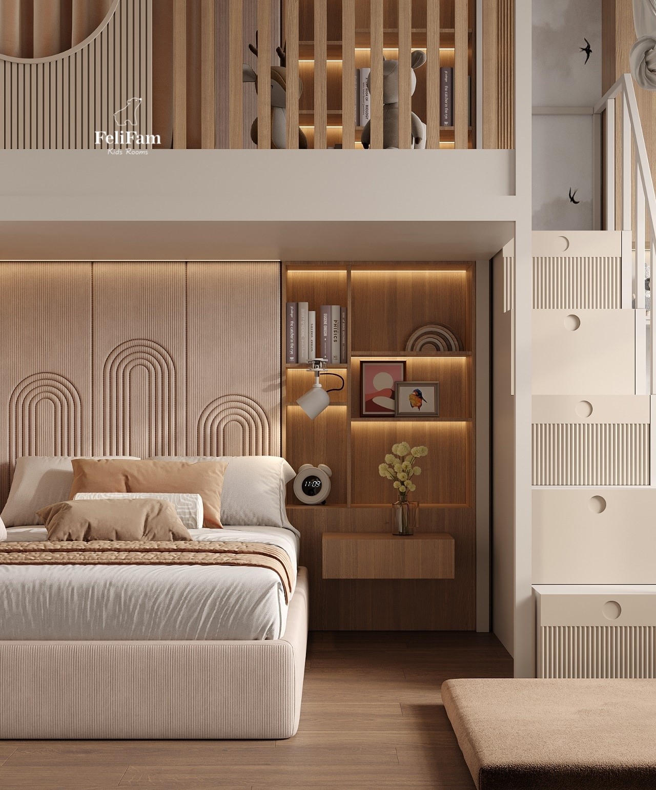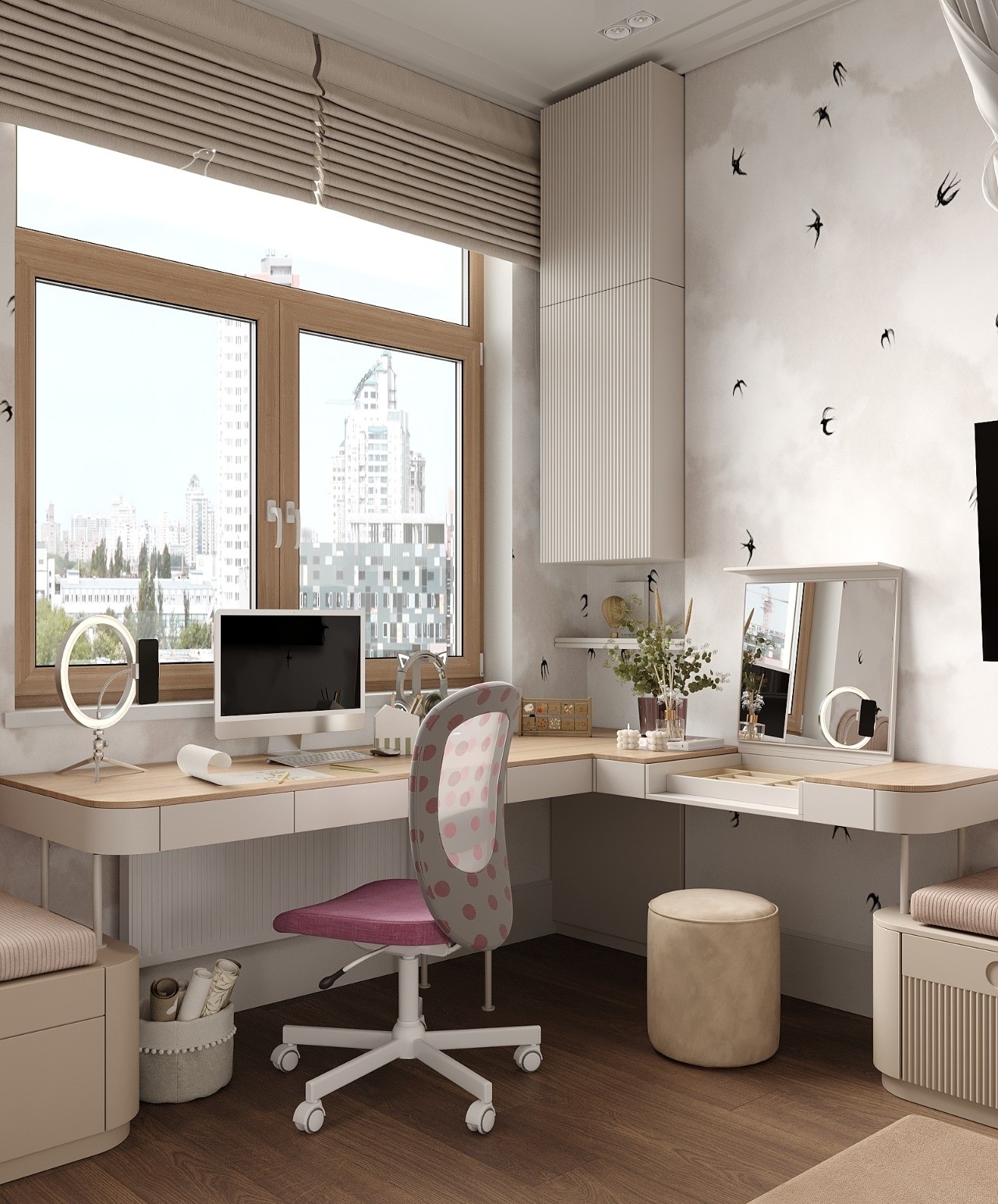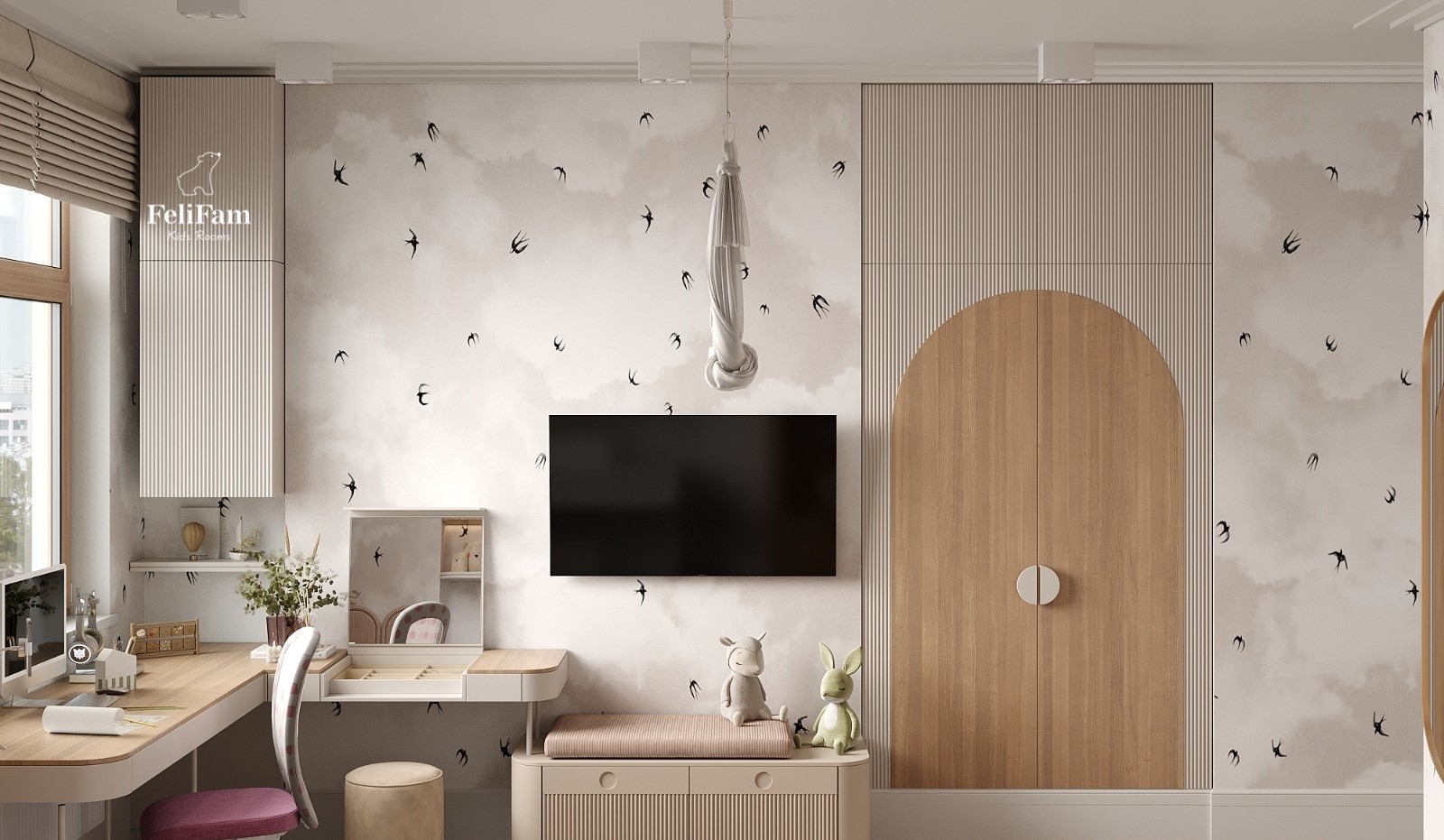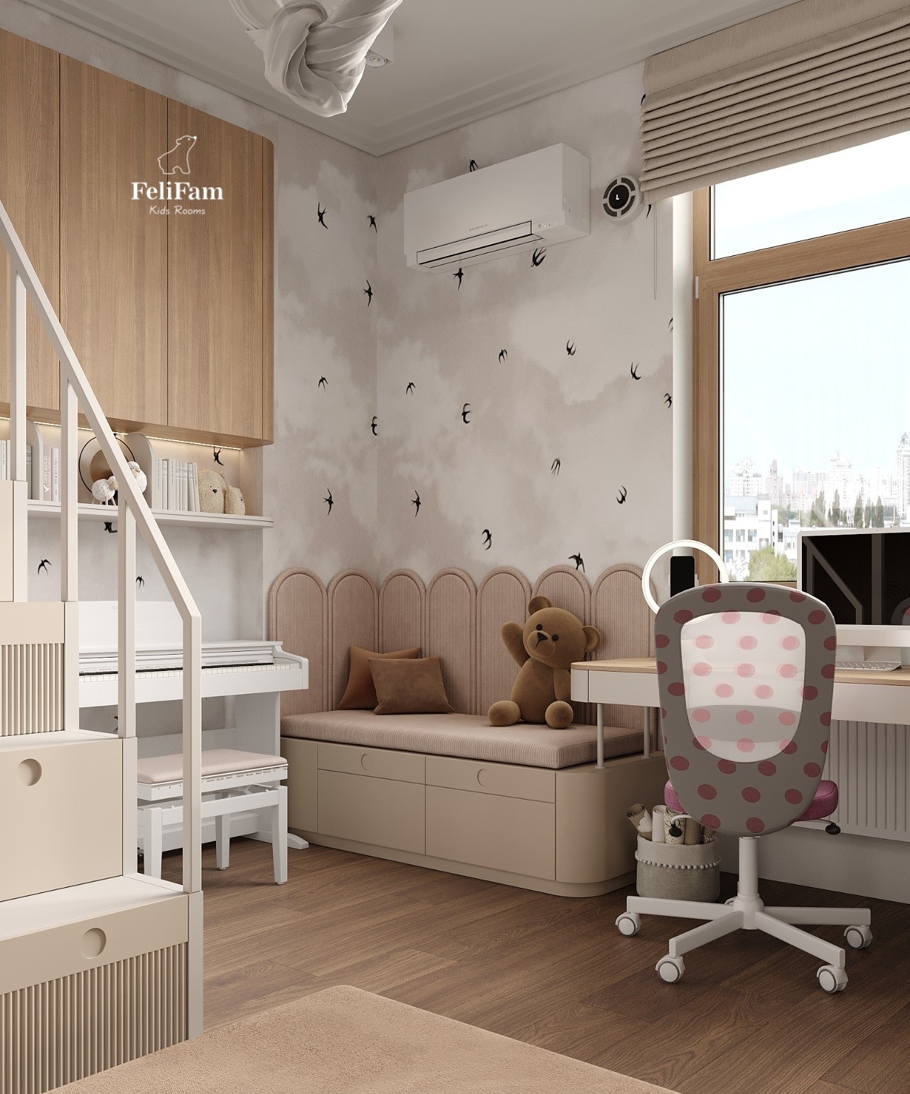 Cozy and Functional Space for Two Girls This space combines style and comfort. The separate sleeping zone creates a restful place, while the second level is perfect for organizing a play area that can be adapted to different needs. The study area by the window is filled with natural light, helping children concentrate. The large built-in wardrobe helps keep the space organized without cluttering the interior. Thoughtful zoning makes the room both functional and stylish. The room is designed to use every inch efficiently without sacrificing a sense of space and lightness.