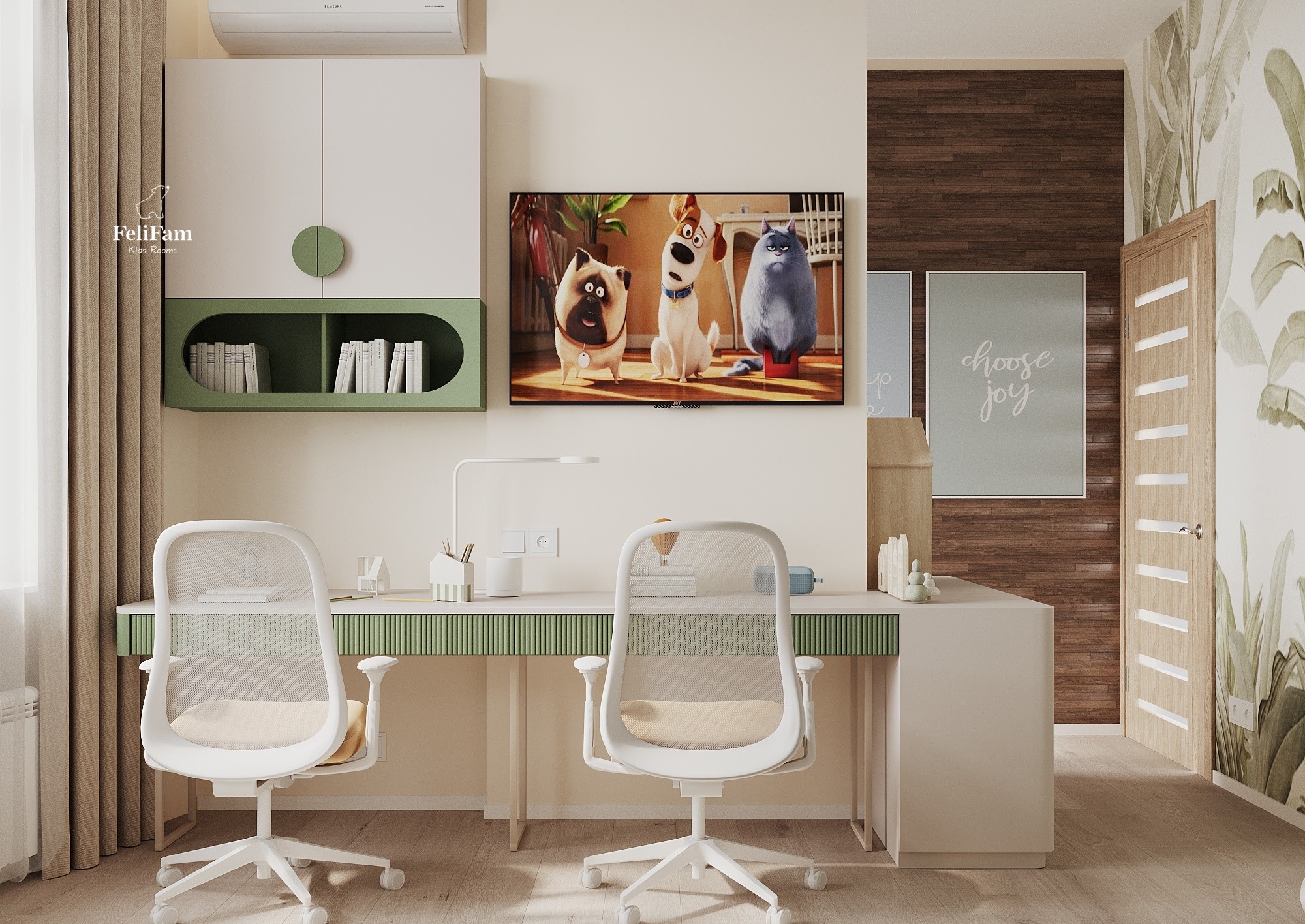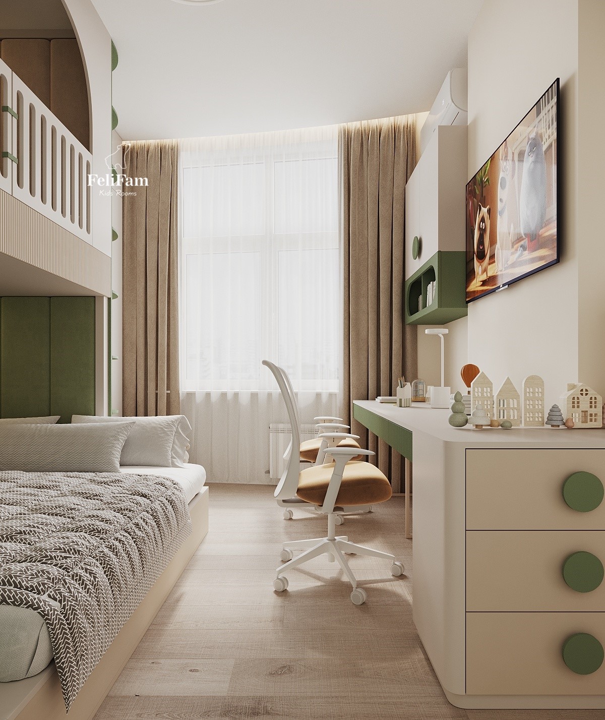 Color and Space Magic: A Room Full of Joy and Inspiration This 16 sq.m. room is full of energy and vibrant colors, perfect for two children of different genders. The bunk bed effectively uses the space, providing a comfortable sleeping place, while separate study zones for each child are organized in a unified style. The green color adds freshness and energy, highlighting the active rhythm of children’s lives. This space perfectly combines functionality and brightness, creating conditions for learning, creativity, and relaxation.