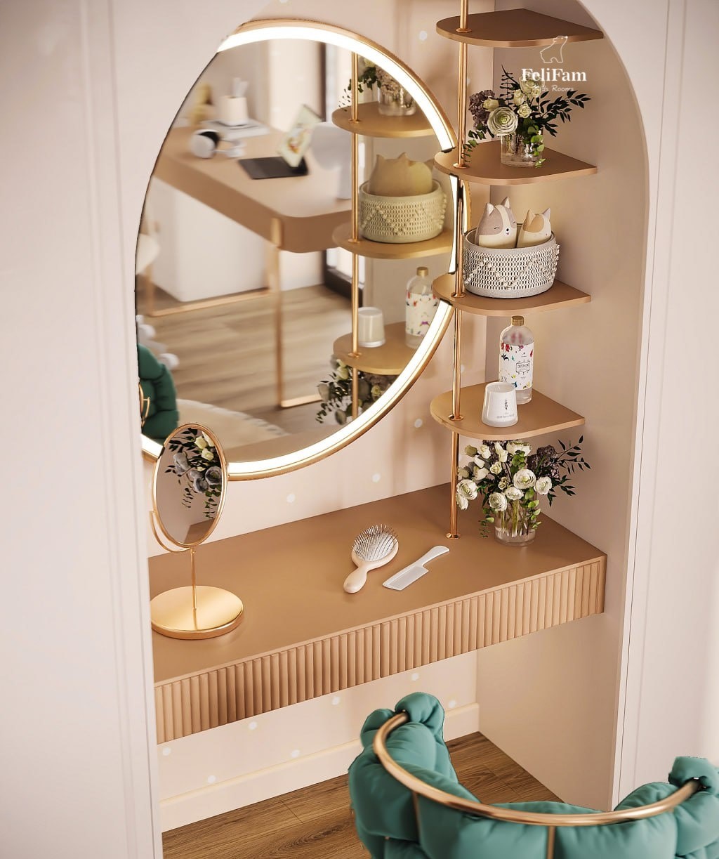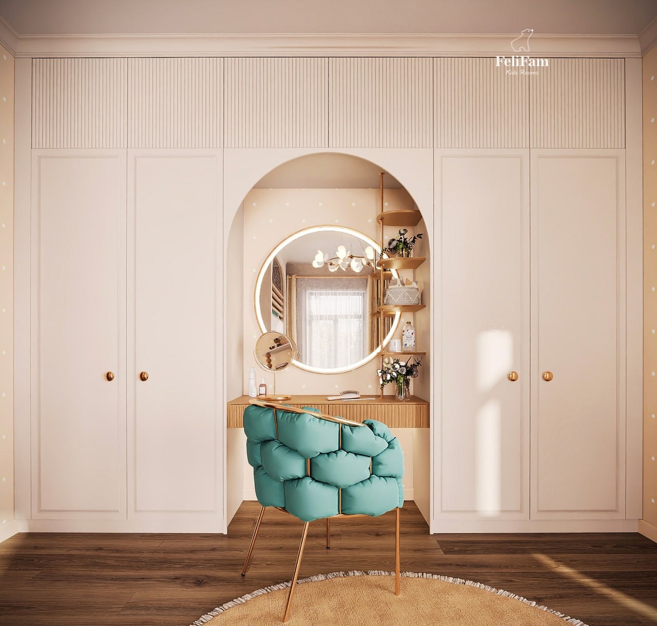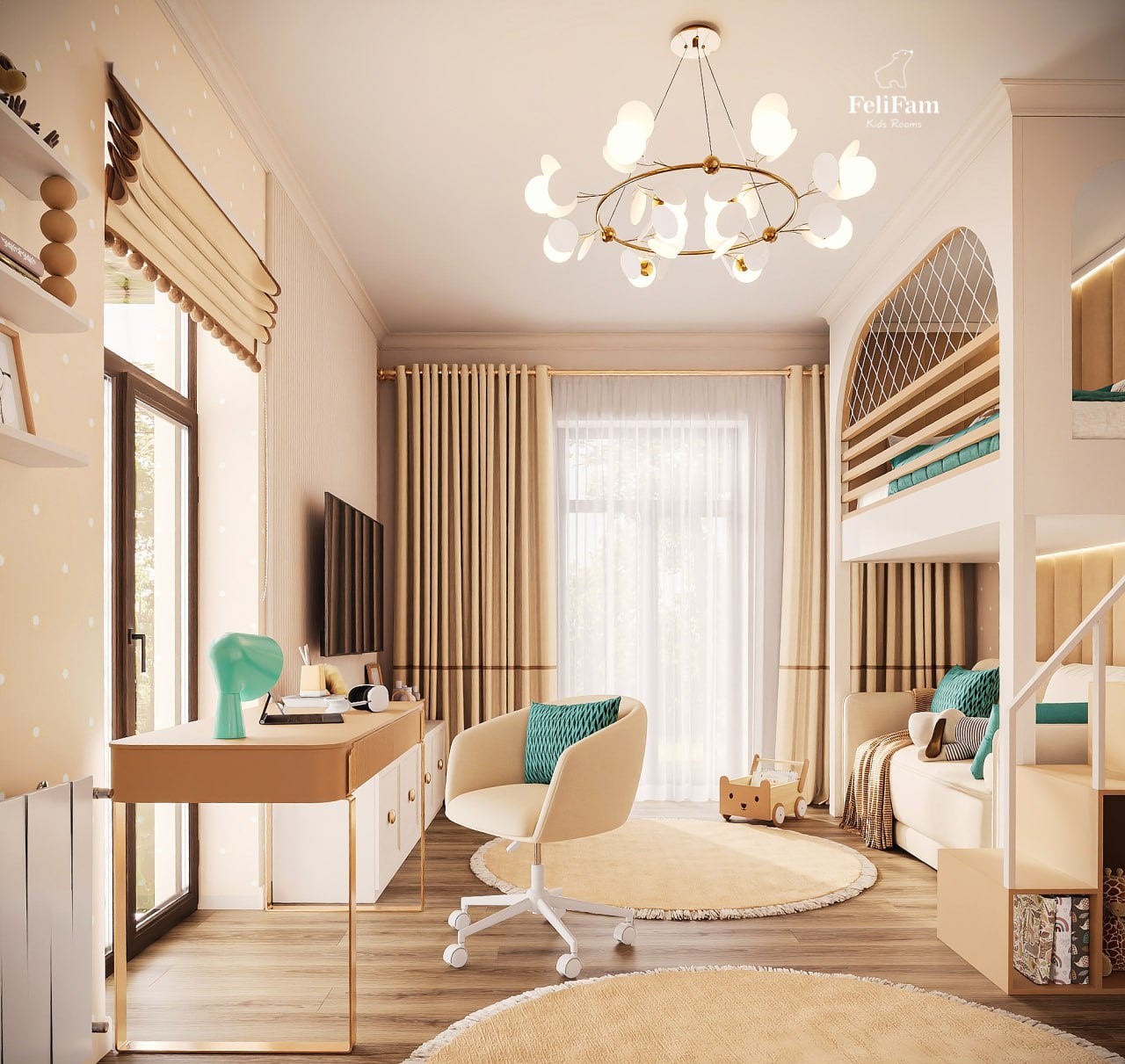Light, space, and comfort: the perfect room for a little princess! This light and spacious room is designed for maximum comfort for the girl. The two-tier bed allows for efficient use of space, leaving room for study and play. The study area is equipped with a comfortable desk, while the vanity is harmoniously built into a spacious wardrobe, adding functionality and maintaining order. This is the perfect space where style meets practicality, creating comfortable conditions for relaxation, learning, and development.