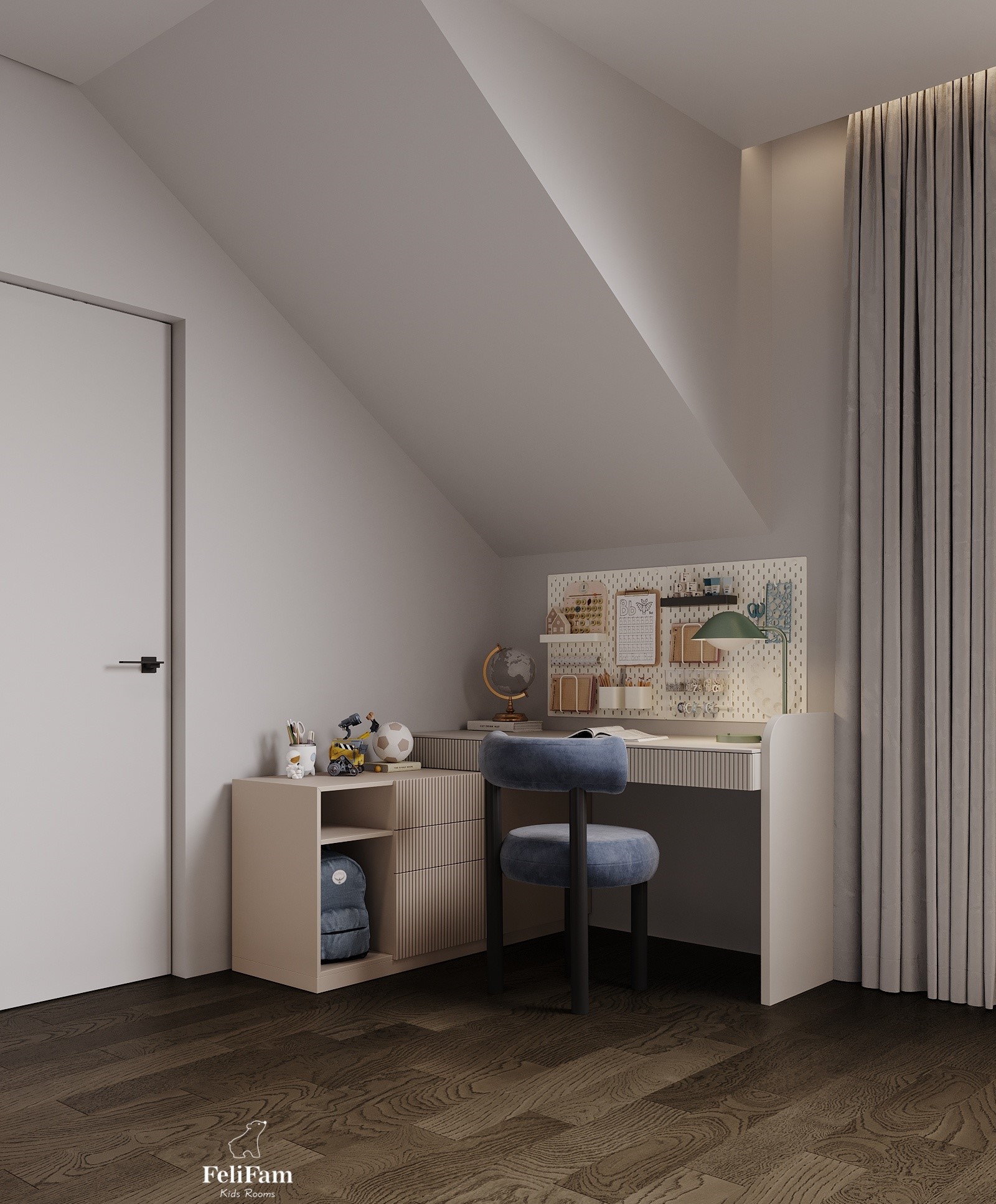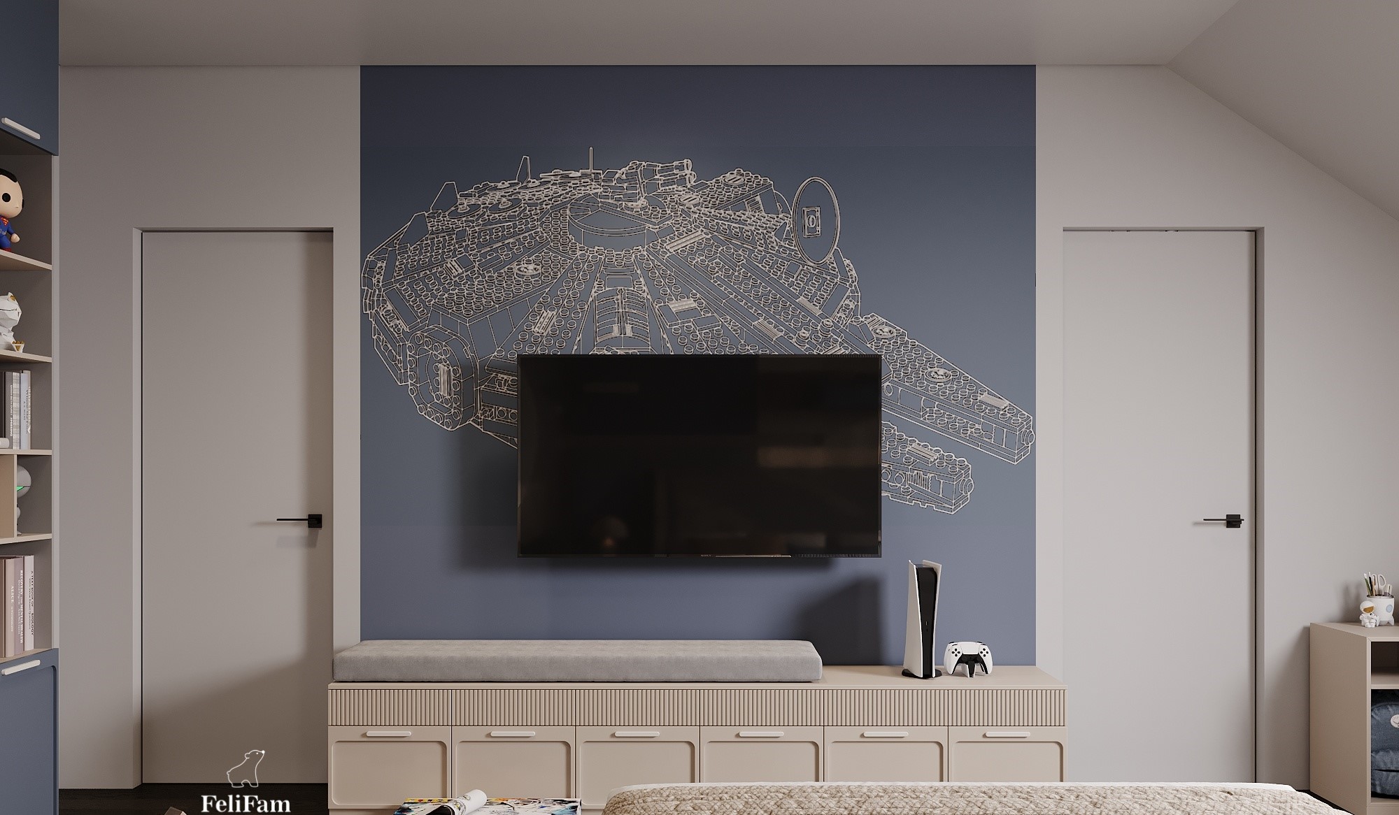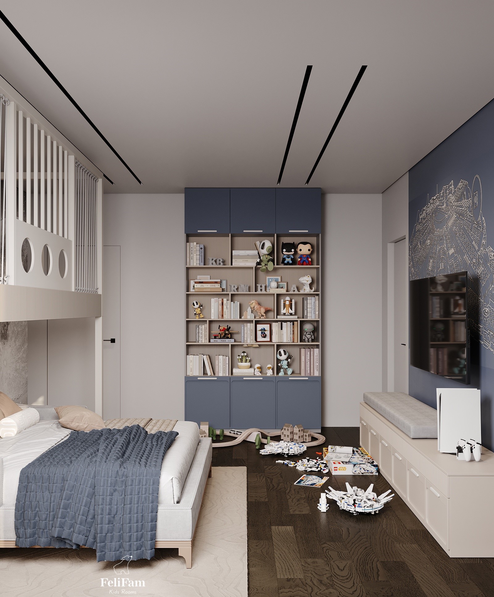 A room that grows with the child: style, comfort, and functionality in every detail! A room for a boy that combines convenience and style. The large double bed ensures a comfortable rest, and the second-floor design is perfect for relaxing or playing. The TV area creates the ideal environment for relaxation after an active day. Bright blue accents add energy, while the original wall art gives the room uniqueness. Integrated shelves allow for the storage of favorite items and books in an orderly fashion. This room is adapted to the child’s growth and will remain comfortable even at an older age, meeting all their needs at every stage of development.