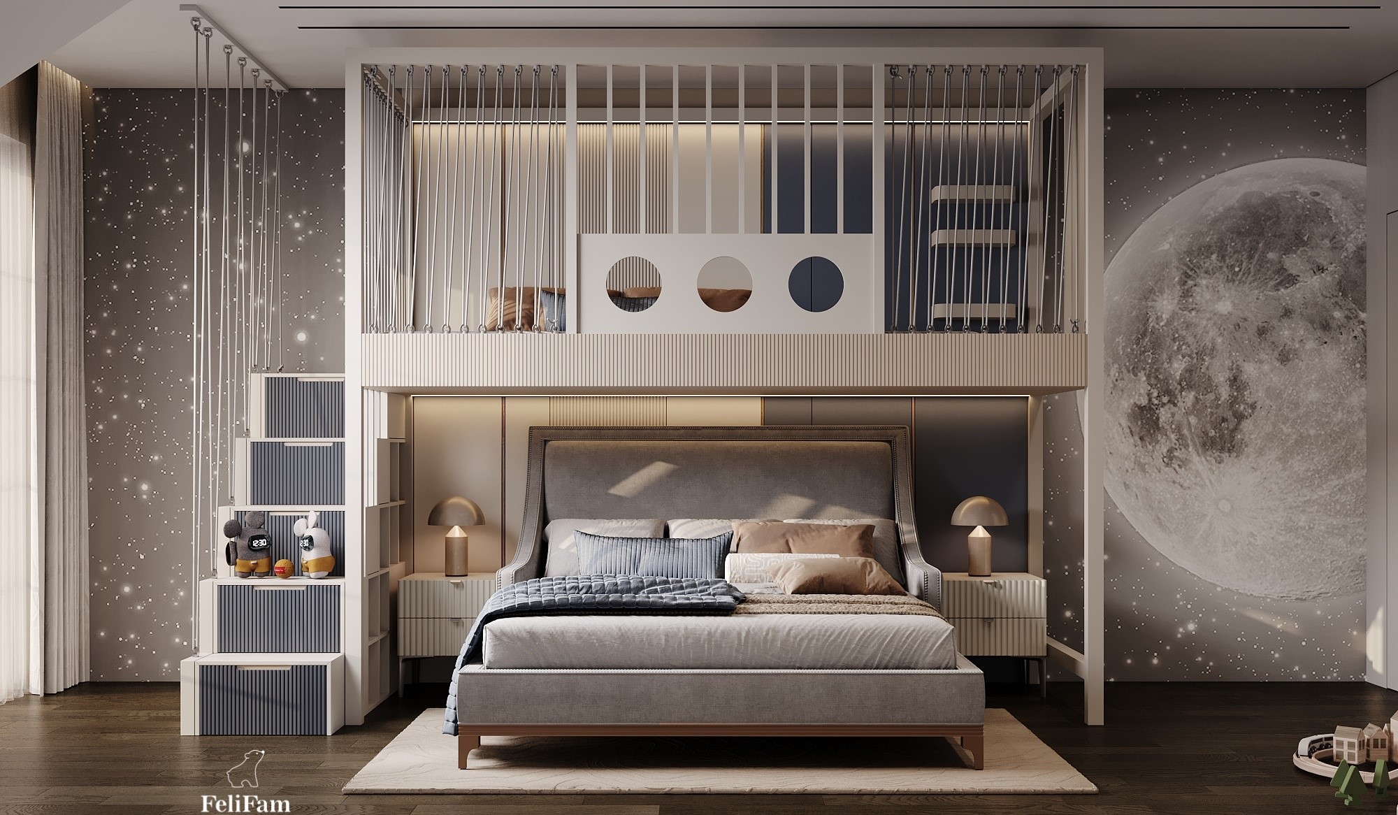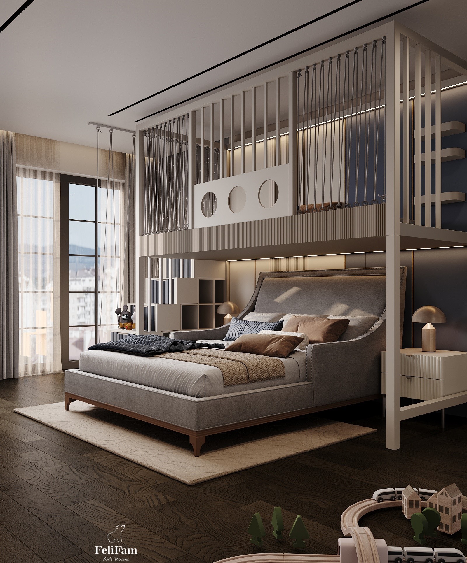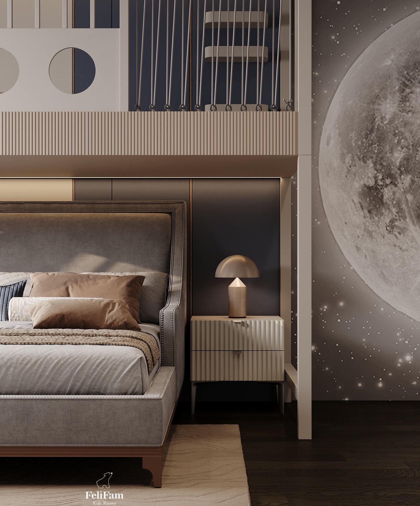 A room that grows with the child: style, comfort, and functionality in every detail! A room for a boy that combines convenience and style. The large double bed ensures a comfortable rest, and the second-floor design is perfect for relaxing or playing. The TV area creates the ideal environment for relaxation after an active day. Bright blue accents add energy, while the original wall art gives the room uniqueness. Integrated shelves allow for the storage of favorite items and books in an orderly fashion. This room is adapted to the child’s growth and will remain comfortable even at an older age, meeting all their needs at every stage of development.