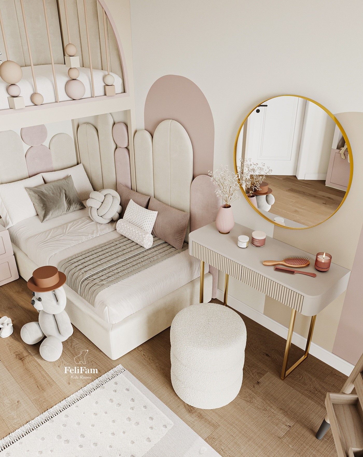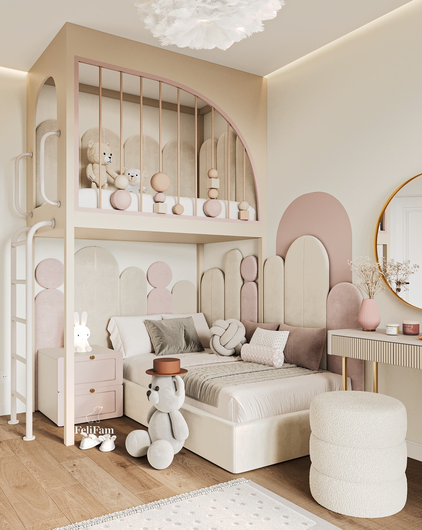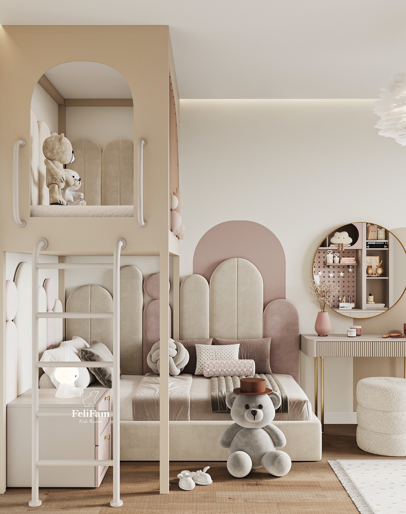 A space for dreams: where style and comfort meet in every detail! This children’s room is executed in a modern style, with soft pastel colors that create an atmosphere of calm and comfort. Soft panels by the bed add comfort and safety, making the space even more pleasant for rest. The two-tier structure allows for the most effective use of the room’s area. The second floor can be arranged as a play space where the child can have fun, develop their imagination, and play their favorite games. Functionality, style, and coziness are harmoniously combined in this interior, creating the perfect place for life and development.