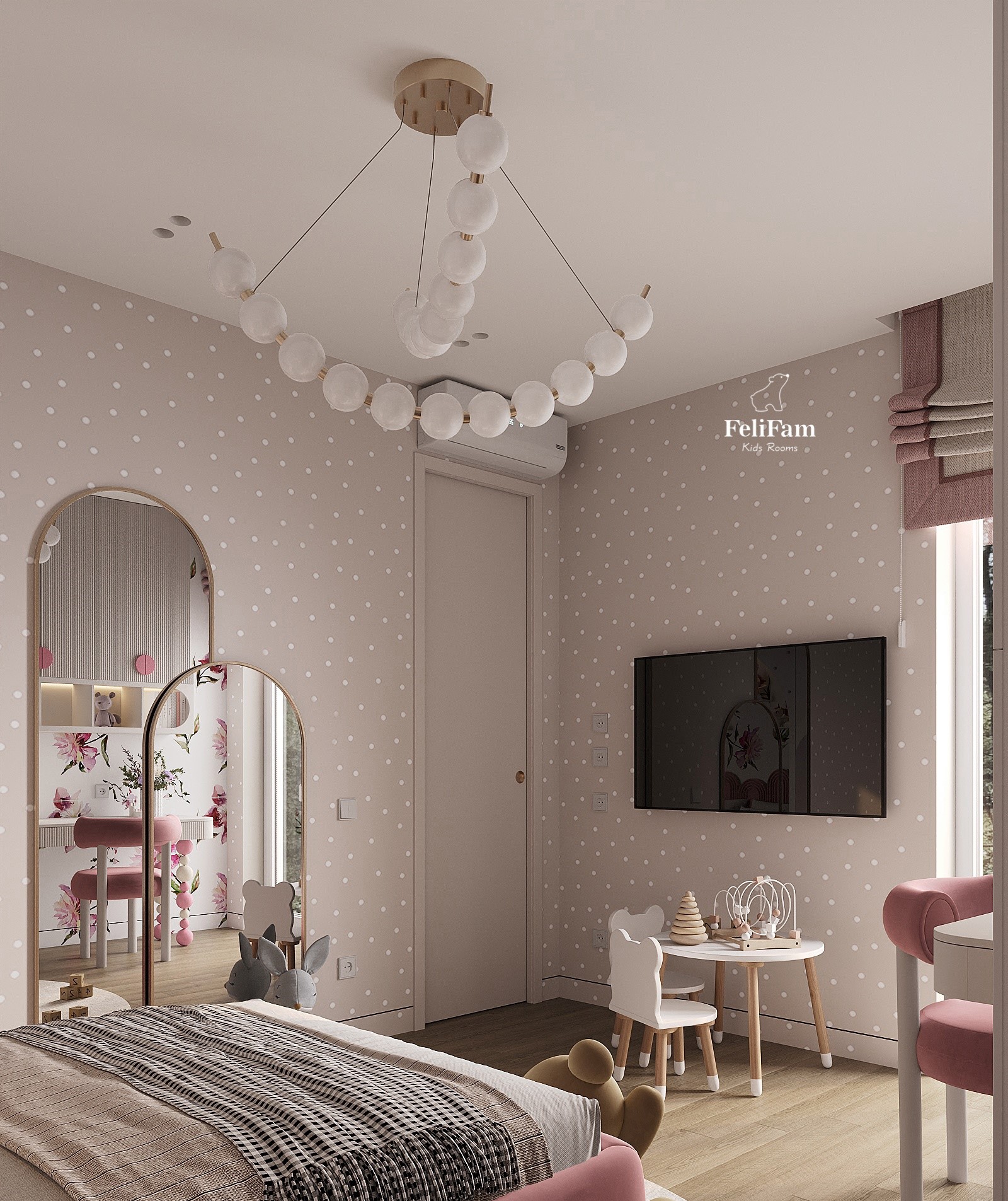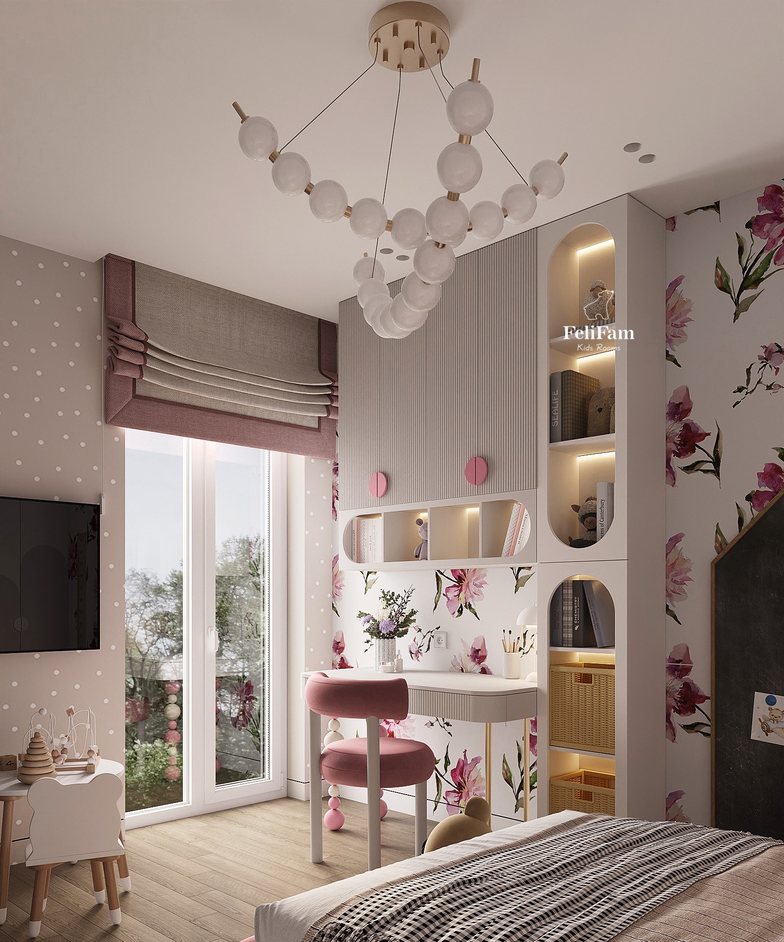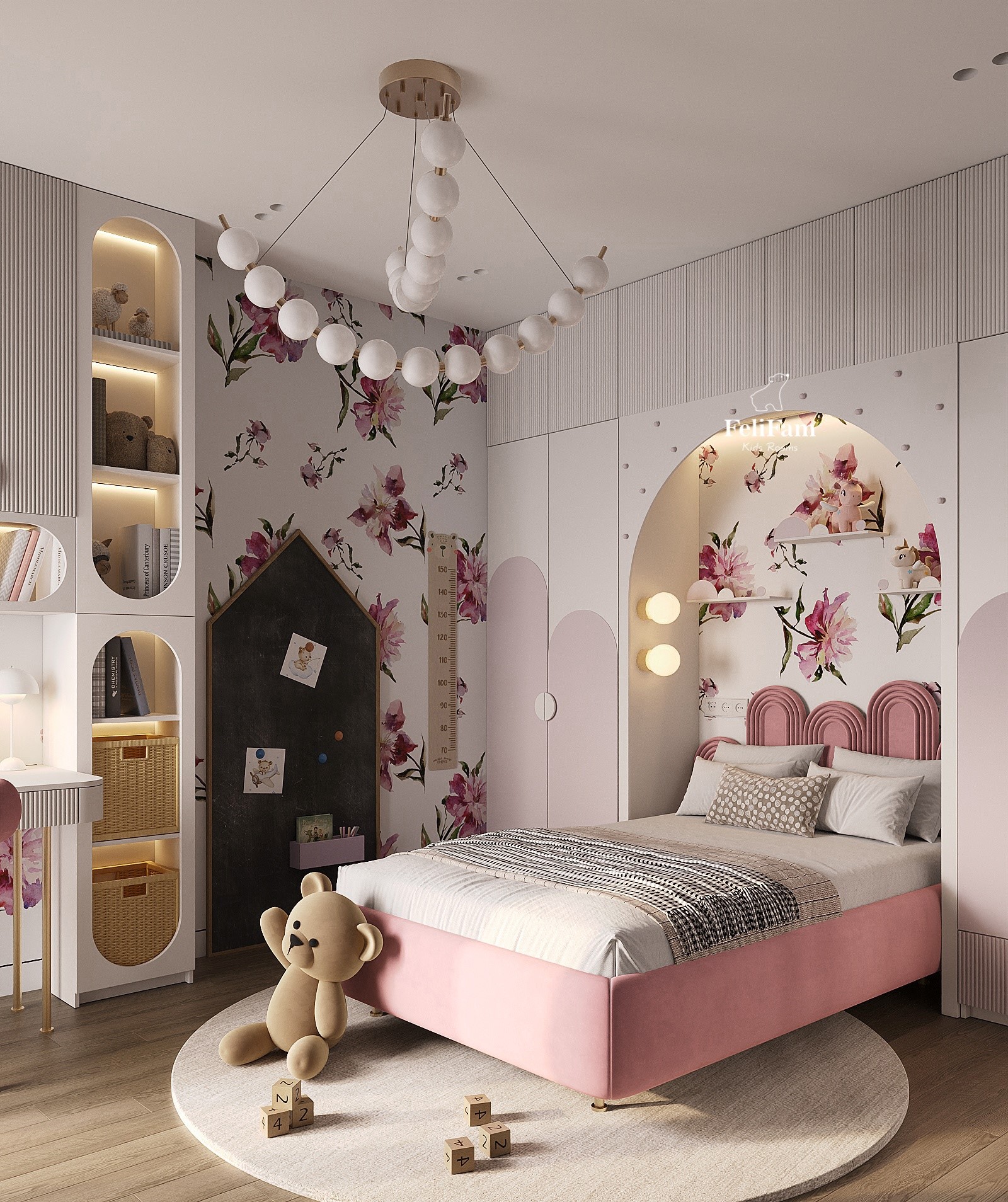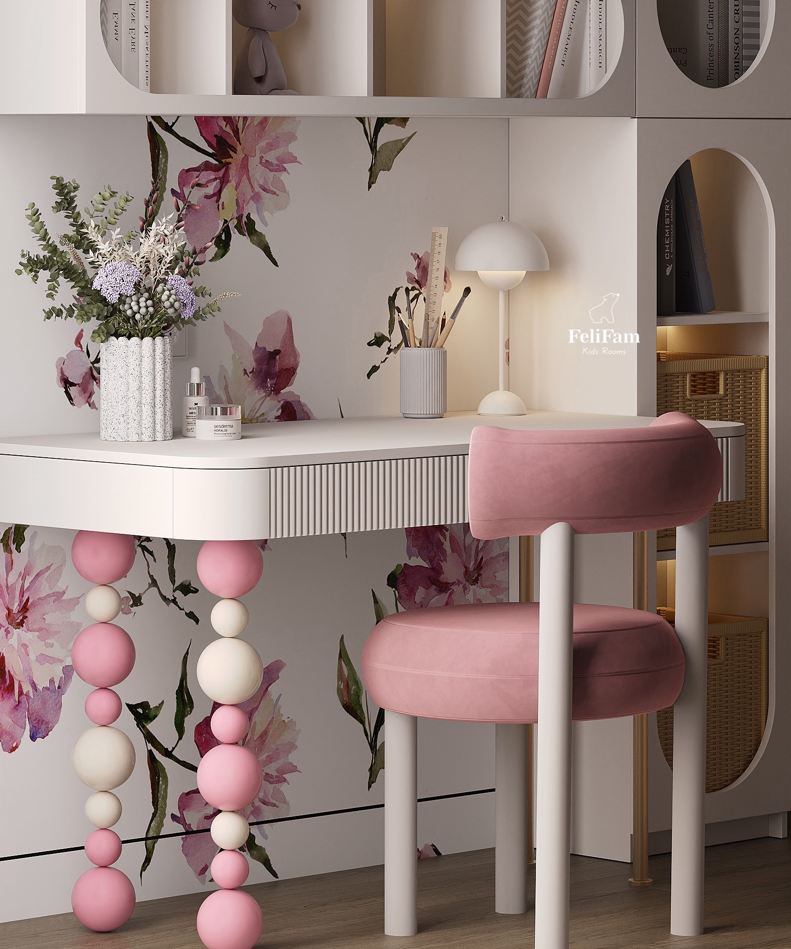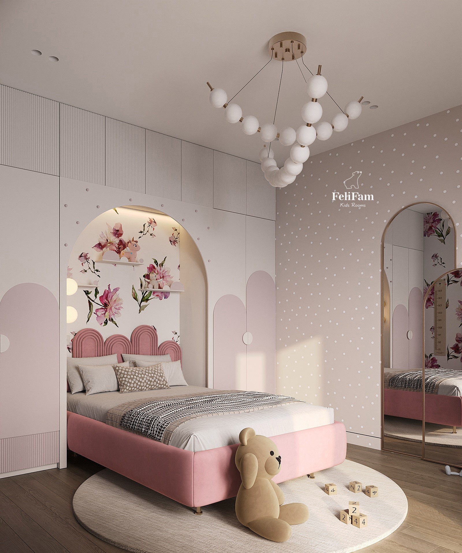 A place where fairy tales come alive and every day is filled with dreams! This girls’ room is a true place for a fairy tale! Delicate floral motifs and pink shades create an atmosphere of warmth and coziness. The bed with soft panels provides comfort and safety, while the convenient wardrobe helps organize space for belongings. Accent floral wallpaper adds a special charm to the room, making it even cozier and brighter. This is the perfect place for relaxation, learning, and the development of a little girl, inspiring dreams and creativity.