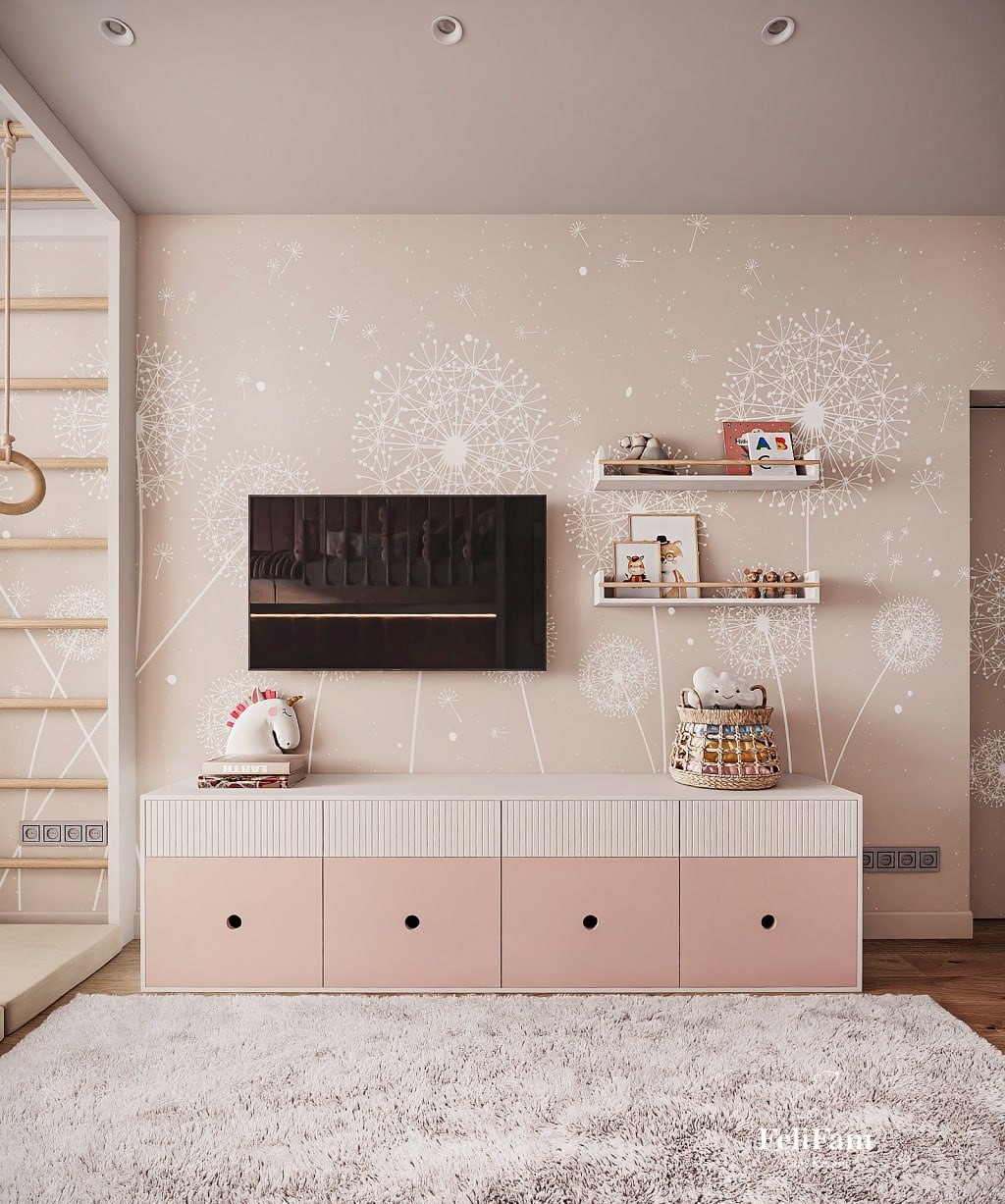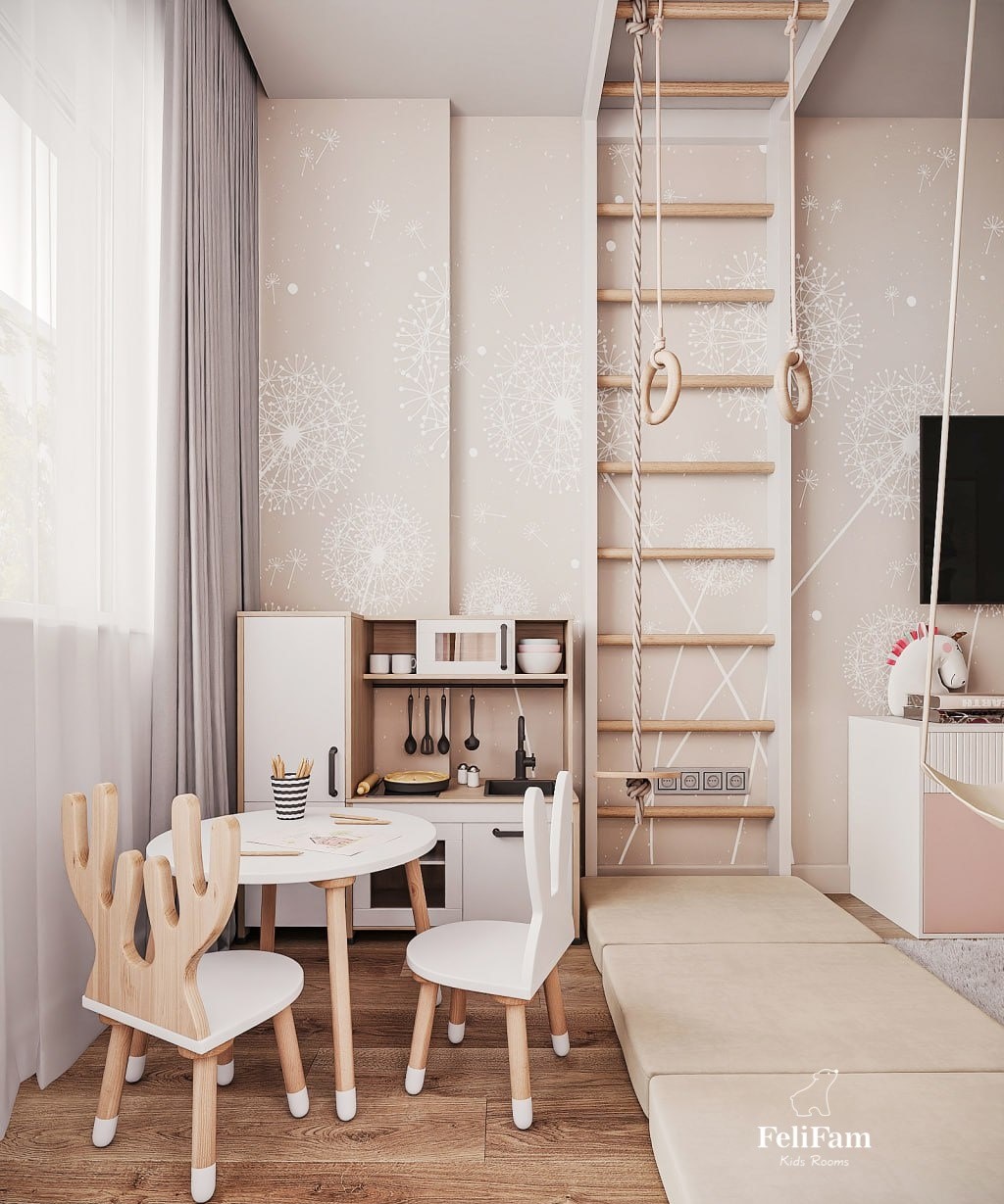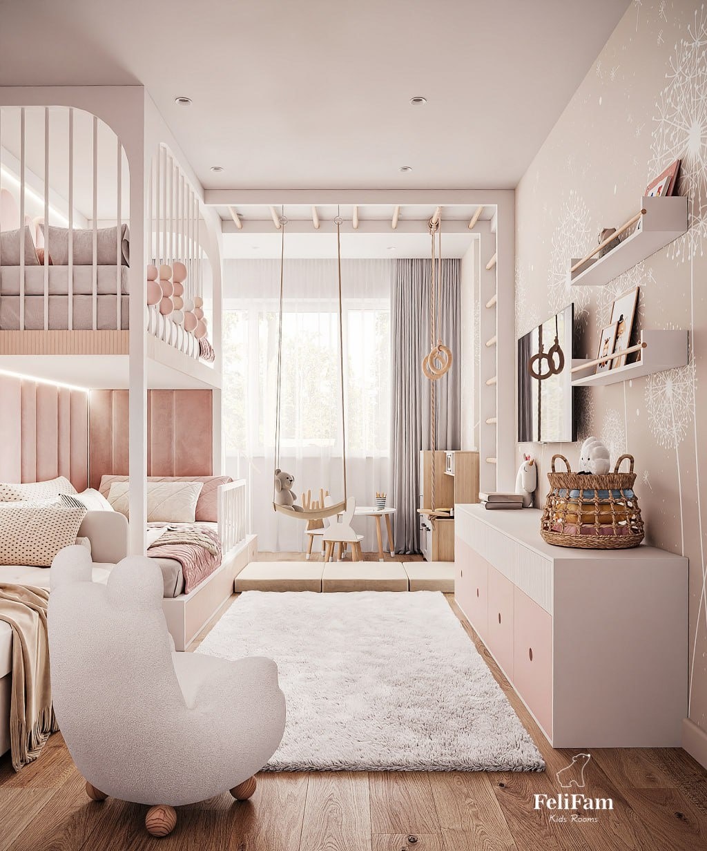 Light, joy, and boundless imagination – all in one place! A light and airy space for two girls. This room is designed to bring joy and coziness. Light colors in the interior, wallpaper with dandelions, and a soft rug with a chair fill the space with ease and warmth. The bunk bed provides each girl with her own comfortable space for sleep, while the swing adds fun moments and active rest. The room also includes a physical activity zone, where the girls can move and develop, a TV area for watching favorite shows, and a play zone that will be a place for limitless imagination and creativity. This space offers new opportunities for development and joy every day.