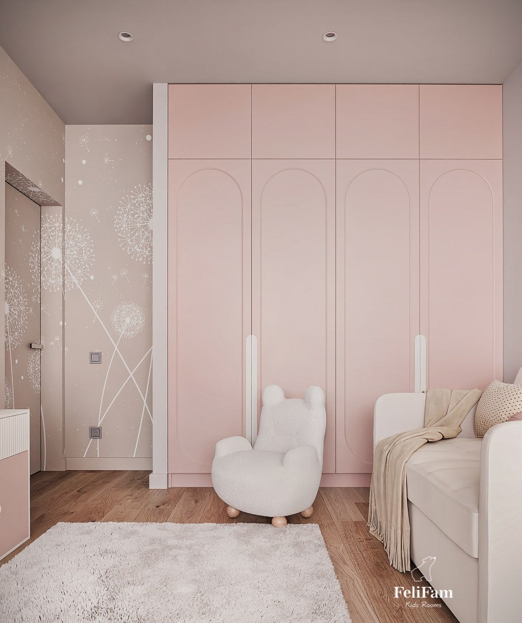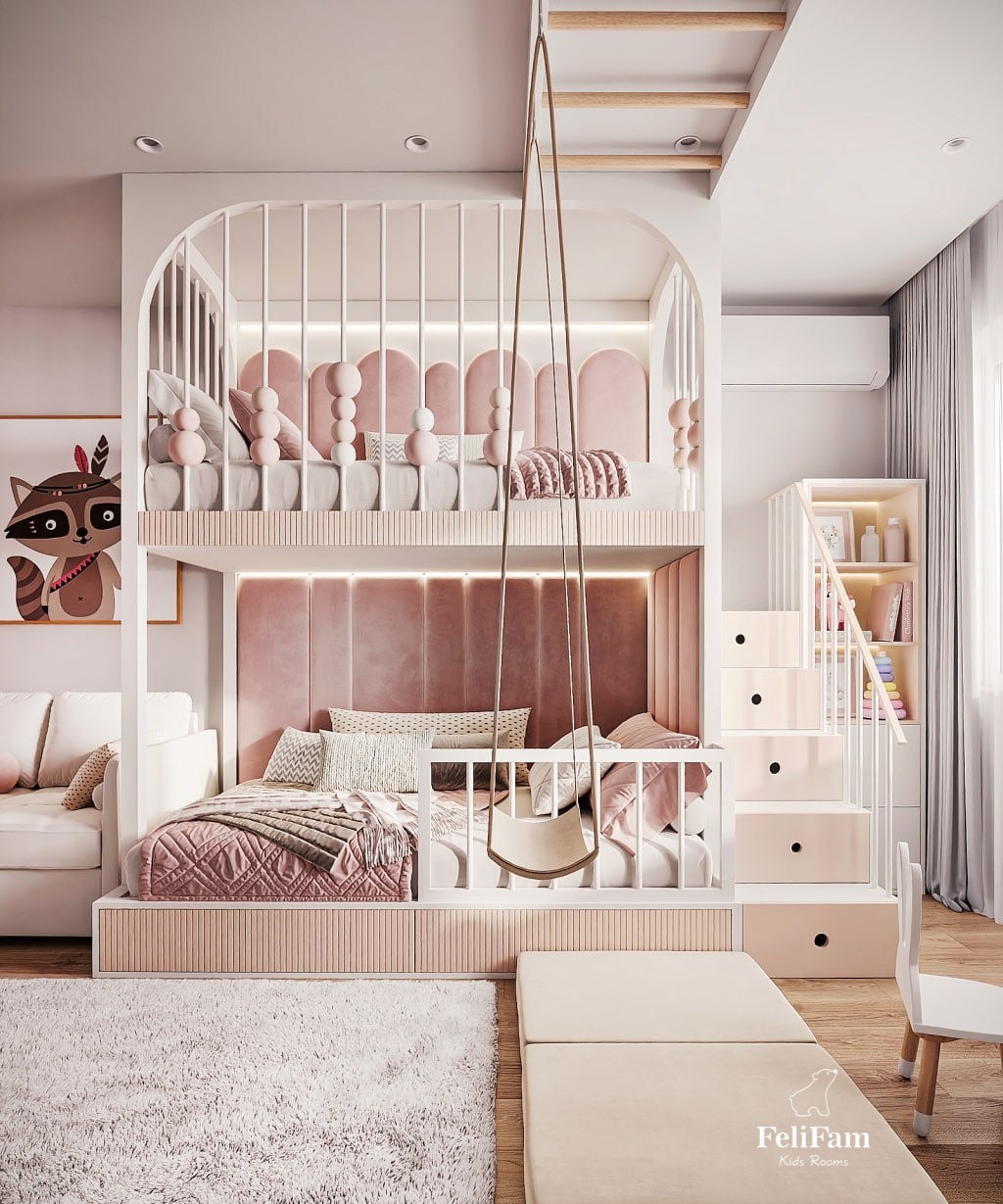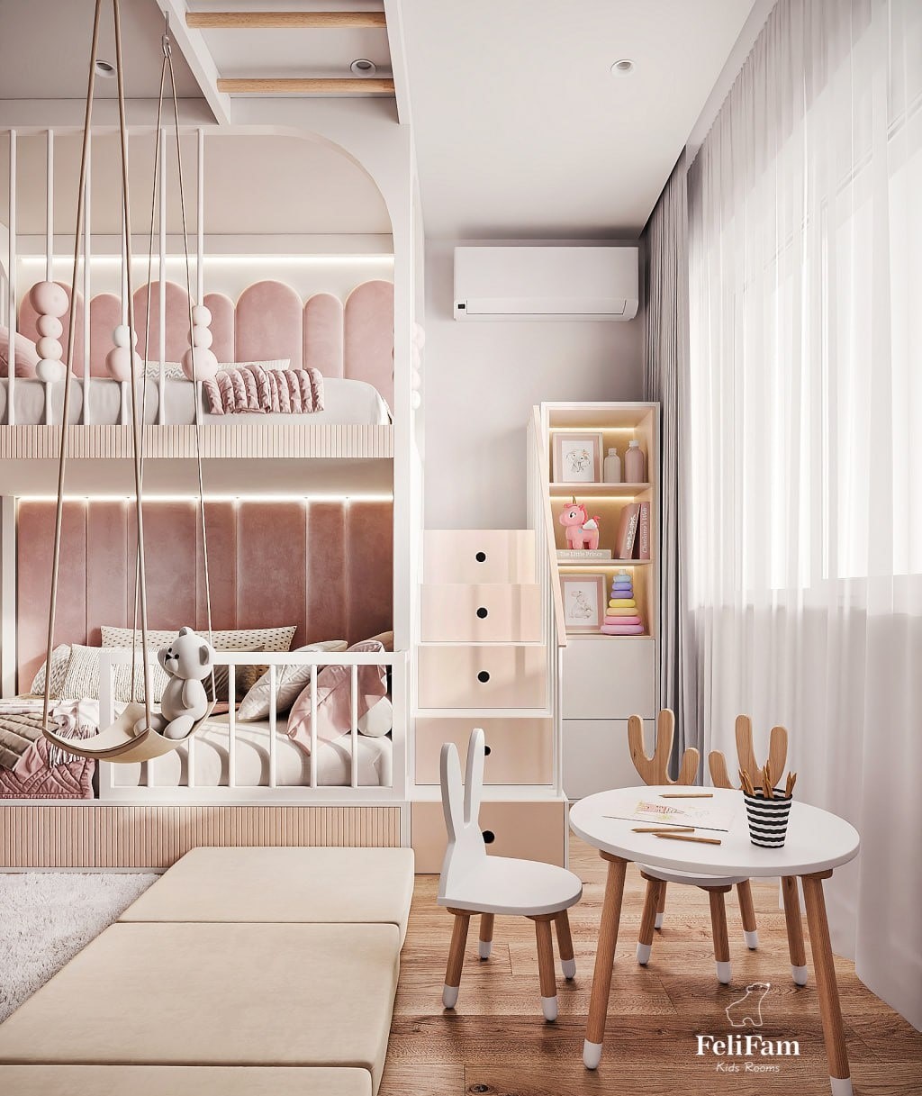 Light, joy, and boundless imagination – all in one place! A light and airy space for two girls. This room is designed to bring joy and coziness. Light colors in the interior, wallpaper with dandelions, and a soft rug with a chair fill the space with ease and warmth. The bunk bed provides each girl with her own comfortable space for sleep, while the swing adds fun moments and active rest. The room also includes a physical activity zone, where the girls can move and develop, a TV area for watching favorite shows, and a play zone that will be a place for limitless imagination and creativity. This space offers new opportunities for development and joy every day.