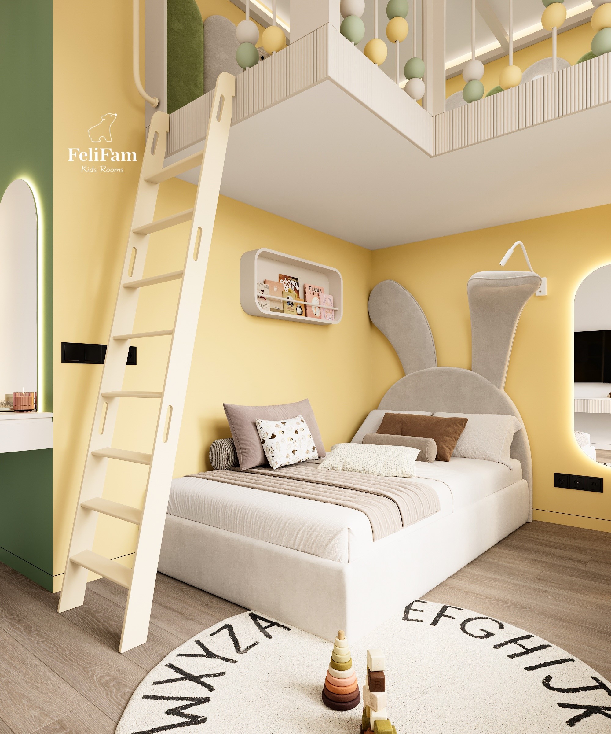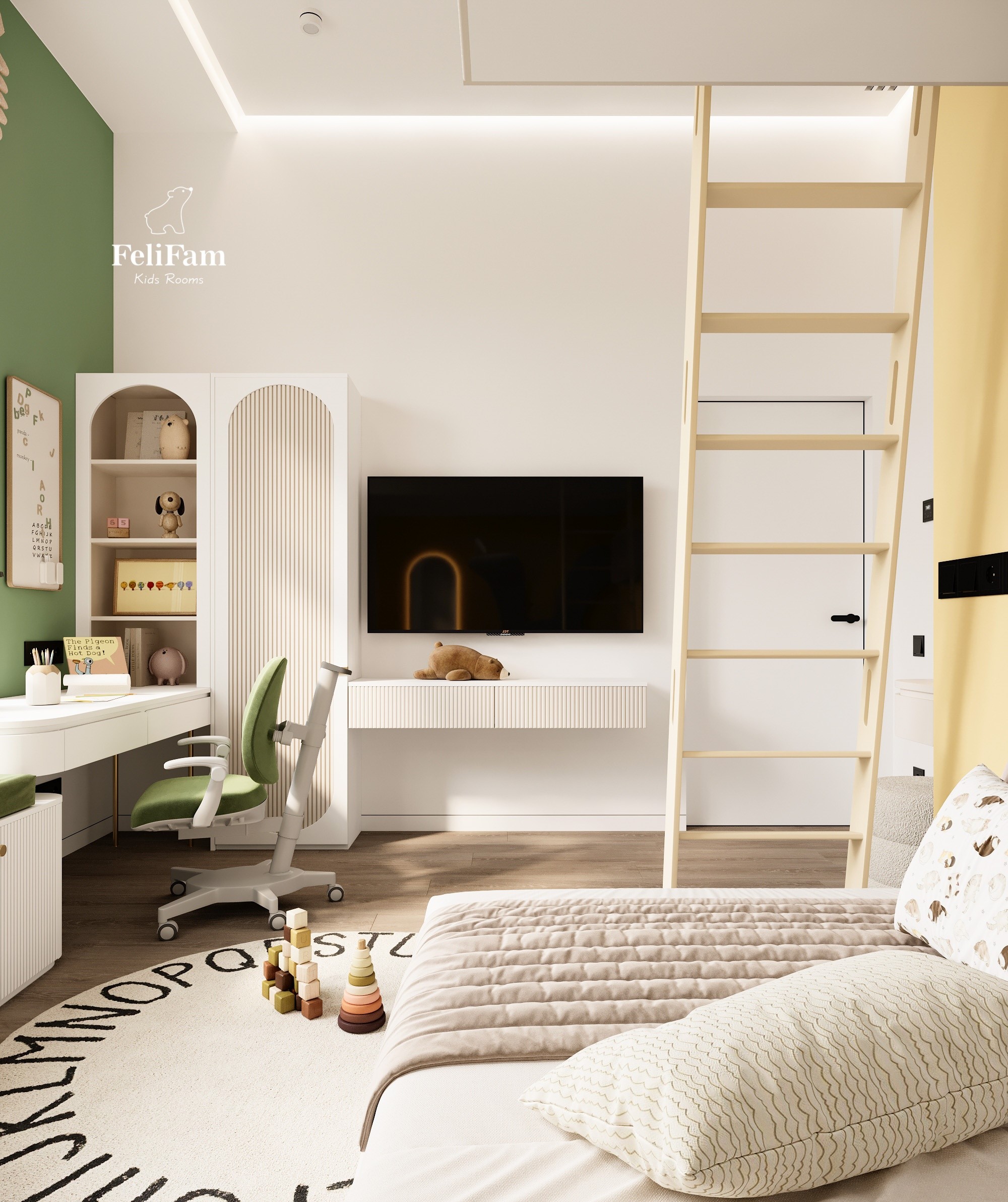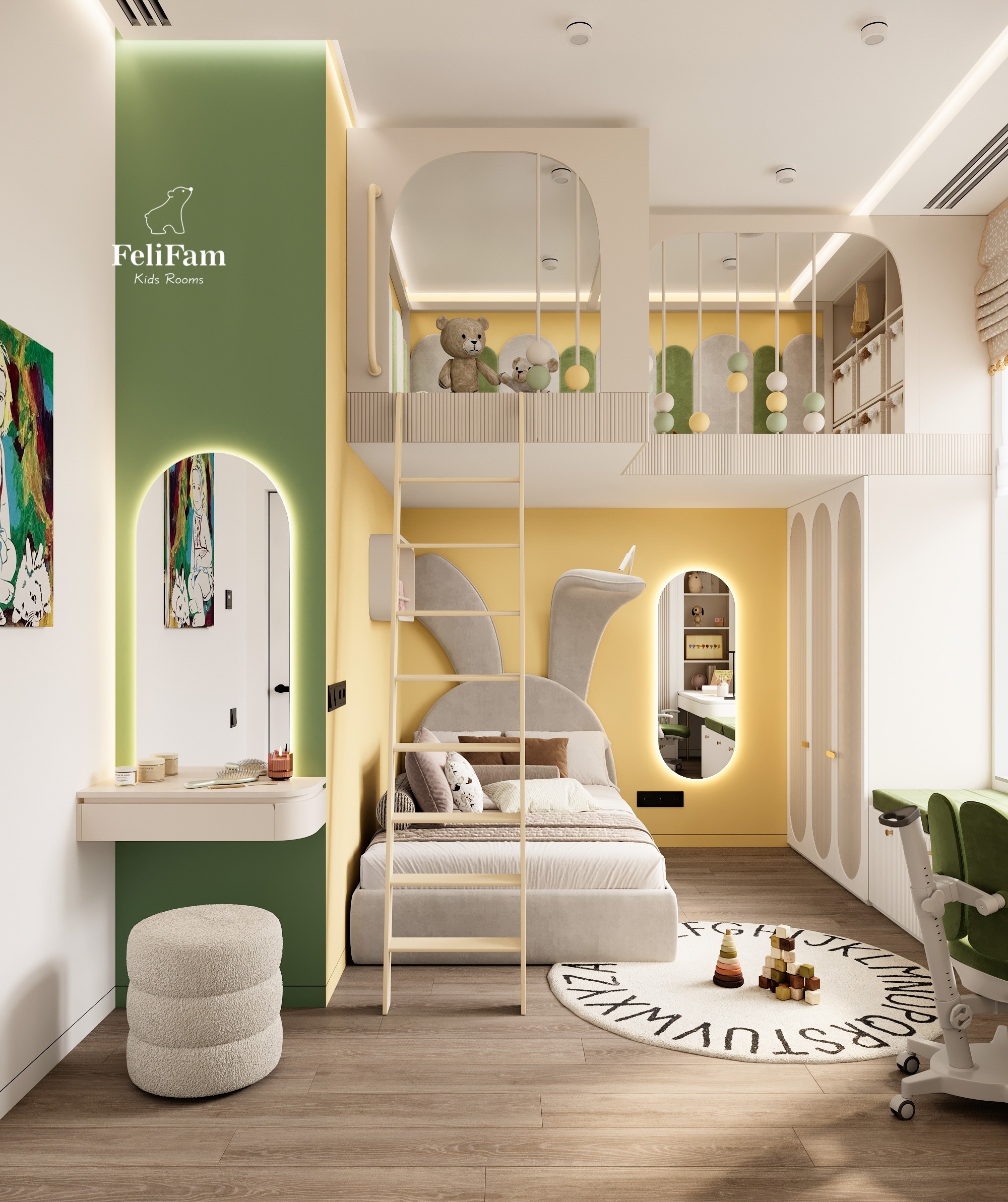 Light, energy, and a flow of creativity – a space for new achievements! This room combines bold yellow and green colors, creating a fresh and energetic atmosphere that doesn’t tire but, on the contrary, inspires new accomplishments. The sleeping area is thoughtfully designed for maximum comfort, and the compact vanity table adds elegance and functionality. The room also has a convenient storage system, allowing belongings to be organized without hassle, and the work area near the window fills the space with natural light, perfect for study or creativity. This stylish interior provides a balance between brightness and calm, creating a comfortable environment for every day.