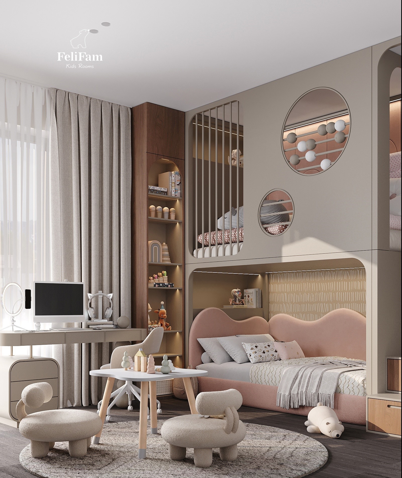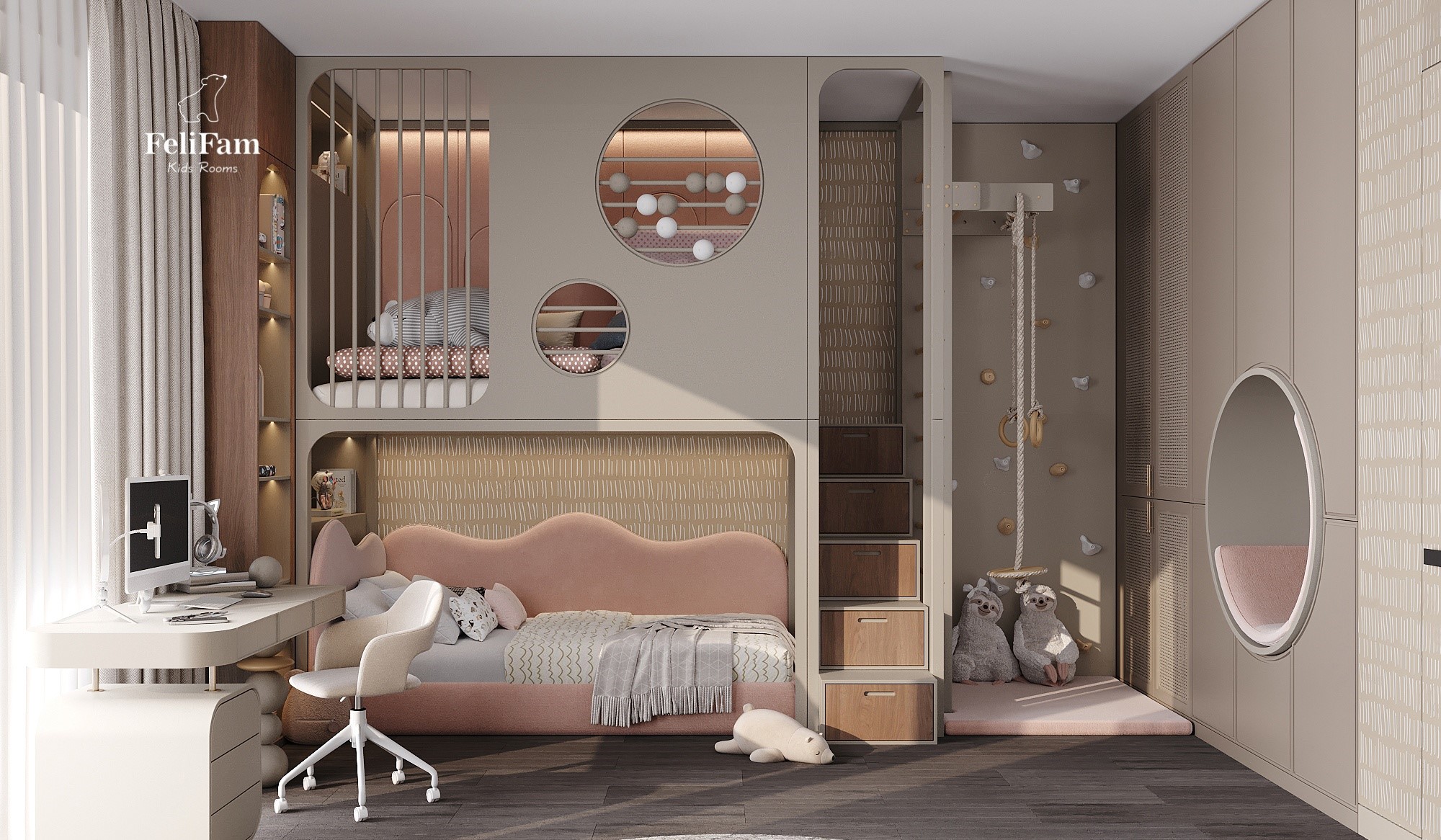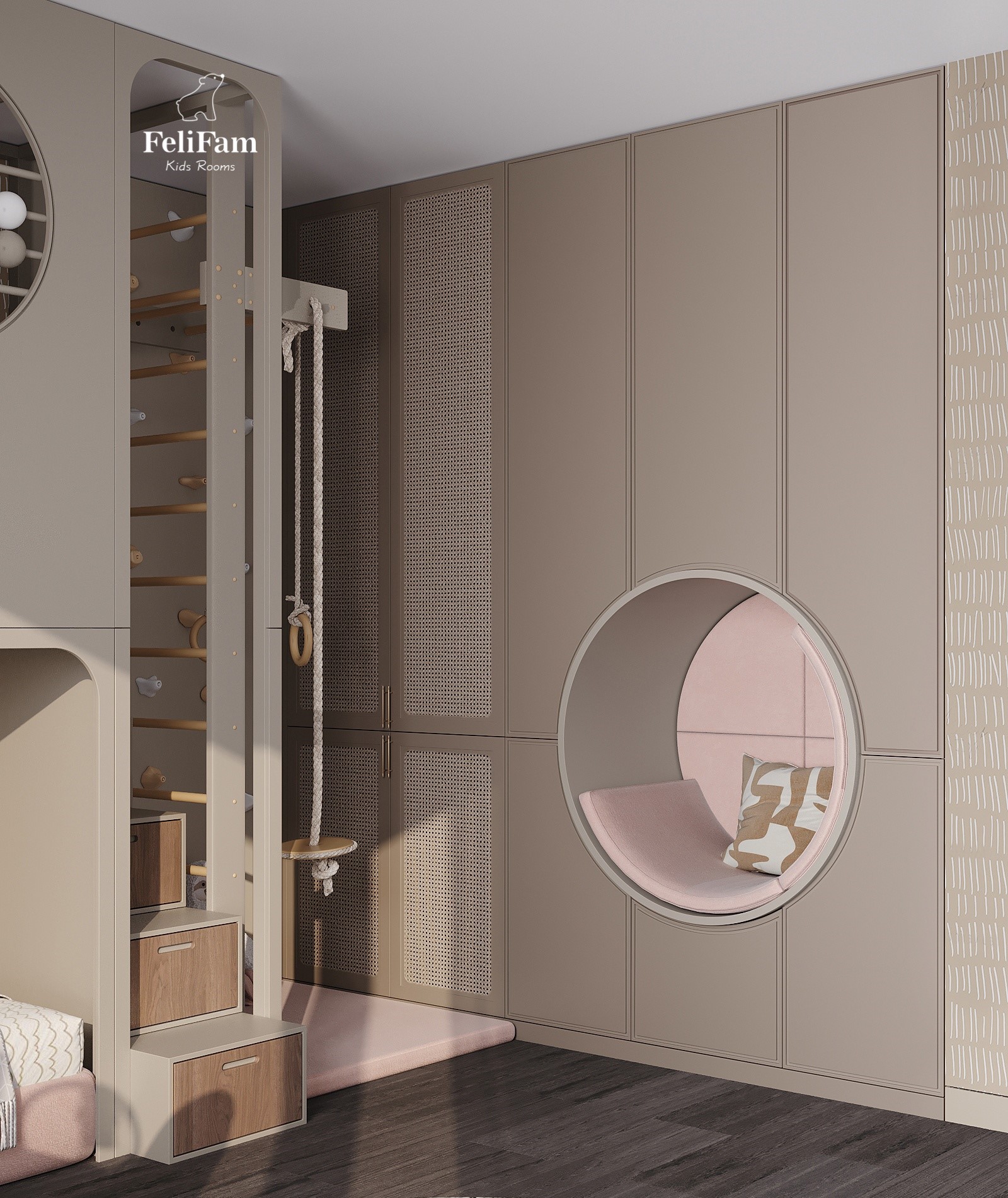 Cozy and functional room for a girl. This room combines comfort and activity in every detail. The bunk bed provides plenty of space for sleep, and the physical activity zone is created for development and active games. The study area is designed so that the child can focus on creative activities, while a separate play area with a toy kitchen allows the girl to create interesting scenarios. This is the perfect space for balancing rest, learning, and play. In this project, we presented the client with two design options for the entrance zone, each of which complements the overall interior concept and fits the space style.
