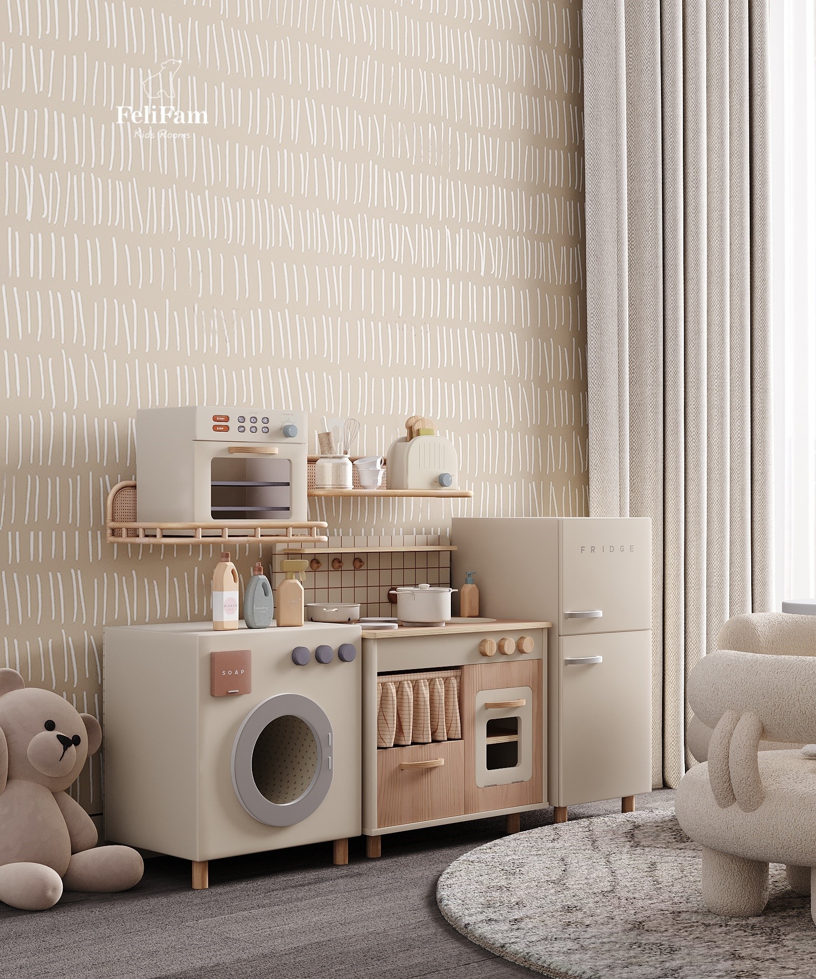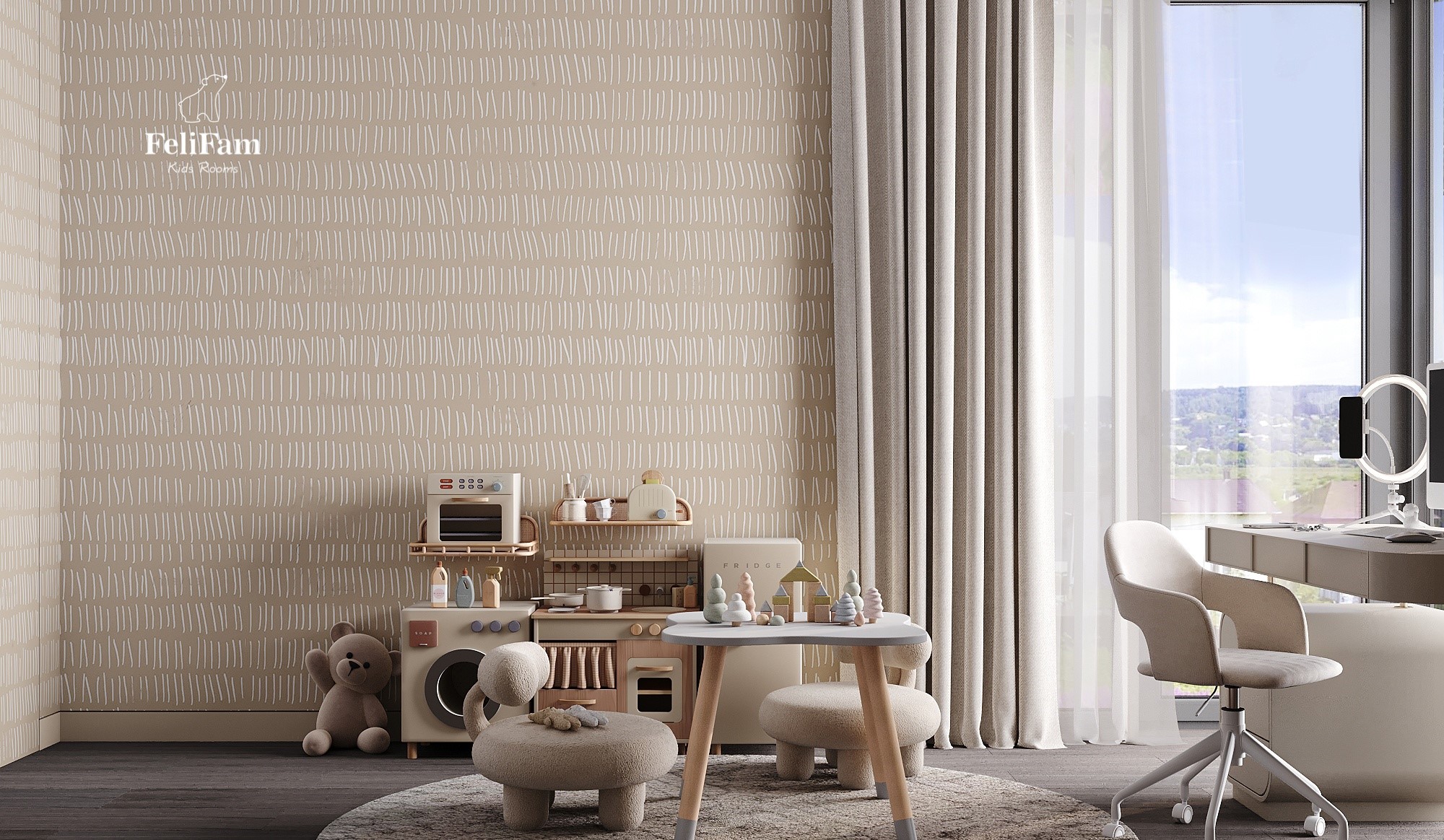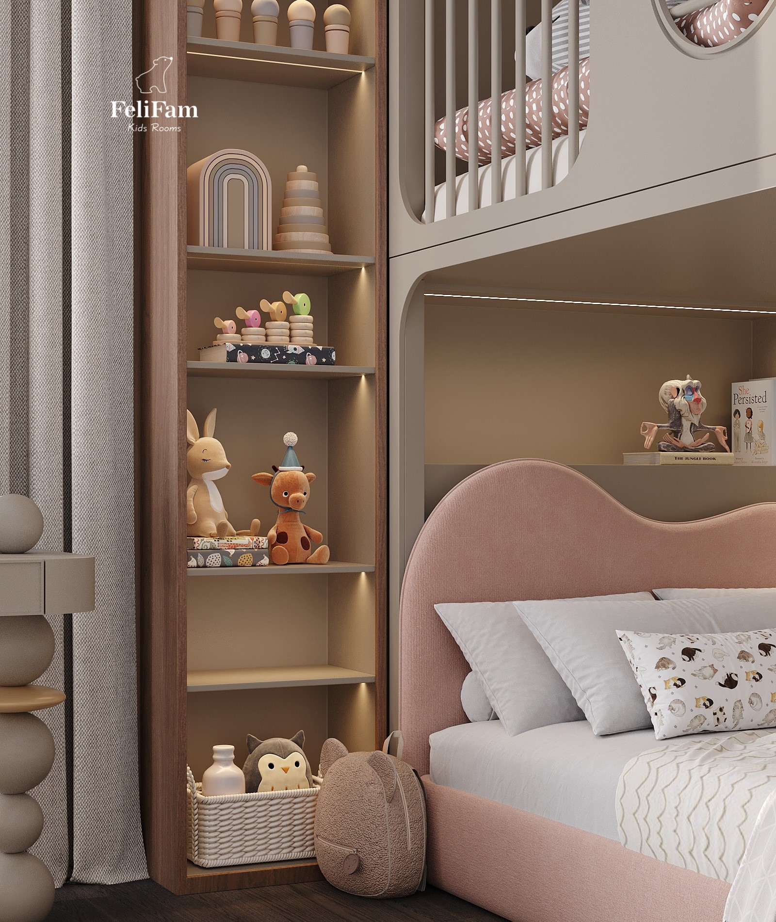 Cozy and functional room for a girl. This room combines comfort and activity in every detail. The bunk bed provides plenty of space for sleep, and the physical activity zone is created for development and active games. The study area is designed so that the child can focus on creative activities, while a separate play area with a toy kitchen allows the girl to create interesting scenarios. This is the perfect space for balancing rest, learning, and play. In this project, we presented the client with two design options for the entrance zone, each of which complements the overall interior concept and fits the space style.