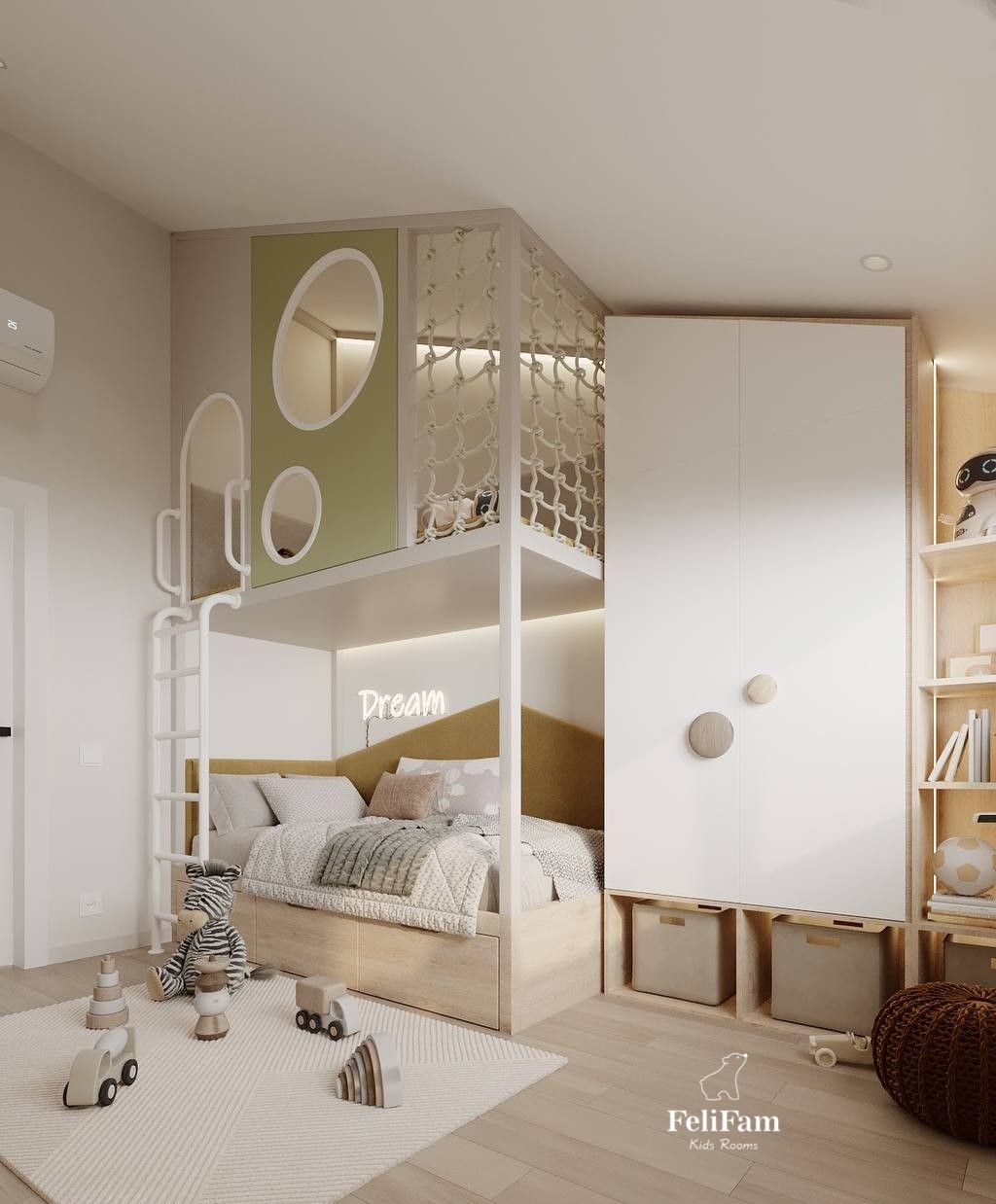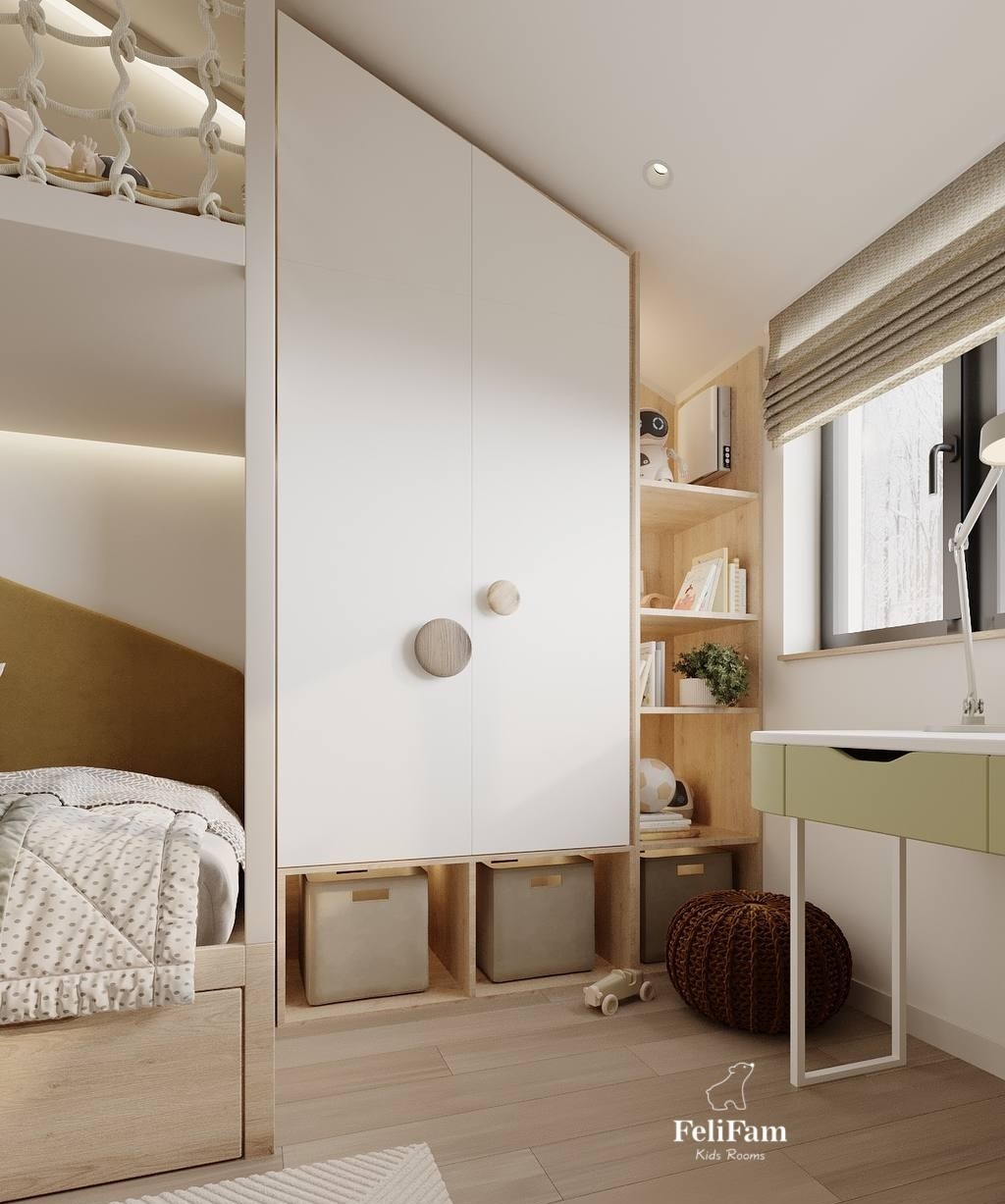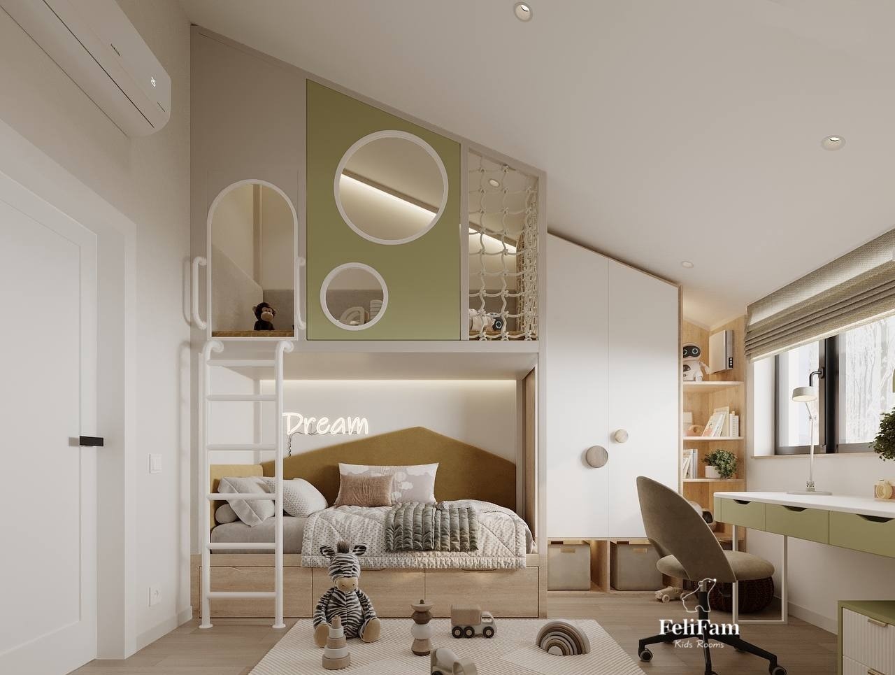 Everything needed in 9 sqm – functionality and style in one space. In this room, comfort and efficient use of space have been combined. Bright decorative elements and accent wallpaper add energy and expressiveness to the room. The bunk structure, adapted to the ceiling angle, optimizes space, providing a comfortable place for sleep and storage. The work area is organized so that every centimeter is used as efficiently as possible, creating ideal conditions for productive work or learning. This project is a prime example of how to make the most of every square meter while creating a functional and stylish space.