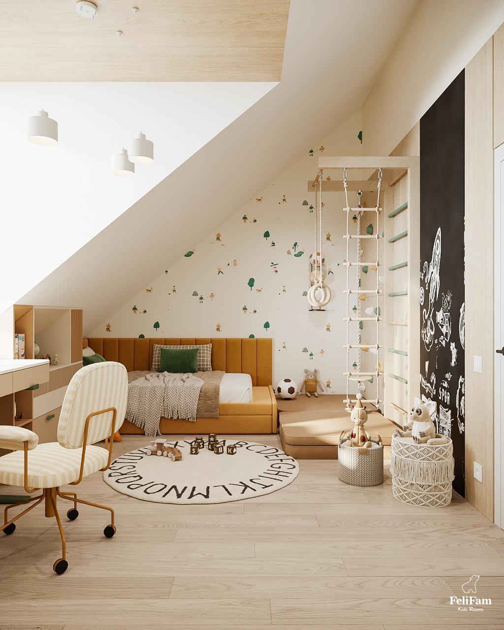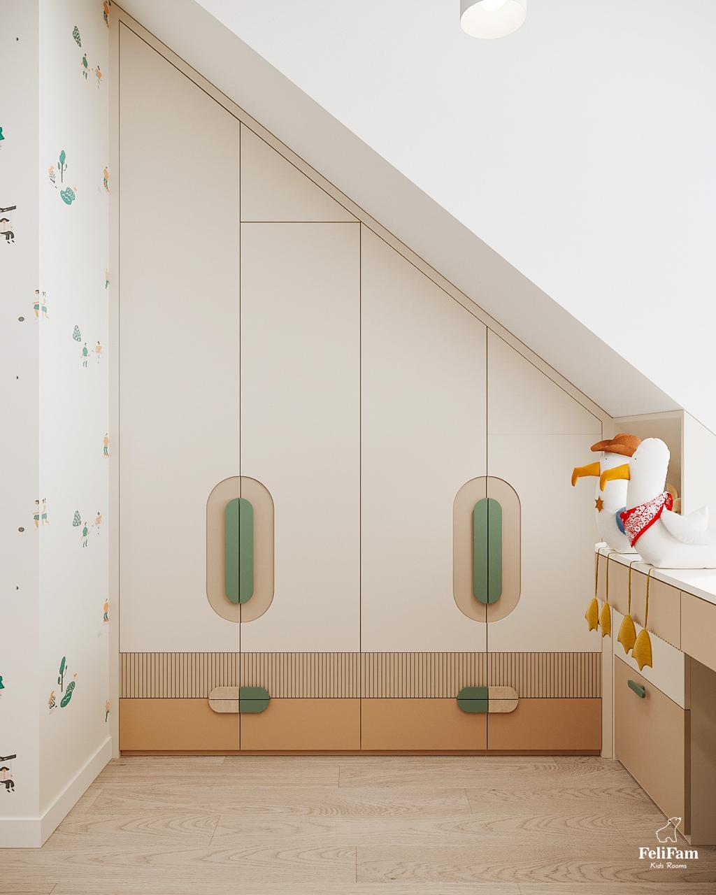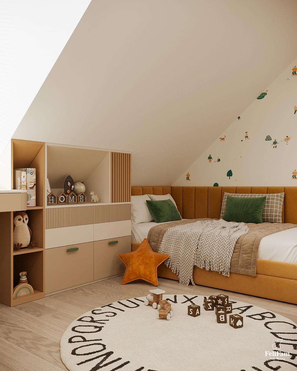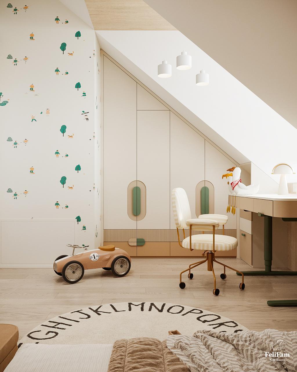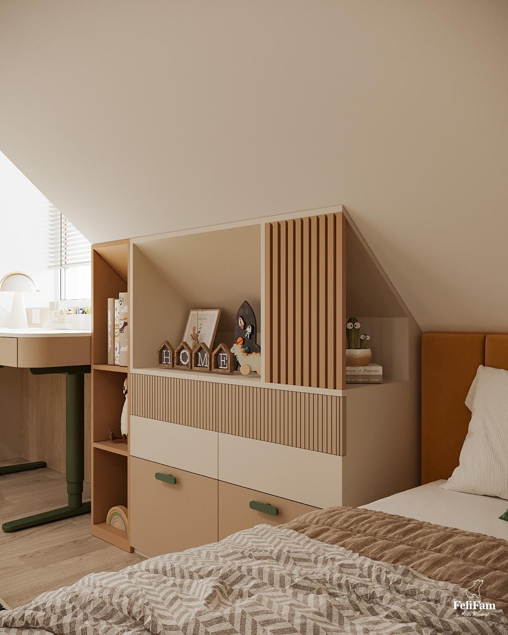 A room that adapts to the rhythm of childhood. A bright room for a boy with an original roof shape turned into a comfortable, functional space where each zone has its purpose. The light color palette visually expands the space, and smart storage helps keep order. The sleeping area creates an atmosphere of calm, the study nook by the window motivates learning, and the play area offers freedom of movement and imagination. This room grows with the child, remaining comfortable and inspiring every day.