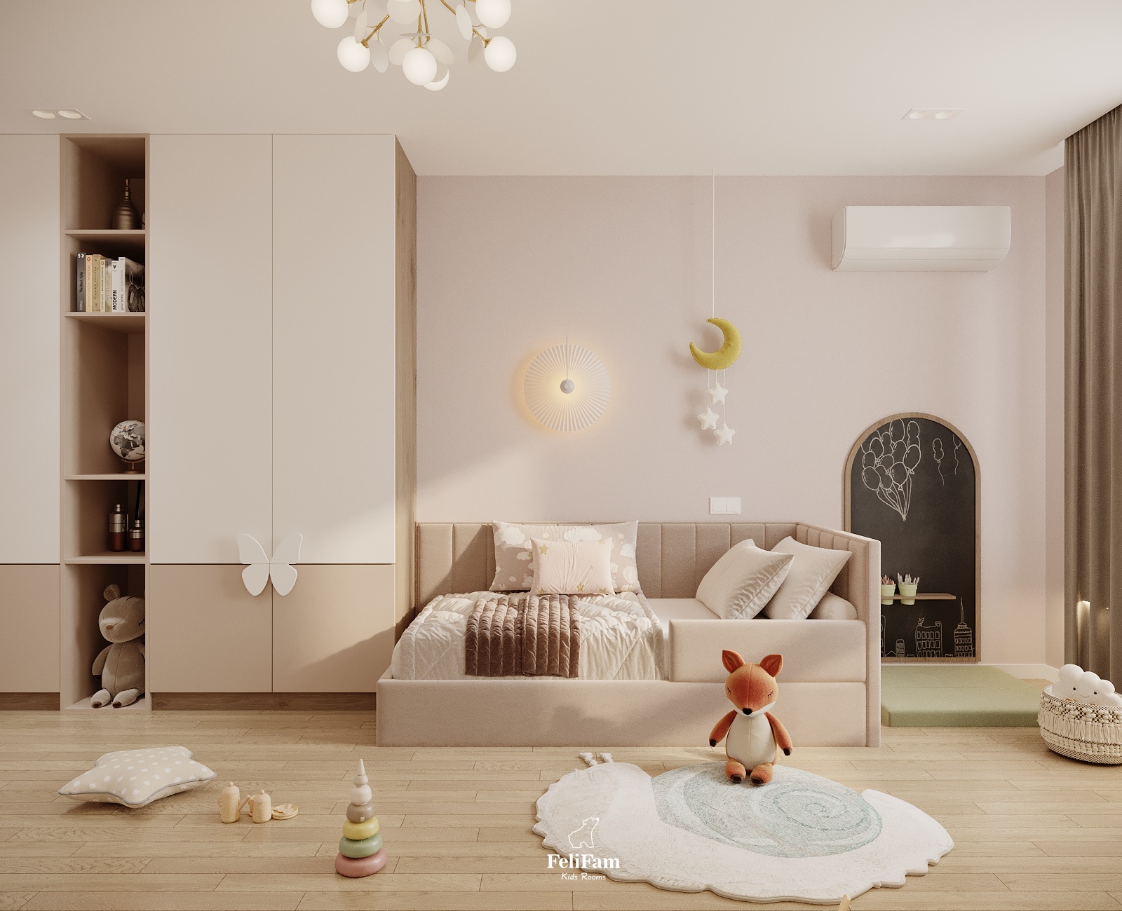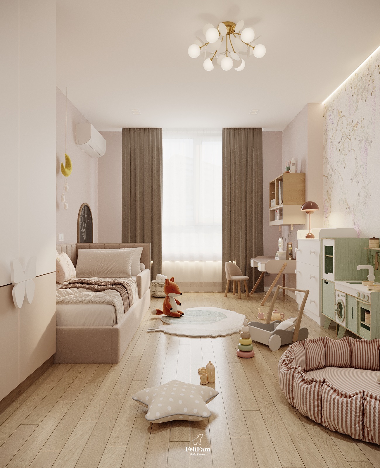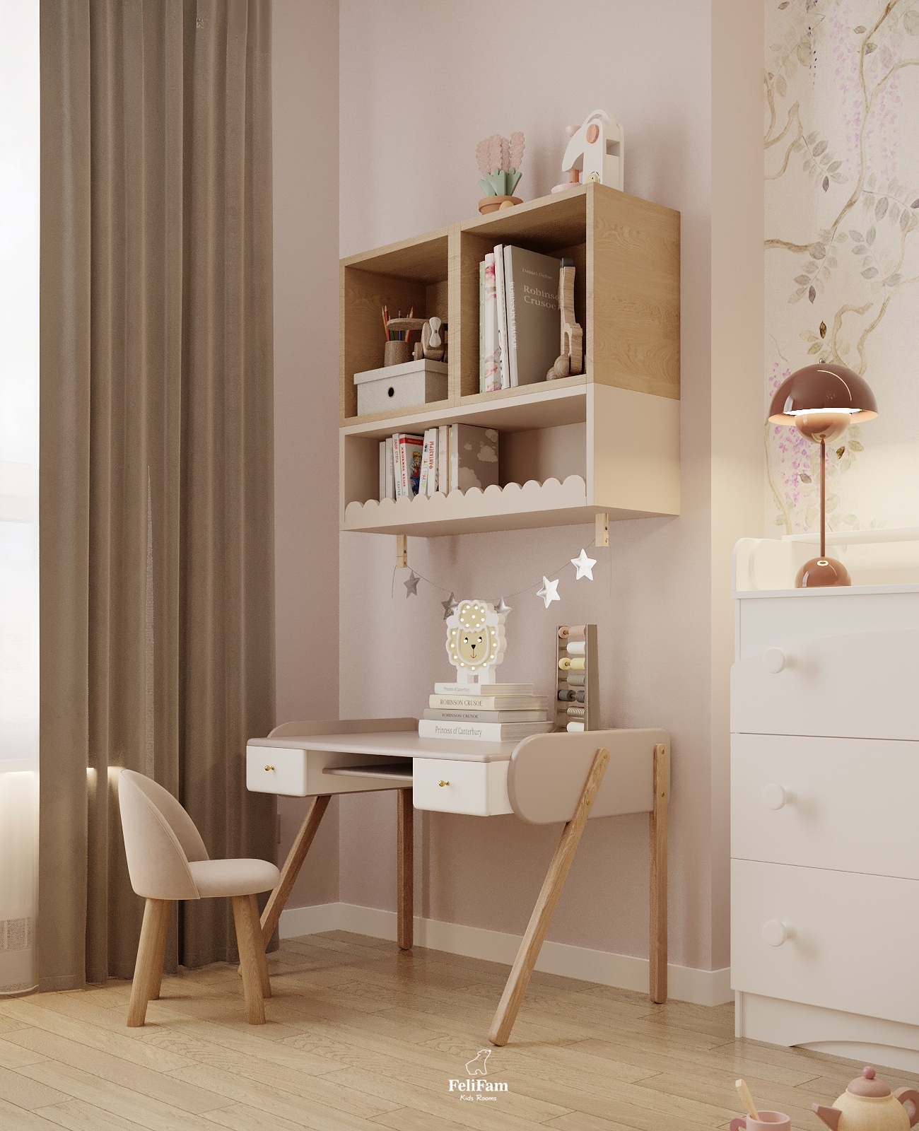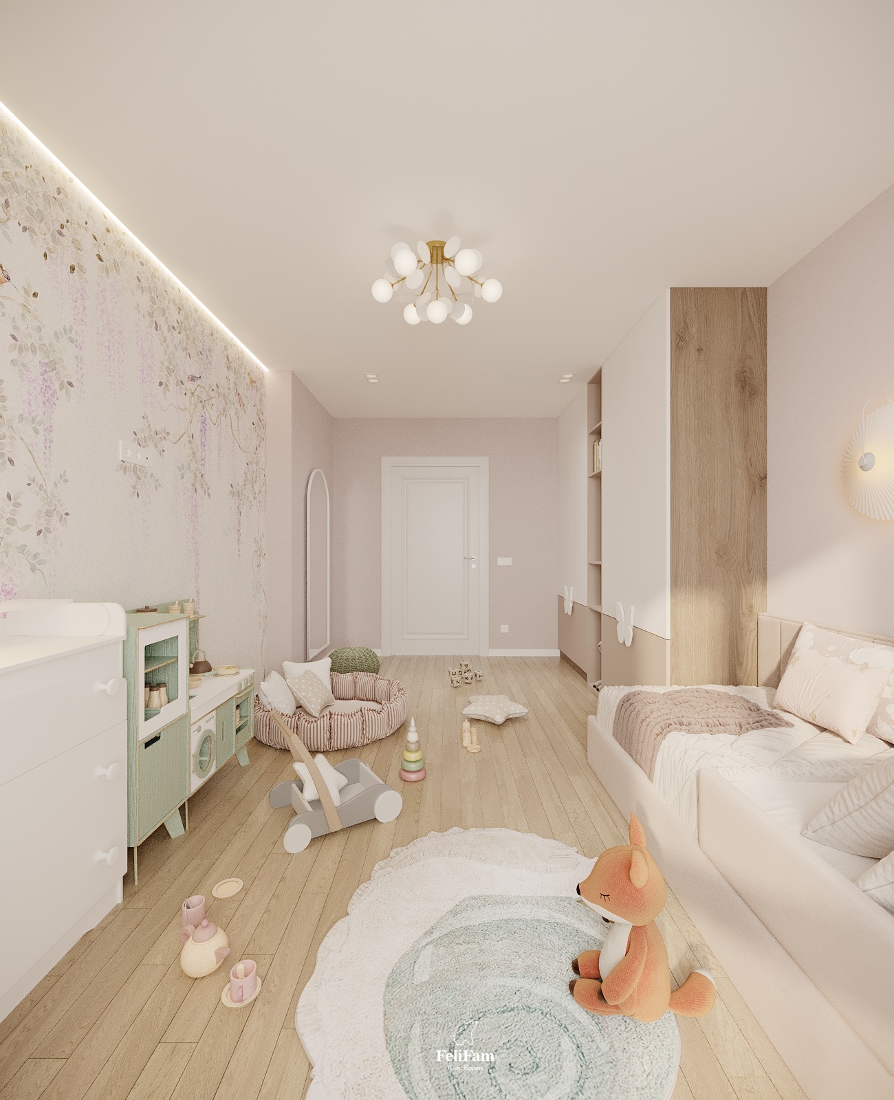 A space filled with light and dreams. This spacious room for a girl is decorated in light, soft tones creating an atmosphere of lightness, coziness, and harmony. Everything is thought through in detail: from ergonomic layout to decor details that inspire and bring comfort. The space is perfect for rest, study, and creativity — everything a child needs for a happy daily life.