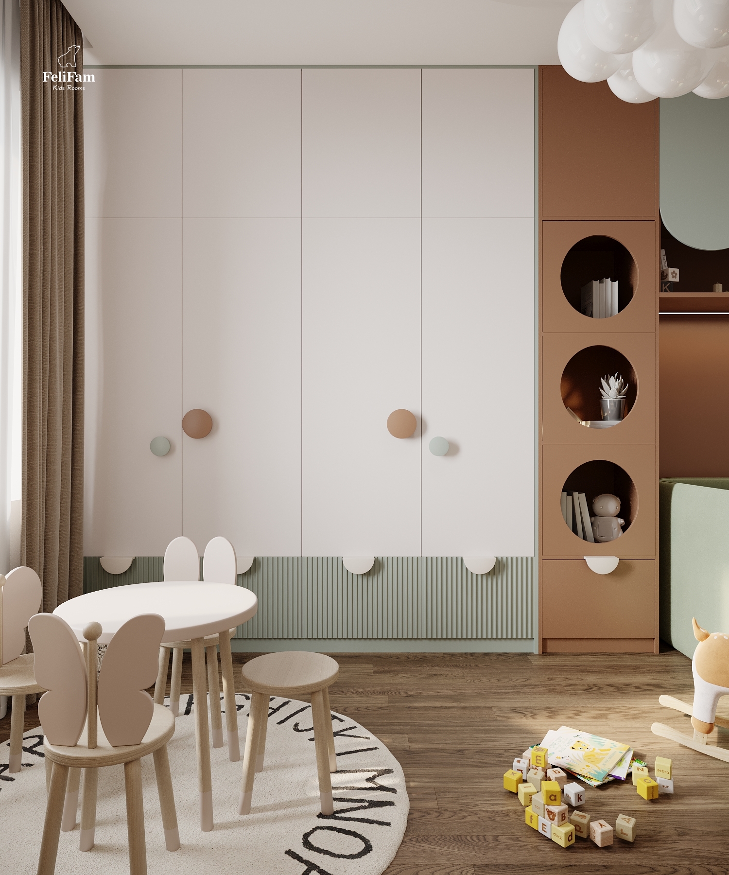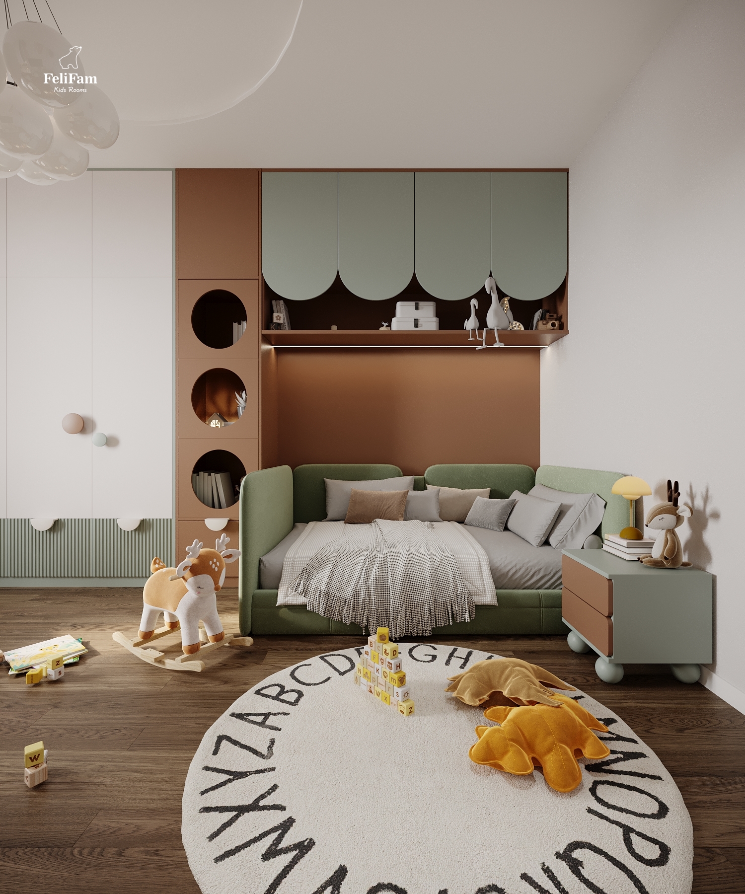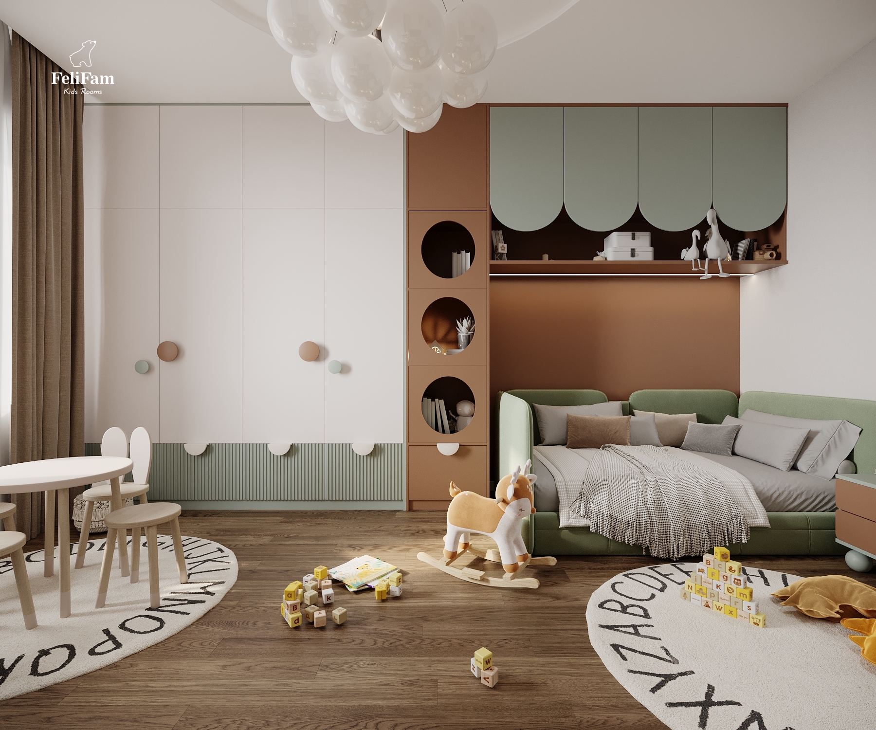 Warmth of color and atmosphere. This room for a girl is distinguished by the original combination of green and brown colors creating an incredibly warm and cozy atmosphere. Natural shades blend harmoniously, making the space not only stylish but also comfortable for rest, study, and play. Every element of the interior is designed to maintain a sense of calm and harmony where the child feels safe and inspired.